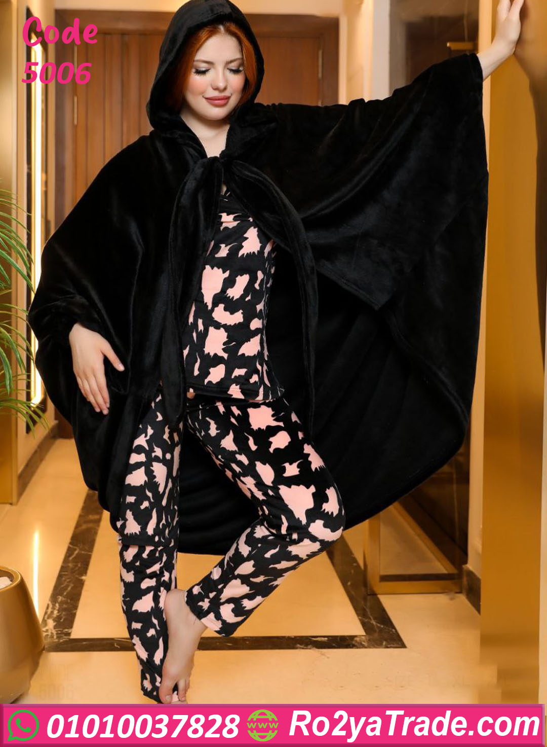 بيجامة شتوي فخمة جدًا من قطيفة ناعمة، بتصميم عصري ومريح جدًا، ومعاها كاب فرو دافي بيخلي الإطلالة أنيقة ومميزة 💕