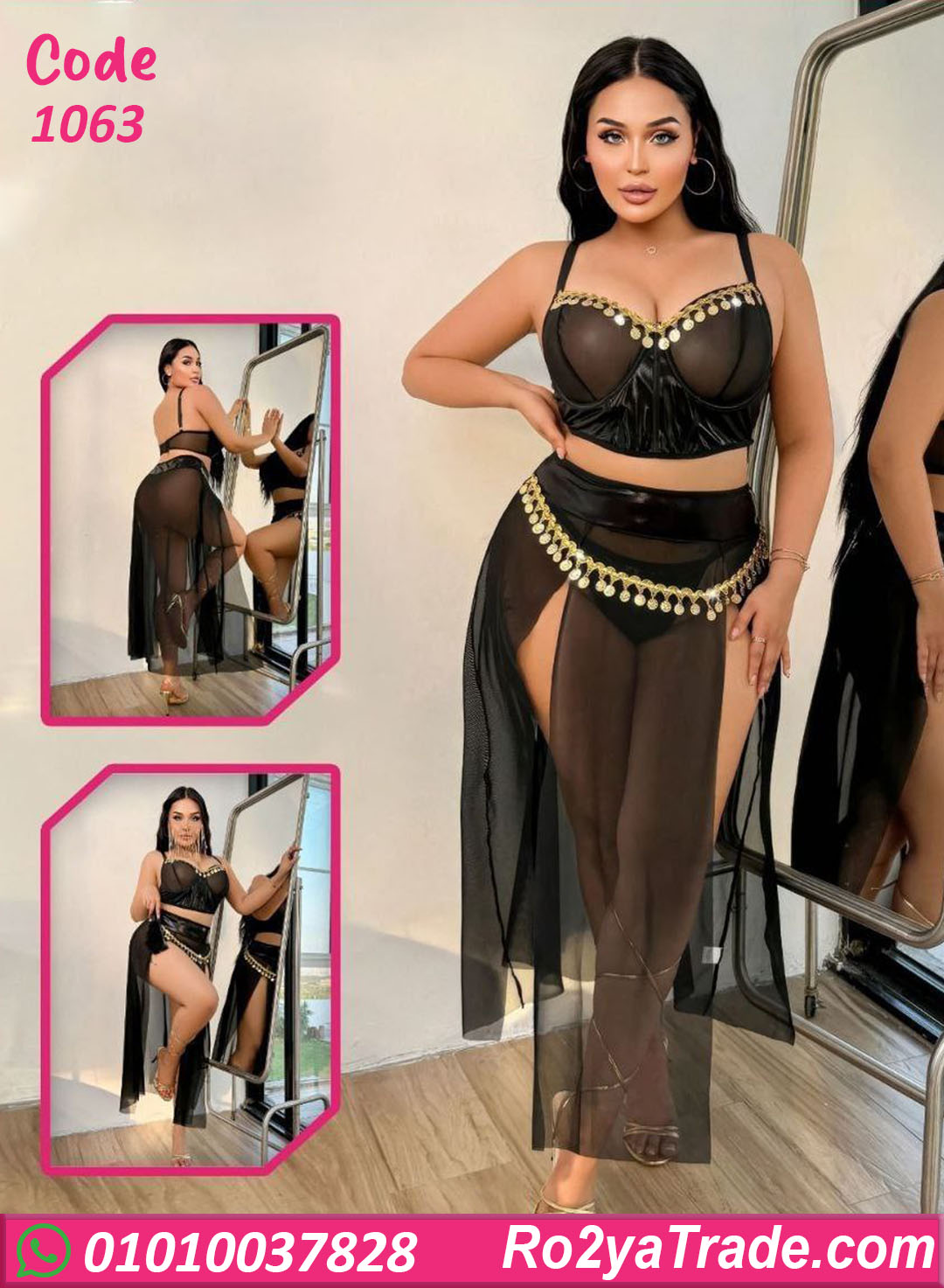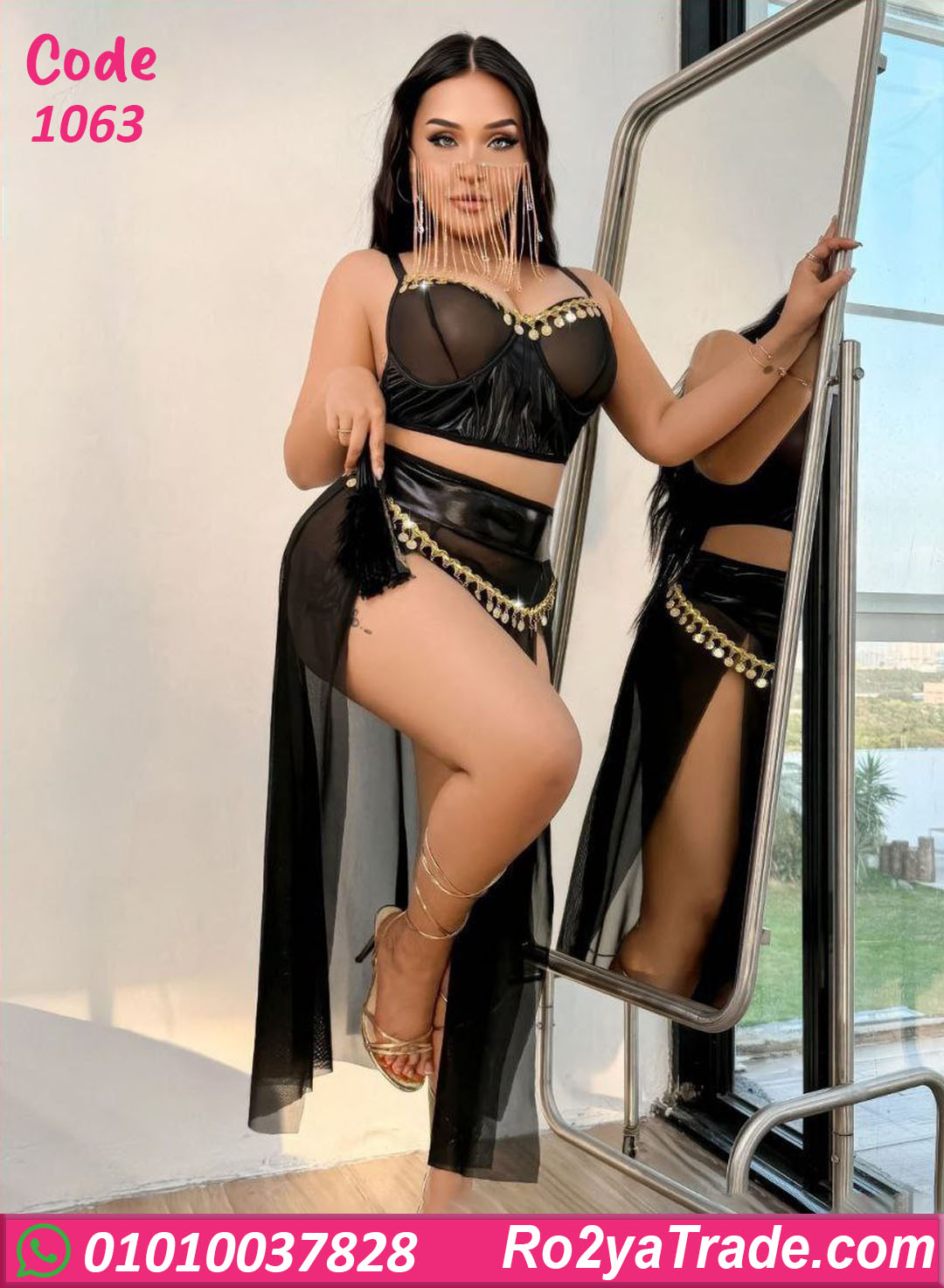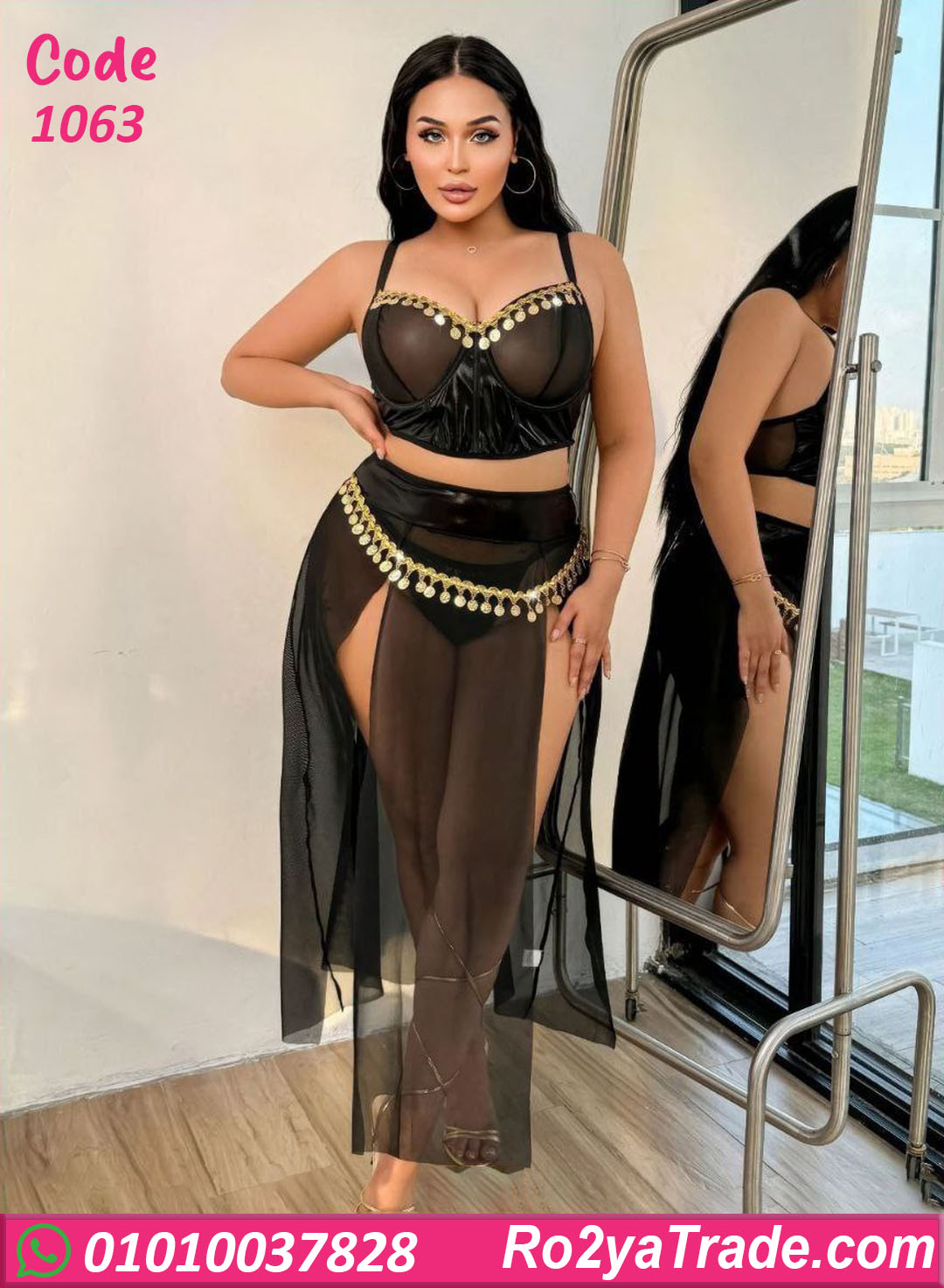 بدلة رقص شيك باللون الأسود بتصميم جريء وأنثوي مع تطريز ذهبي لامع، بتبرز القوام وبتدي إطلالة قوية وجذابة، مناسبة للعروض، السهرات، واللوك المميز.