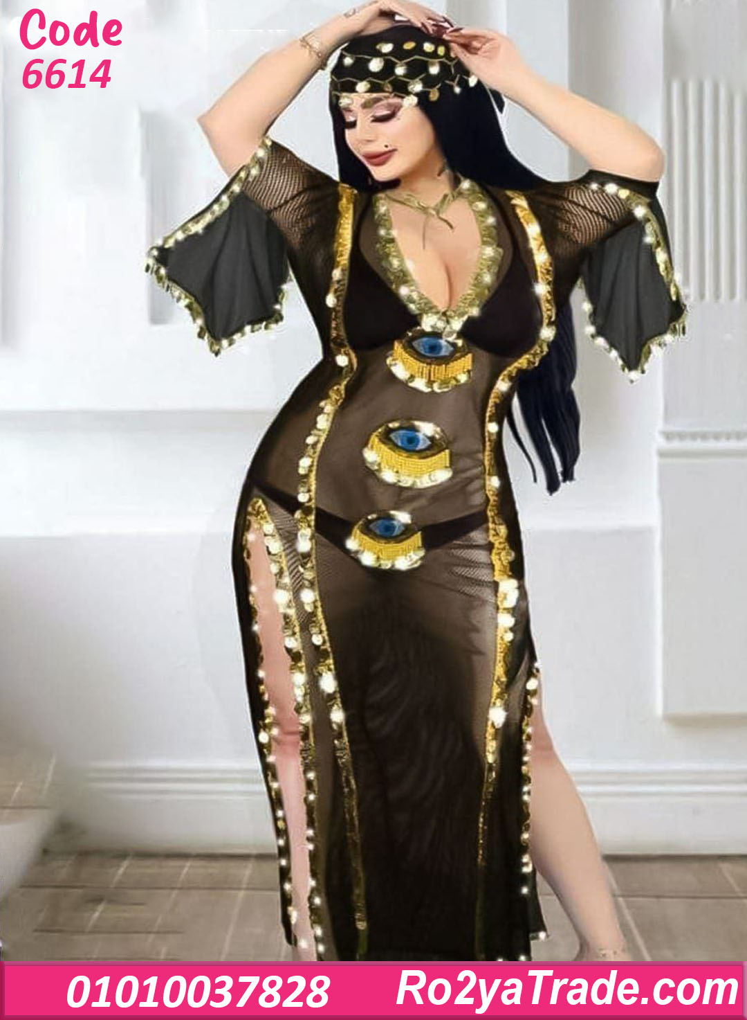 بدلة رقص شرقي شبك بتصميم العيون والخرز الذهبي – كود 6614