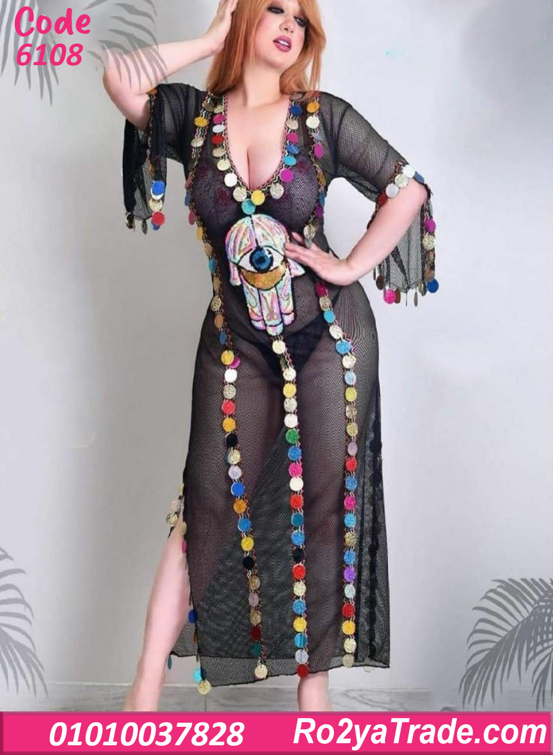 التصميم مصنوع من خامة شبك شفافة أنيقة مع تفاصيل خرز وعملات ملونة موزعة على التصميم بالكامل، وده بيدي حركة جميلة وصوت خفيف مع كل حركة أثناء الرقص.