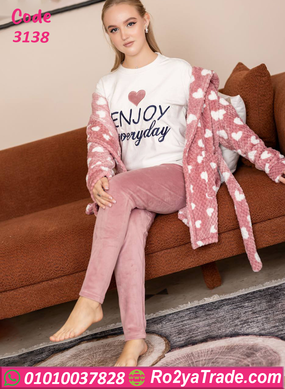 طقم شتوي قطيفة ناعم جدًا بروب دافي وبنطلون مريح تصميم قلوب شيك
