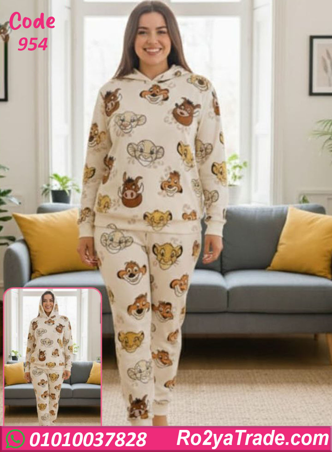 بيجامة نسائية شتوي مكوّنة من بلوزة بقبعة (هودي) كم طويل بقصة واسعة مريحة مع بنطلون قطيفة بنفس النقشة، الخامة تقيلة وبتحافظ على دفء الجسم، ومناسبة للبس اليومي من غير أي إحساس بالضيق. التصميم عملي وكيوت ويناسب كل ست بتحب الراحة مع شكل لطيف. كود 954