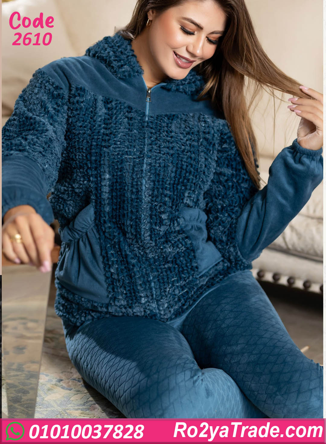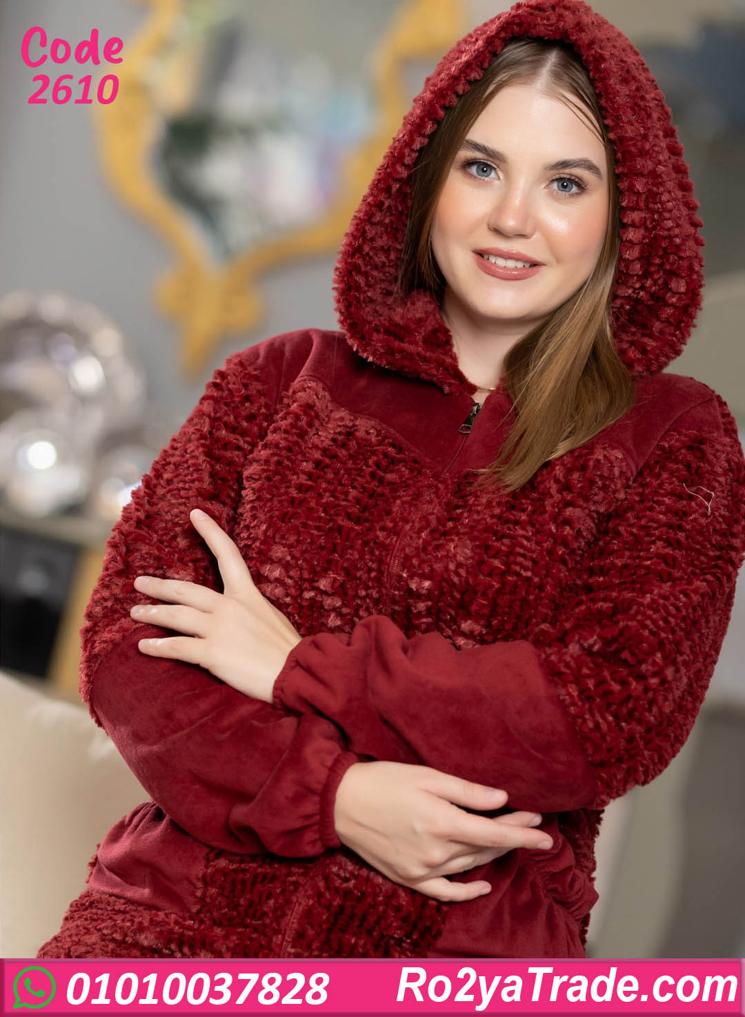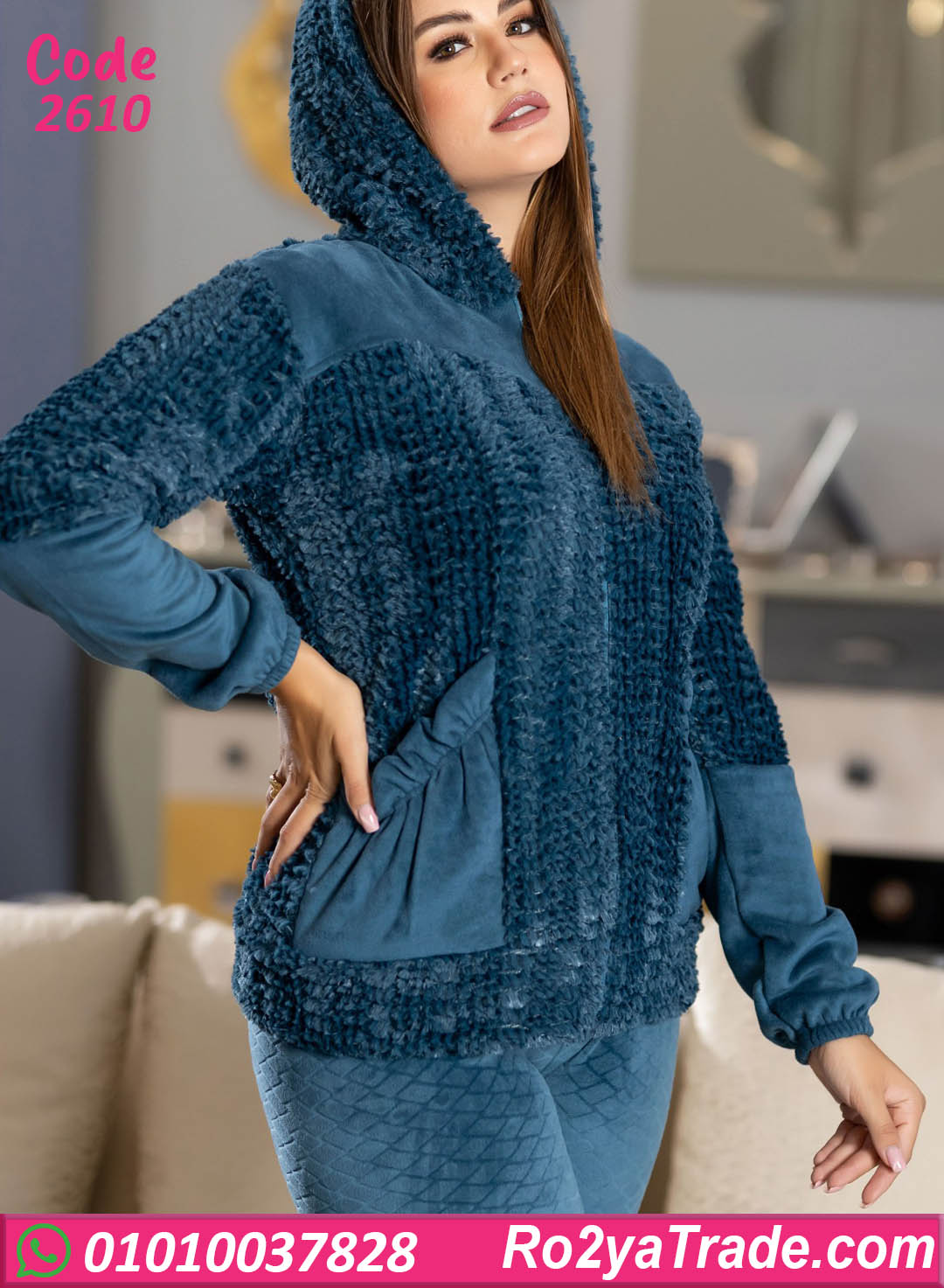 بيجامة نسائي شتوي مكونة من قطعتين، جاكيت فرو تقيل بغطاء رأس (هودي) وسوستة أمامية مع بنطلون مريح بنفس الخامة. التصميم عملي جدًا ومناسب للاستخدام اليومي، الخامة ناعمة على الجلد وبتحتفظ بالحرارة، وبتدي شكل أنيق ومودرن في نفس الوقت. اختيار ممتاز للستات اللي بتحب اللبس التقيل والدافي مع شكل شيك في الشتاء. كود 2610
