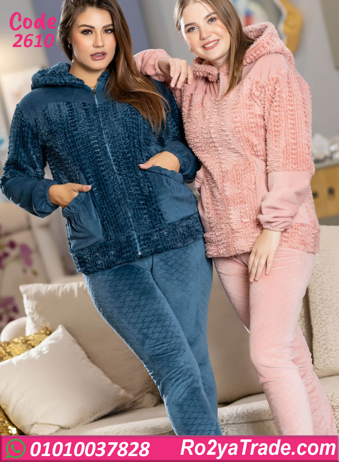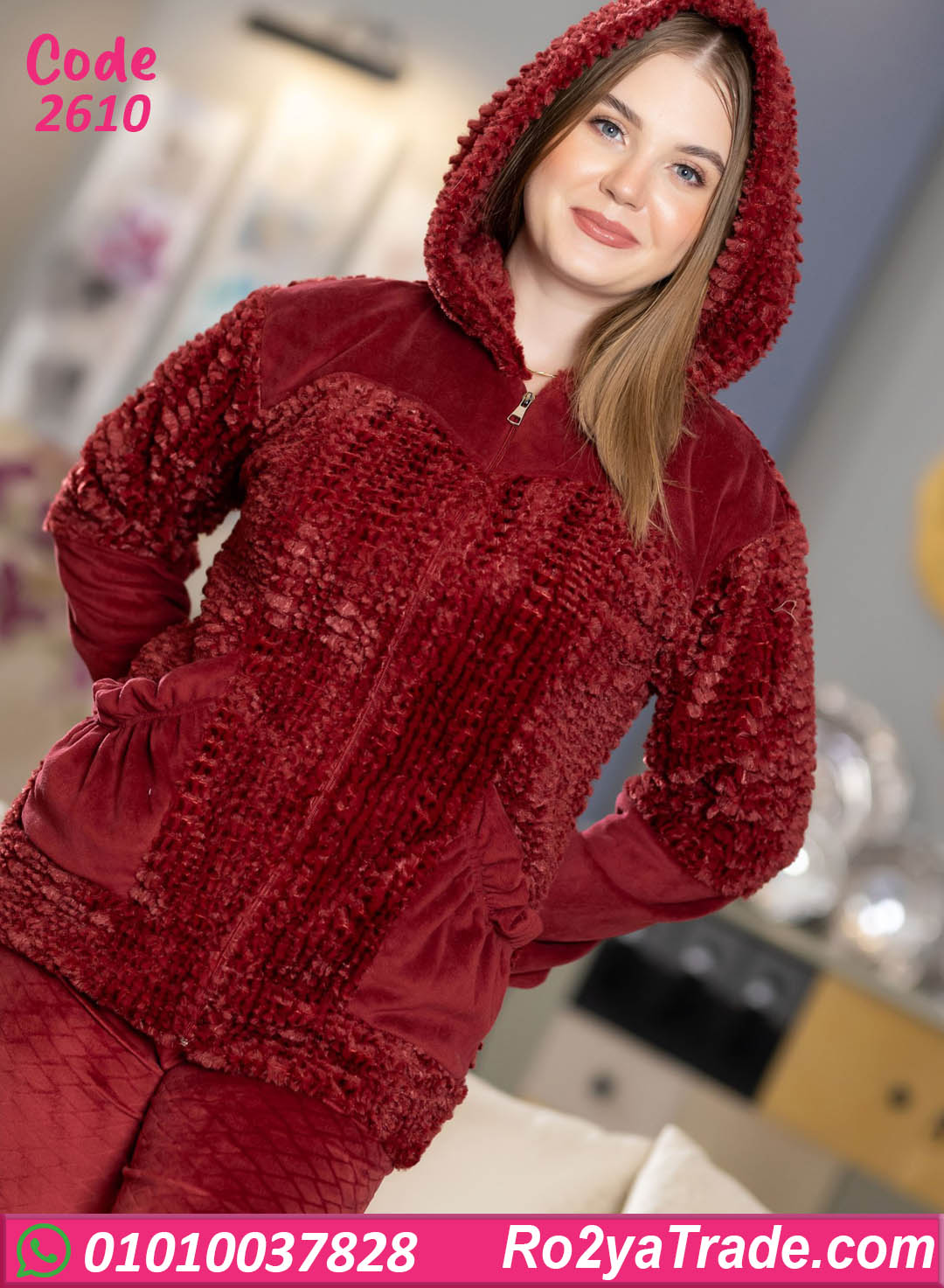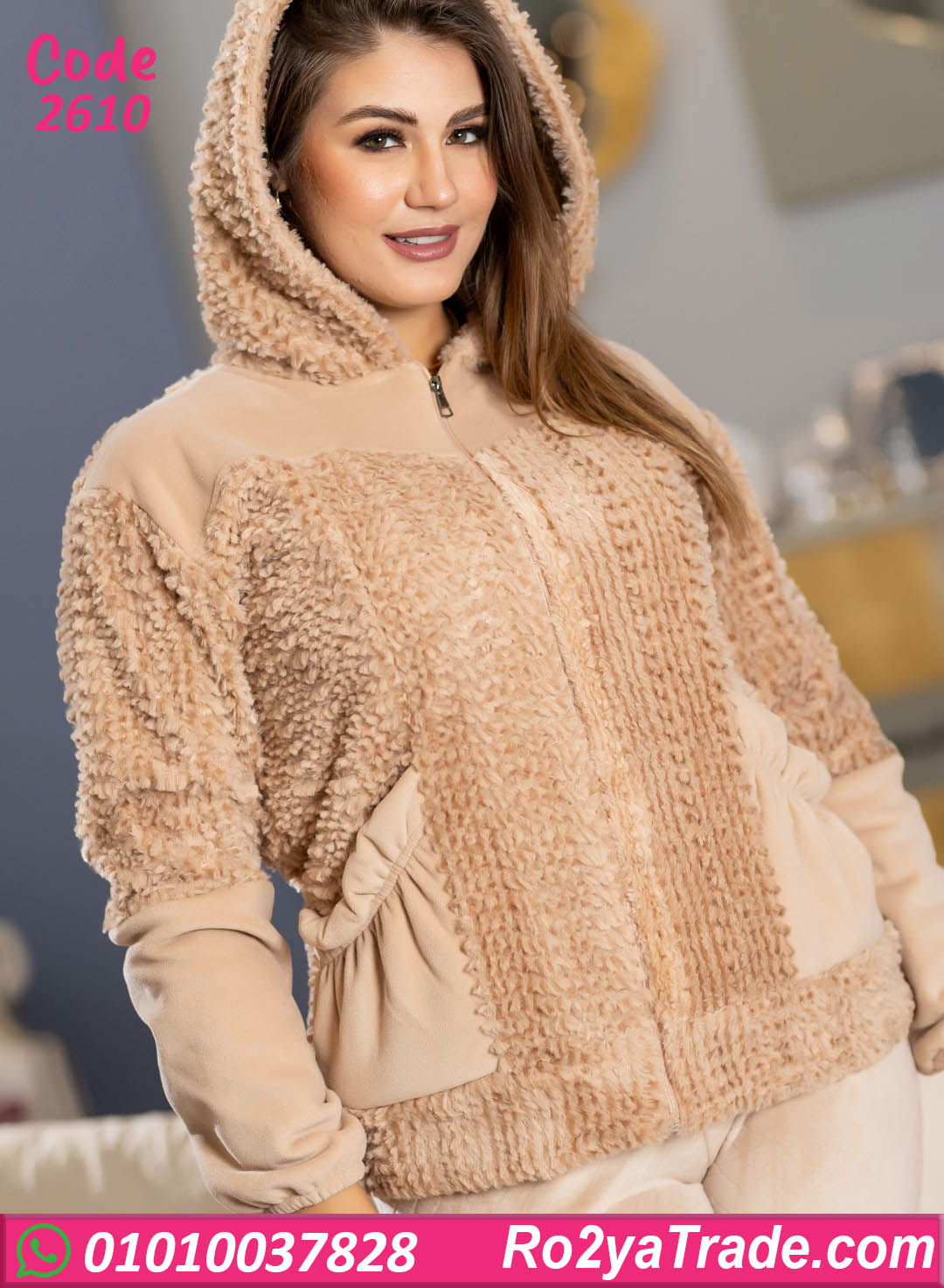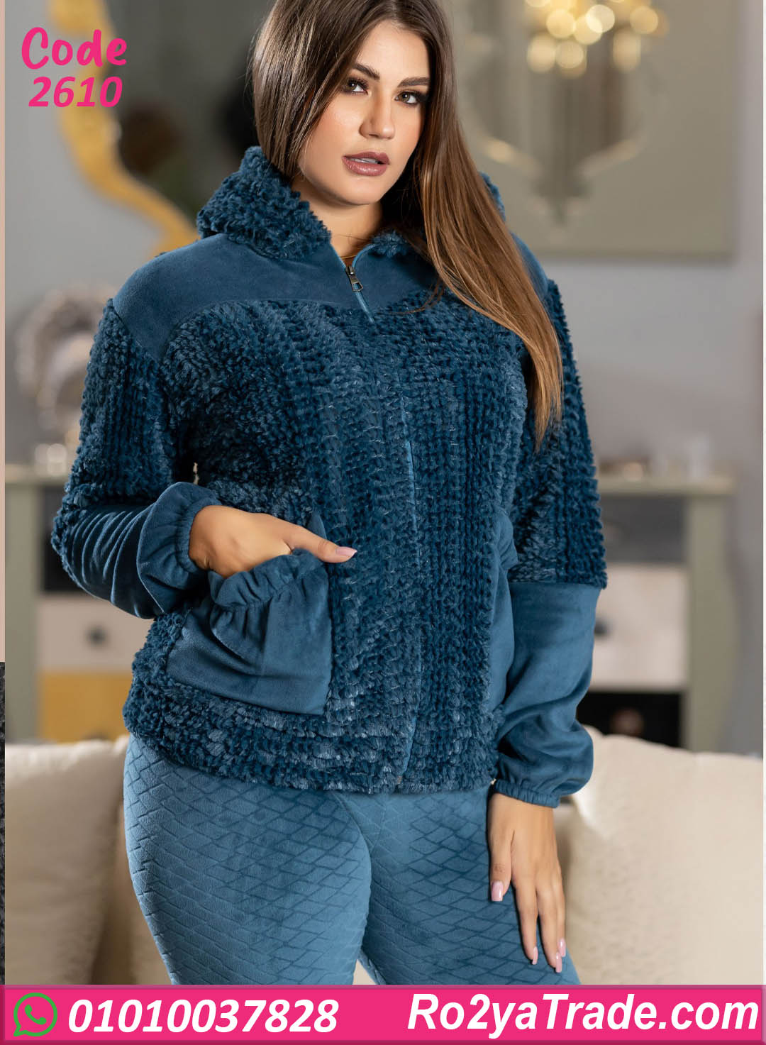 بيجامة نسائي شتوي مكونة من قطعتين، جاكيت فرو تقيل بغطاء رأس (هودي) وسوستة أمامية مع بنطلون مريح بنفس الخامة. التصميم عملي جدًا ومناسب للاستخدام اليومي، الخامة ناعمة على الجلد وبتحتفظ بالحرارة، وبتدي شكل أنيق ومودرن في نفس الوقت. اختيار ممتاز للستات اللي بتحب اللبس التقيل والدافي مع شكل شيك في الشتاء. كود 2610
