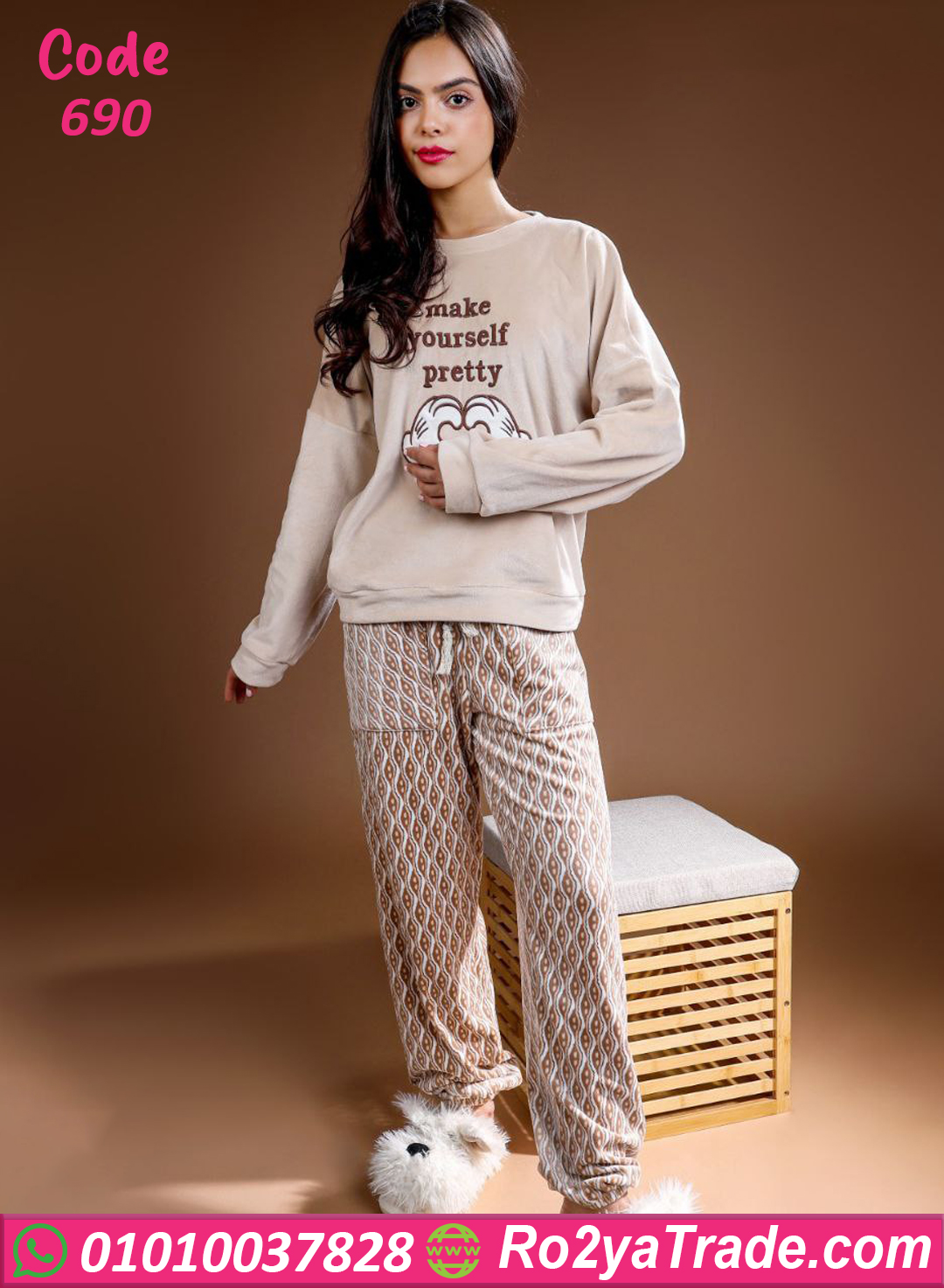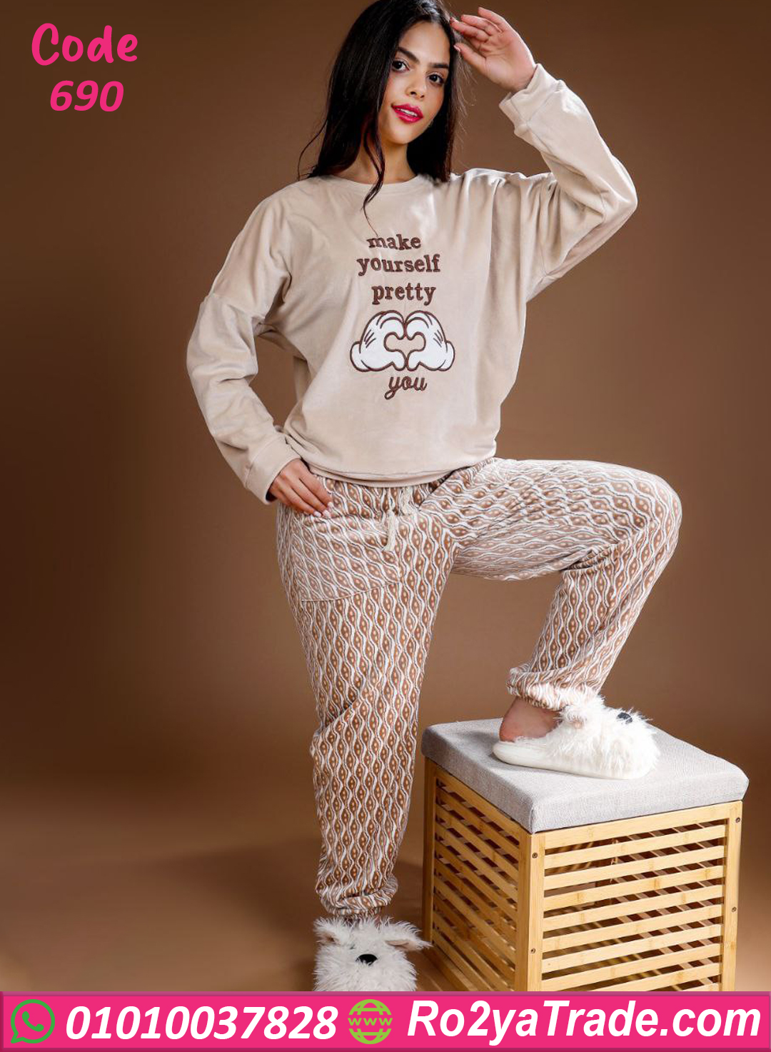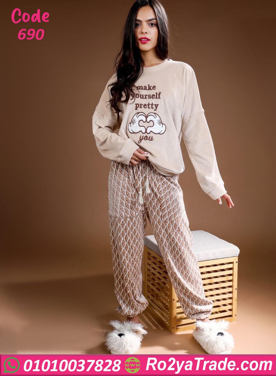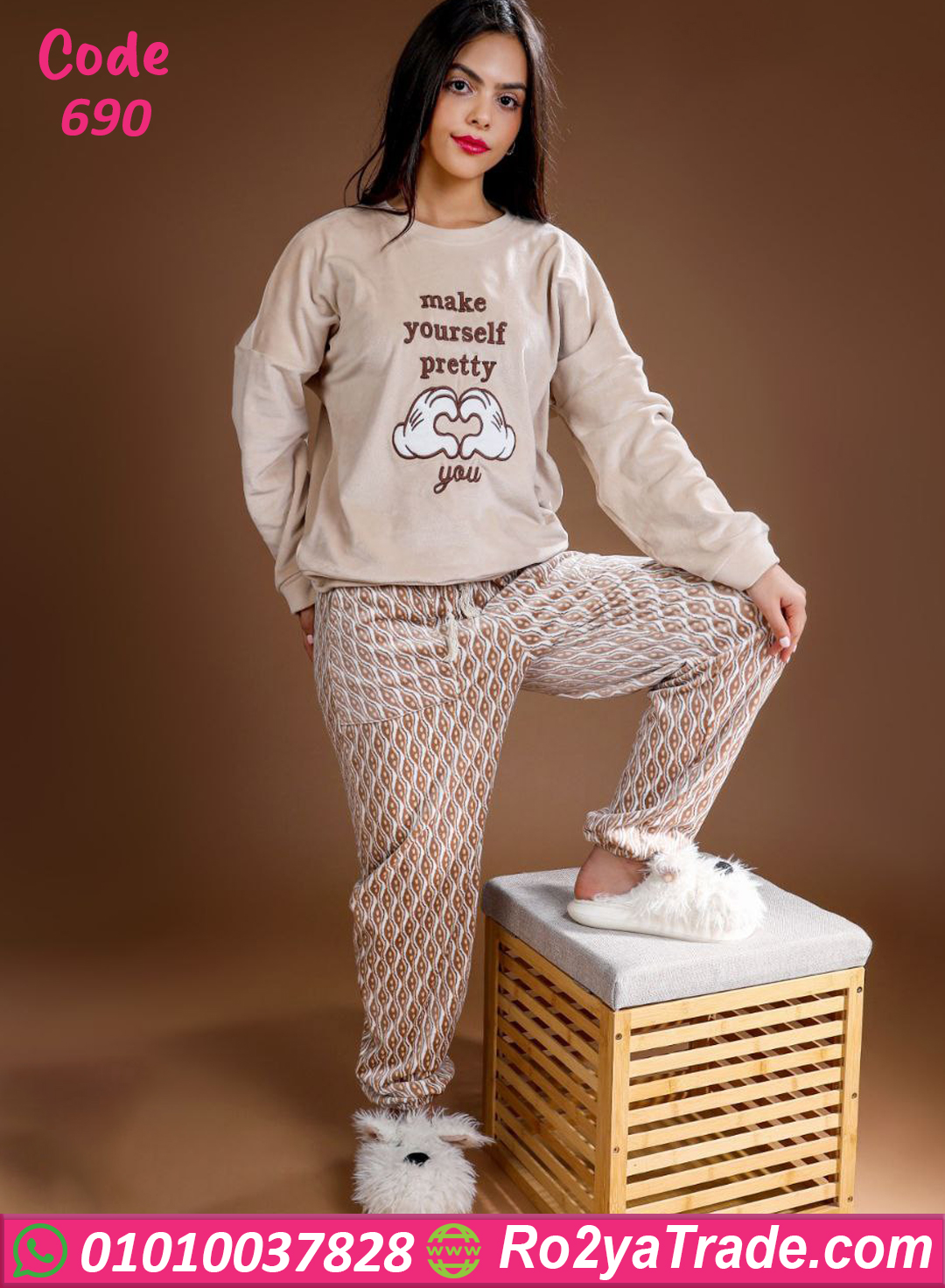 بيجامة حريمي شتوي شيك ومريحة، تصميم عصري برسمة لطيفة يدي إحساس بالراحة والأناقة، مناسبة للبيت والراحة اليومية، خامتها ناعمة ودافية جدًا تناسب أجواء الشتاء.