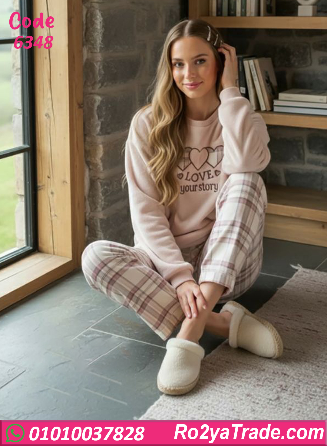 بيجامة حريمي شتوي دافية ومريحة، تصميم هادي وشيك باللون الوردي مع بنطلون كاروهات، مناسبة للبيت والنوم وبتدي إحساس بالراحة والدفا في أيام الشتاء.