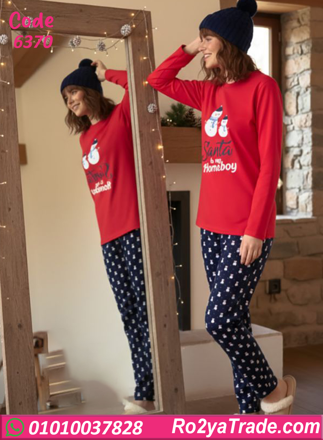 بيجامة حريمي شتوي دافية ومريحة، تصميم شتوي مبهج بطباعة رجل الثلج على الجزء العلوي، مناسبة للبيت والنوم وبتدي إحساس بالراحة والدفا في أيام الشتاء.