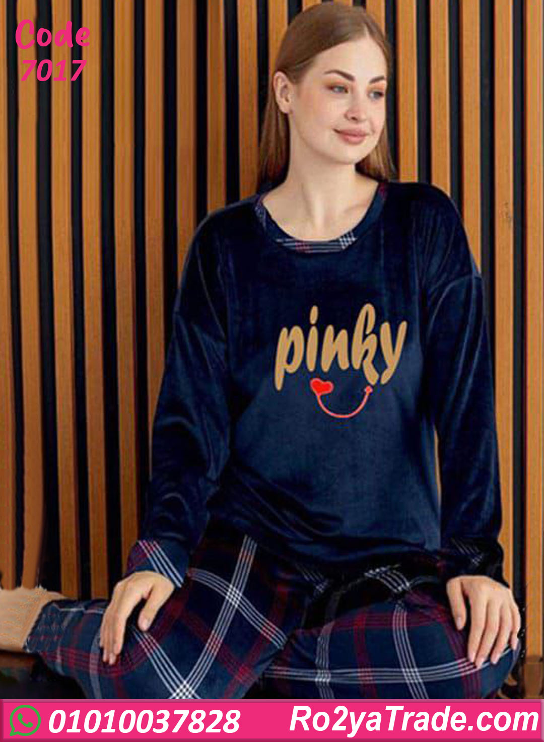 بيجامة حريمي شتوي قطعتين بتصميم شيك وعصري، مكوّنة من بلوزة قطيفة ناعمة بطباعة Pinky وبنطلون كاروهات أنيق، خامة دافية ومريحة جدًا، مناسبة للبيت وأوقات الراحة في الشتا.