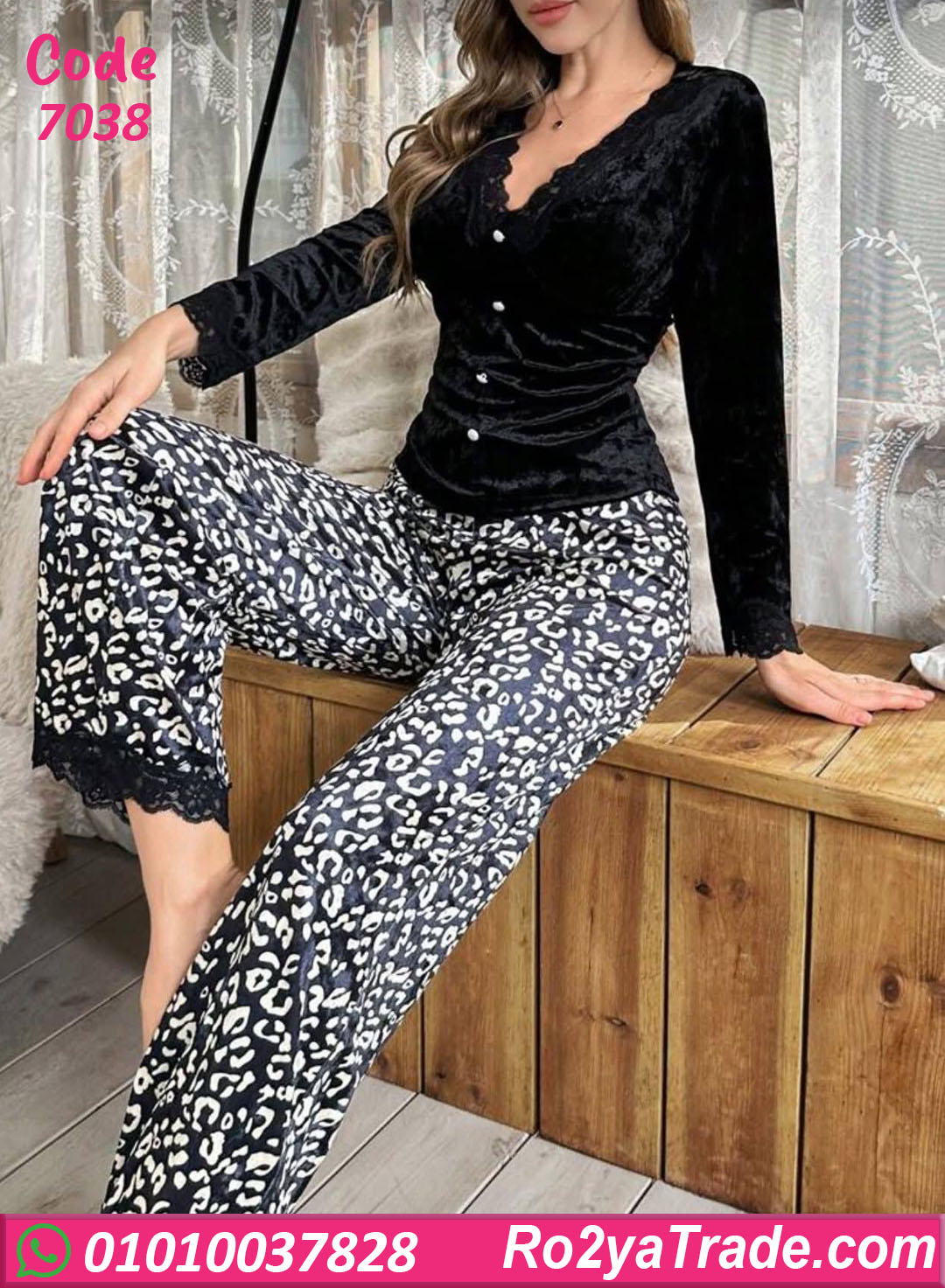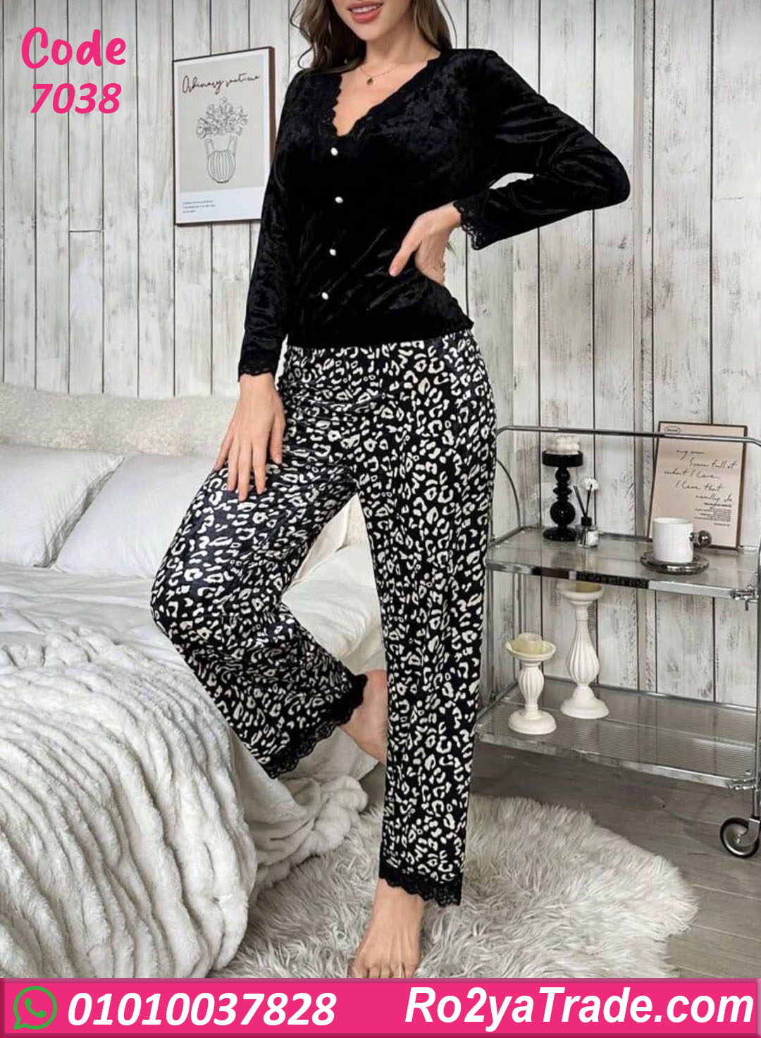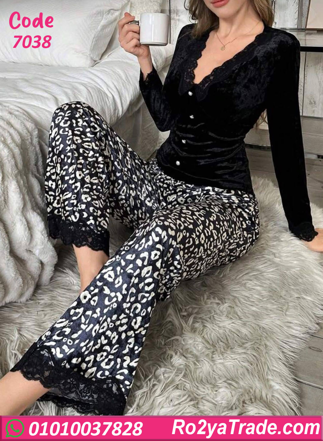 بيجامة حريمي شتوي كود 7038 اختيار مثالي لكل ست بتحب الشياكة مع الراحة. البلوزة القطيفة خامتها ناعمة وبتدي إحساس دافي ومريح، مع دانتيل أنيق يضيف لمسة أنثوية راقية.