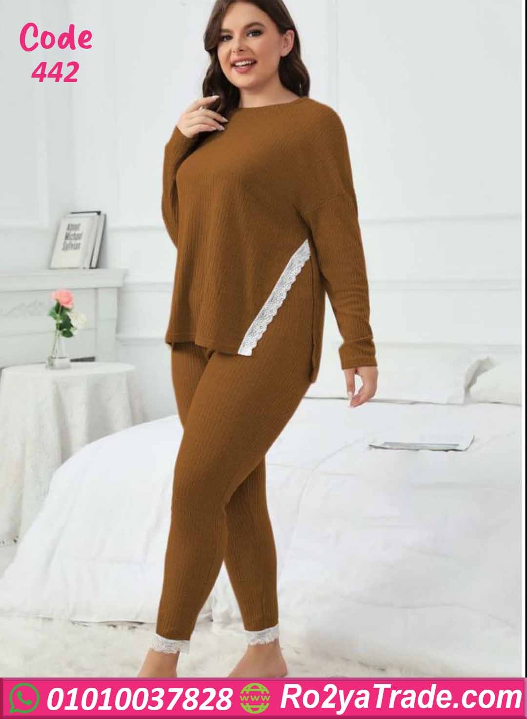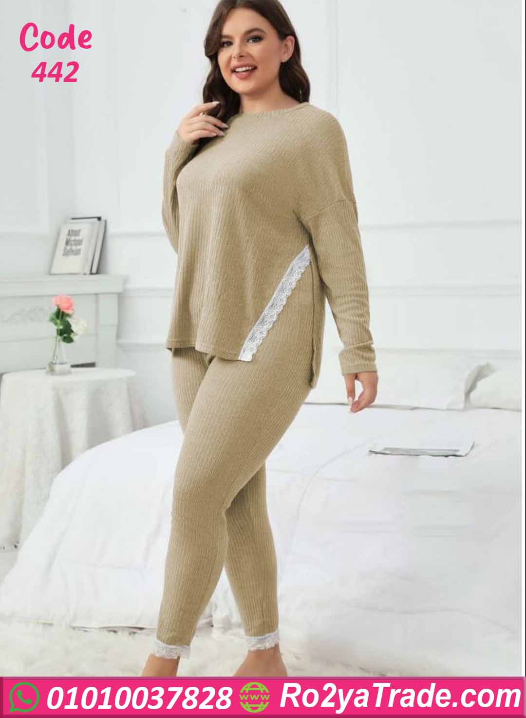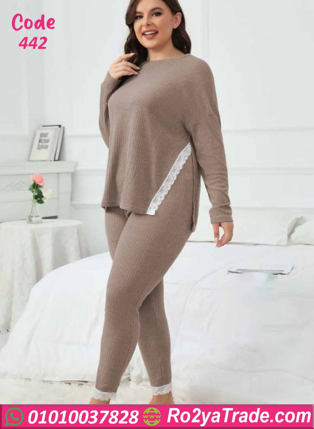 بيجامة كود 442 من ماركة Big Ladies بتصميم عصري مناسب للمقاسات الكبيرة، حيث تجمع بين الراحة والأناقة بفضل الخامة المضلعة الناعمة والتفاصيل الأنثوية الرقيقة.