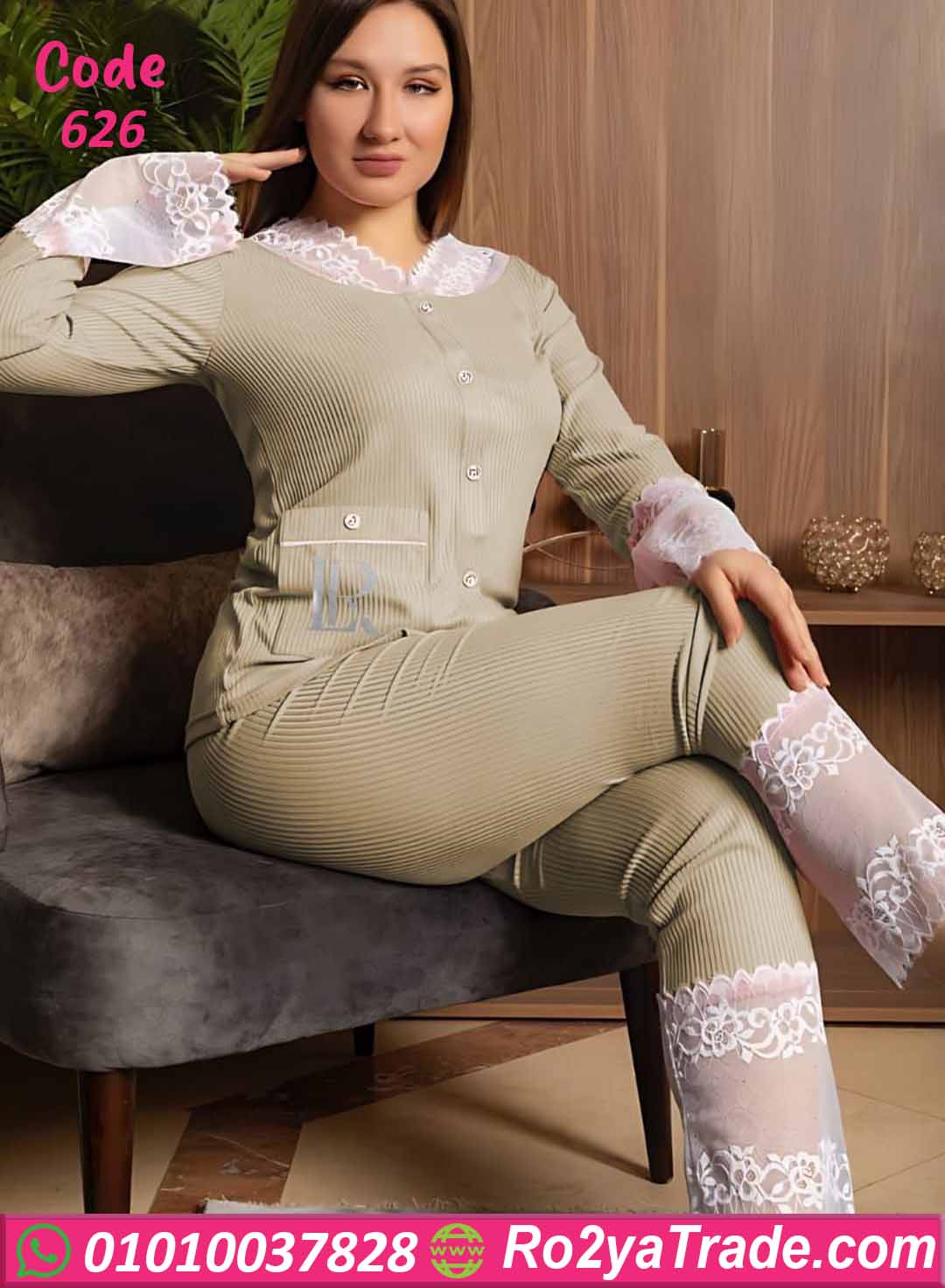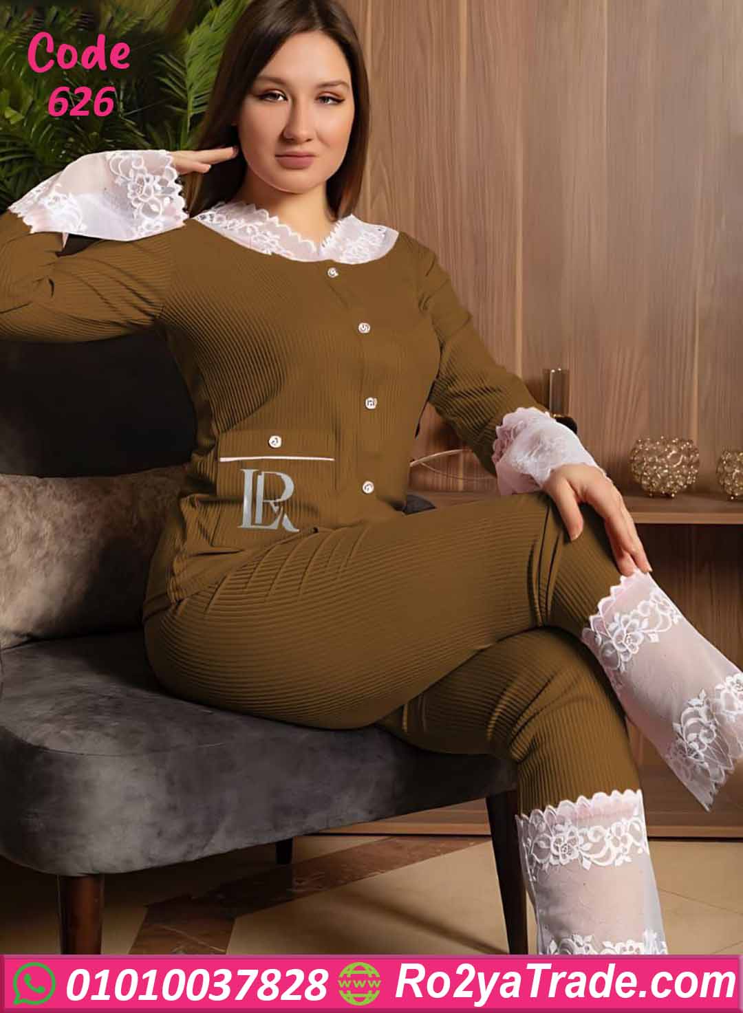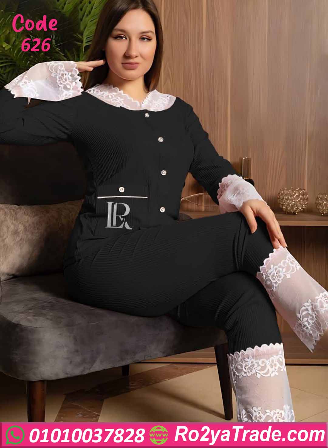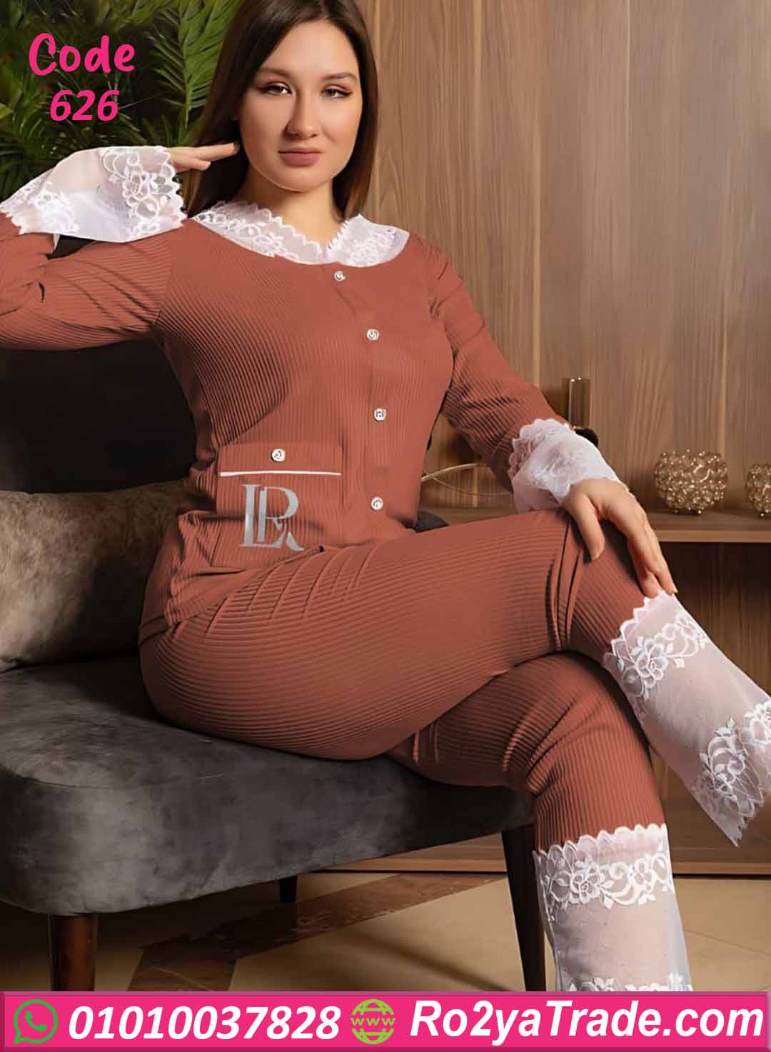 بيجامة كود 626 من ماركة Laroj بتصميم أنيق يجمع بين الراحة والفخامة، حيث تأتي بخامة مضلعة مرنة مع تفاصيل دانتيل ناعمة تضيف لمسة أنوثة جذابة، مما يجعلها اختيارًا مثاليًا للاستخدام اليومي داخل المنزل.