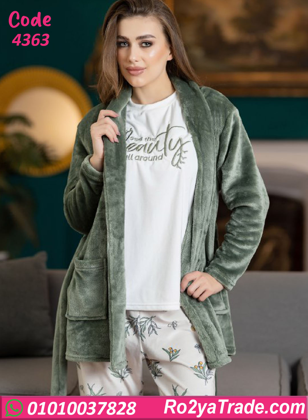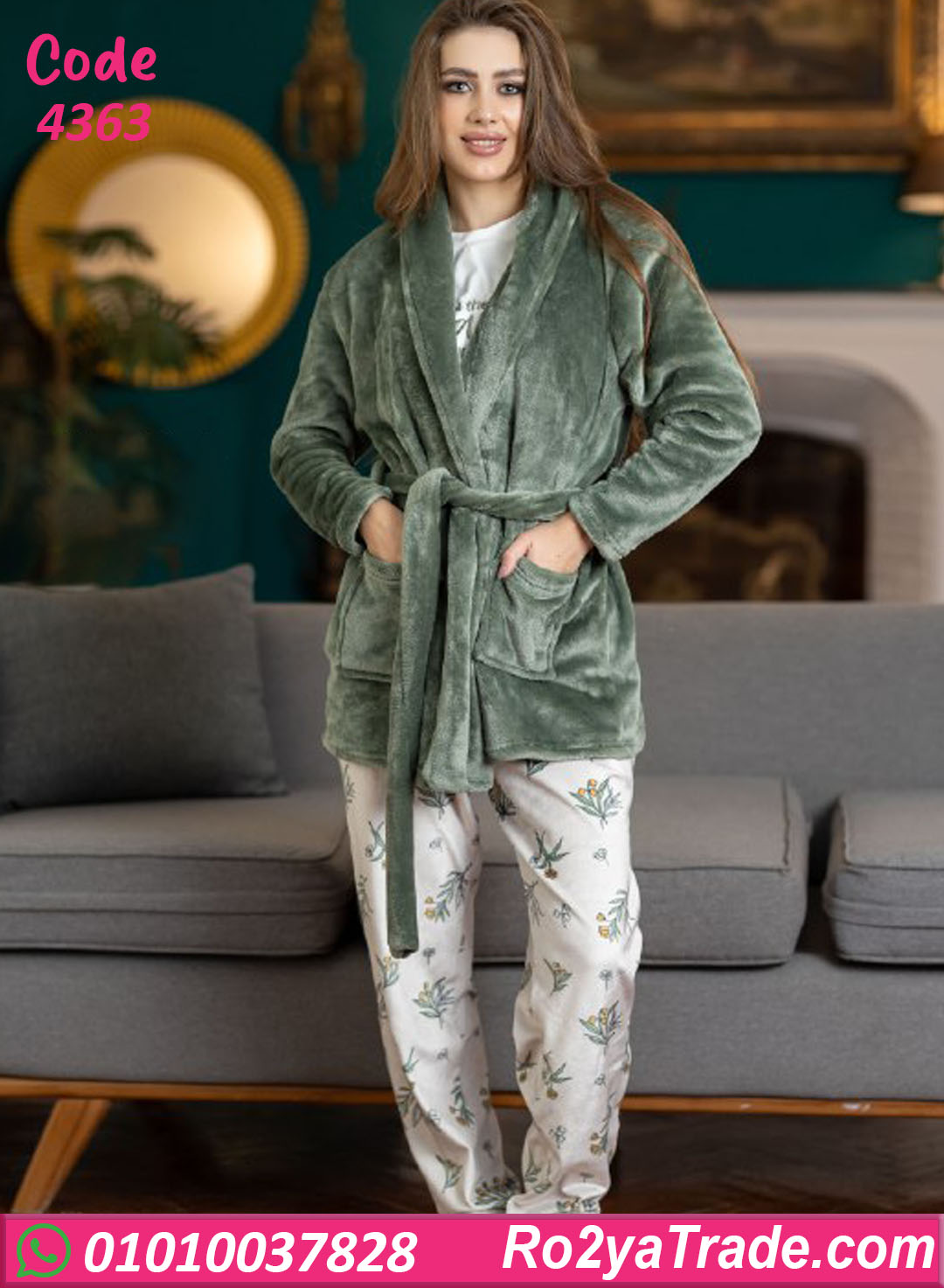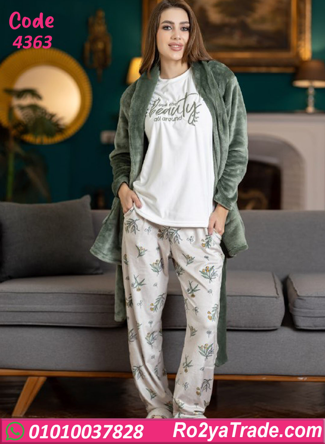 بيجامة حريمي شتوي مع روب كود 4363 اختيار مثالي لكل ست بتدور على الدفا والراحة مع شكل أنيق في نفس الوقت. الخامة الناعمة بتدي إحساس مريح على الجسم وبتساعد في الاحتفاظ بالدفا من غير إحساس بالتقل