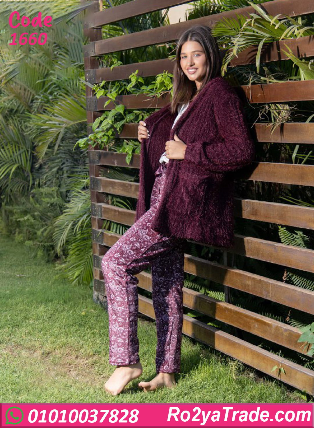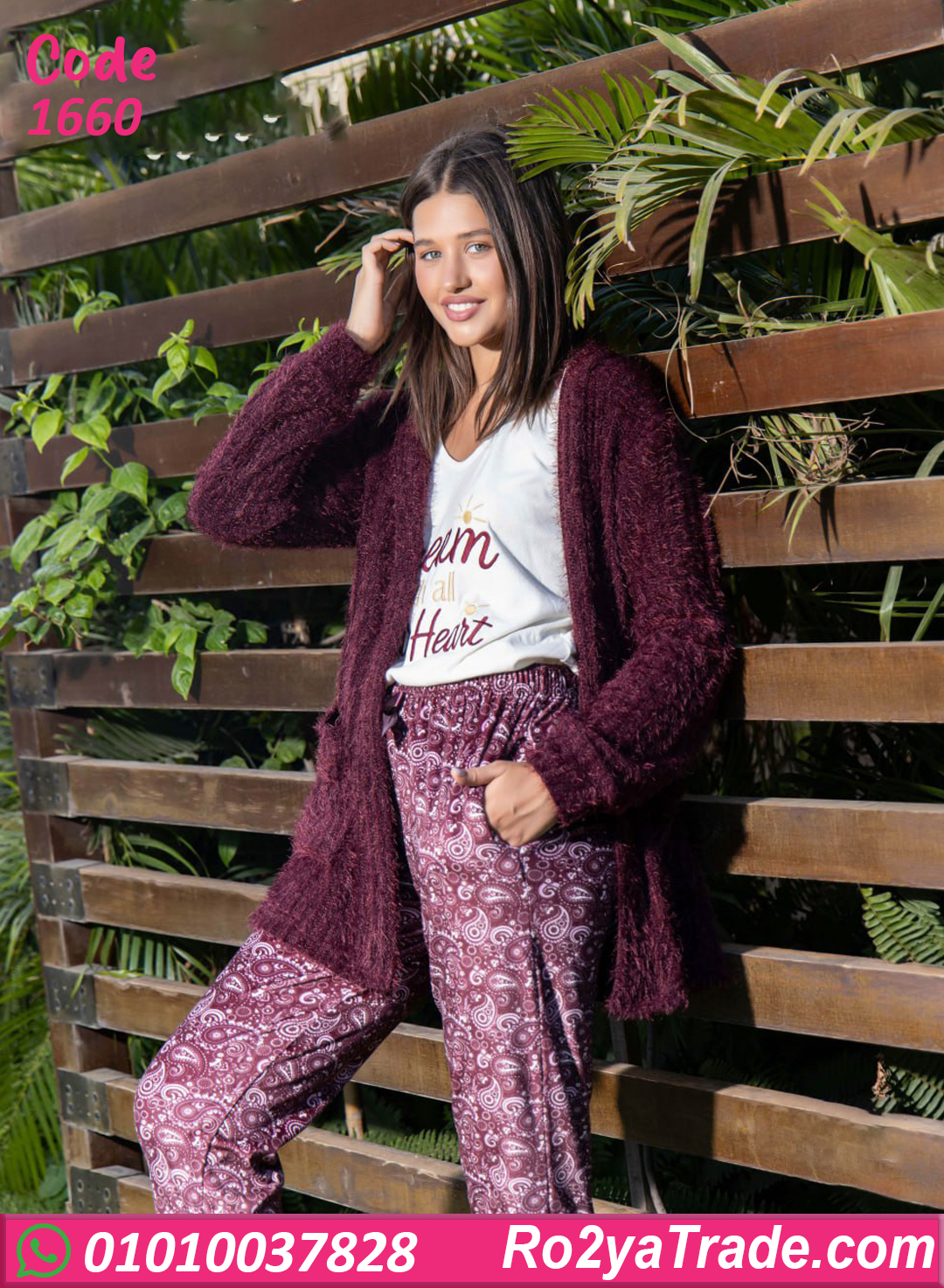 بيجامة حريمي شتوي 3 قطع كود 1660 اختيار مثالي لكل ست بتحب الدفا والراحة مع شكل أنيق ومميز. الطقم مكوّن من تيشيرت مريح بتصميم بسيط، وبنطلون بنقشة شيك، ومعاهم روب قطيفة دافي بيدي إحساس عالي بالدفا والشياكة في نفس الوقت.