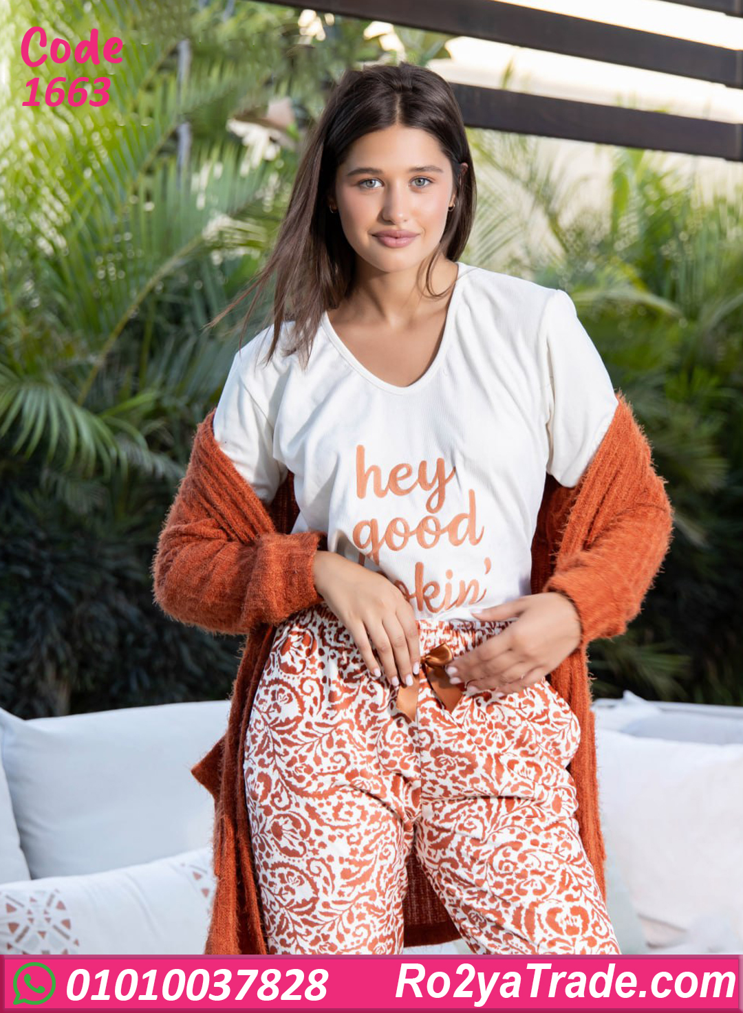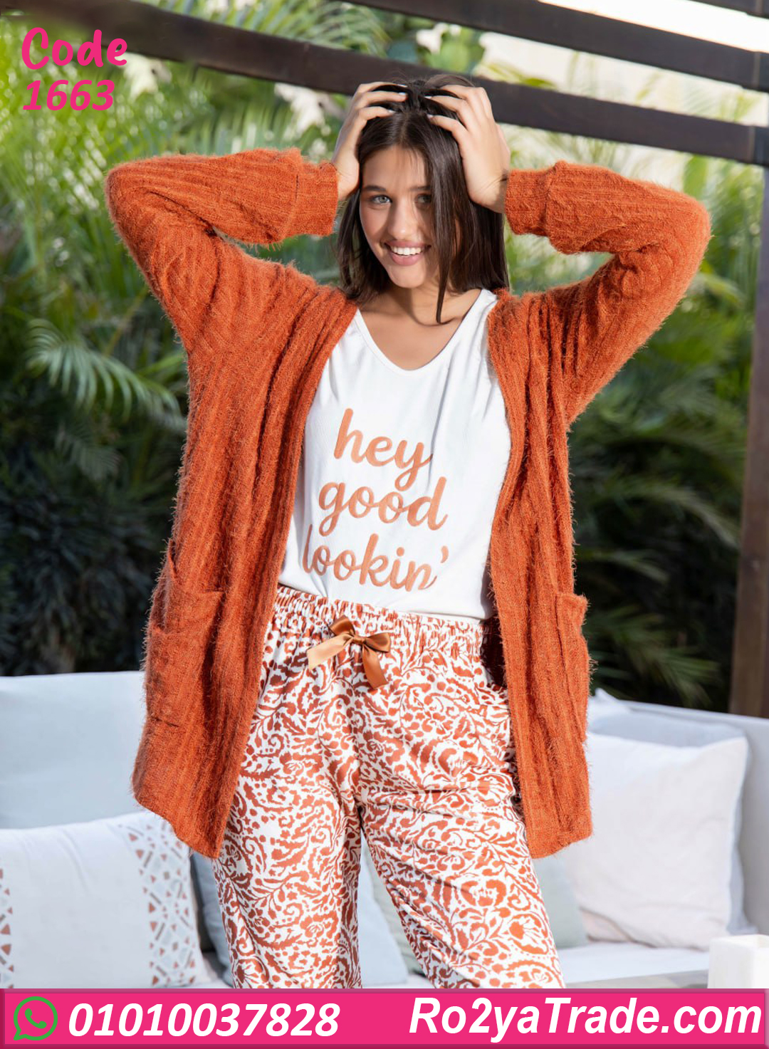 بيجامة حريمي شتوي 3 قطع كود 1663 اختيار مثالي لكل ست بتحب الدفا والراحة مع شكل شيك وعصري. الطقم مكوّن من تيشيرت بتصميم لطيف، وبنطلون بنقشة أنيقة ومريحة، ومعاهم روب قطيفة دافي بيدي إحساس عالي بالدفا وشكل شيك جدًا.