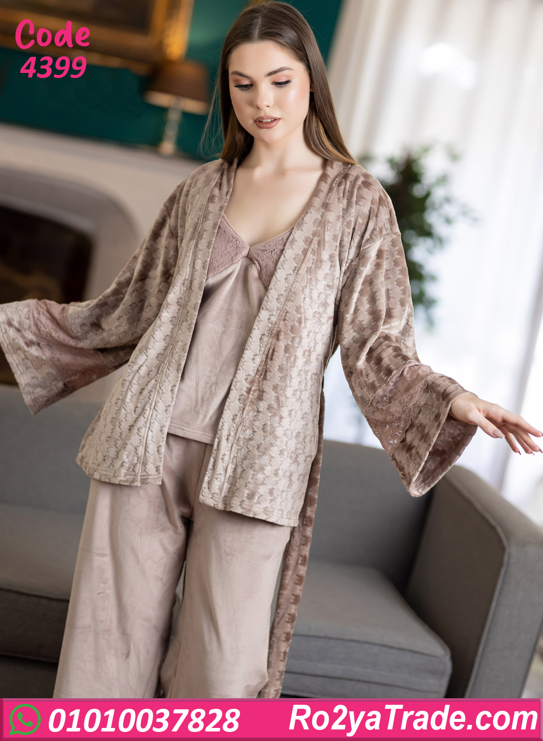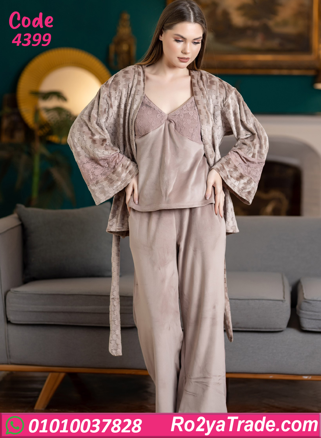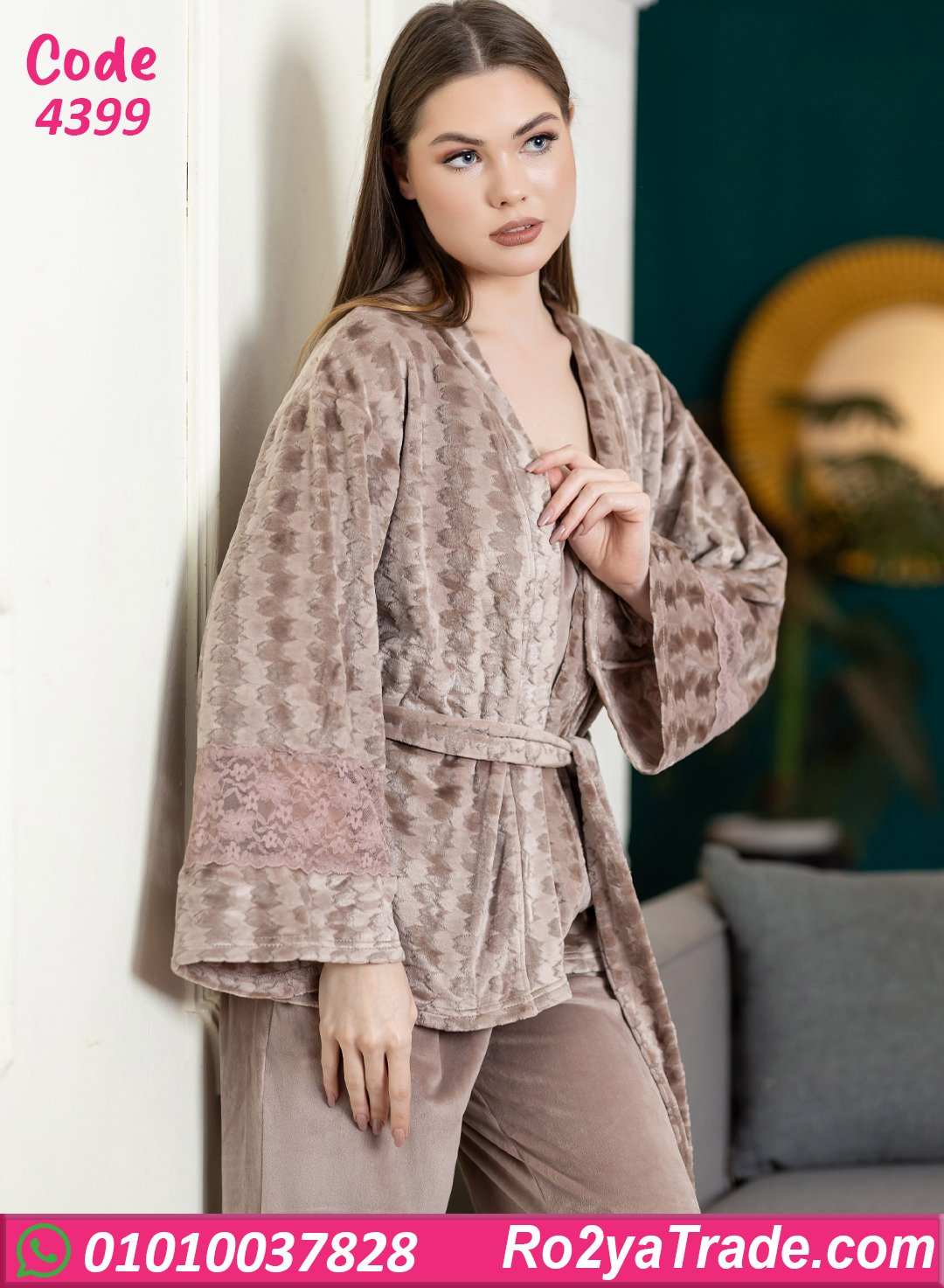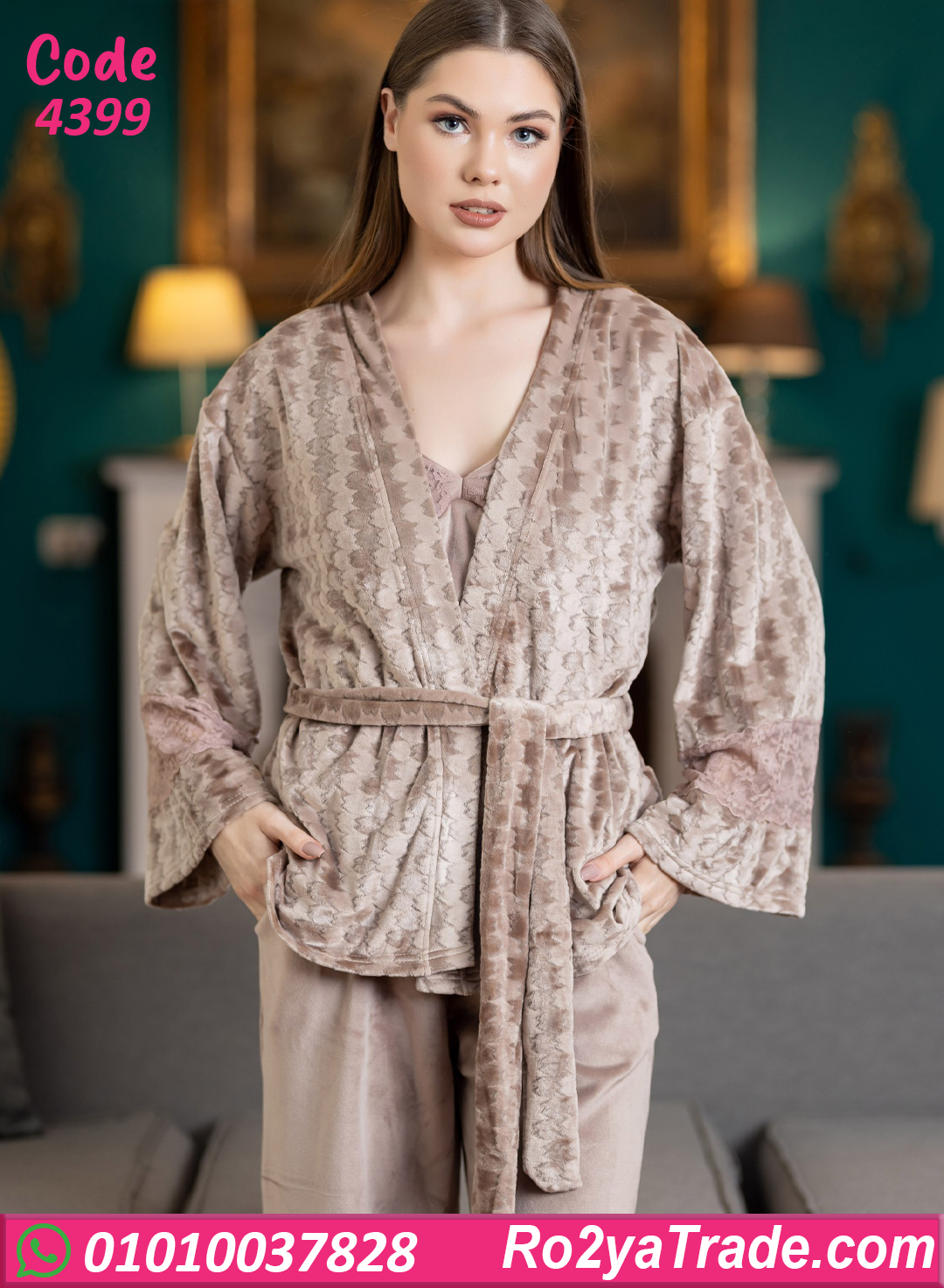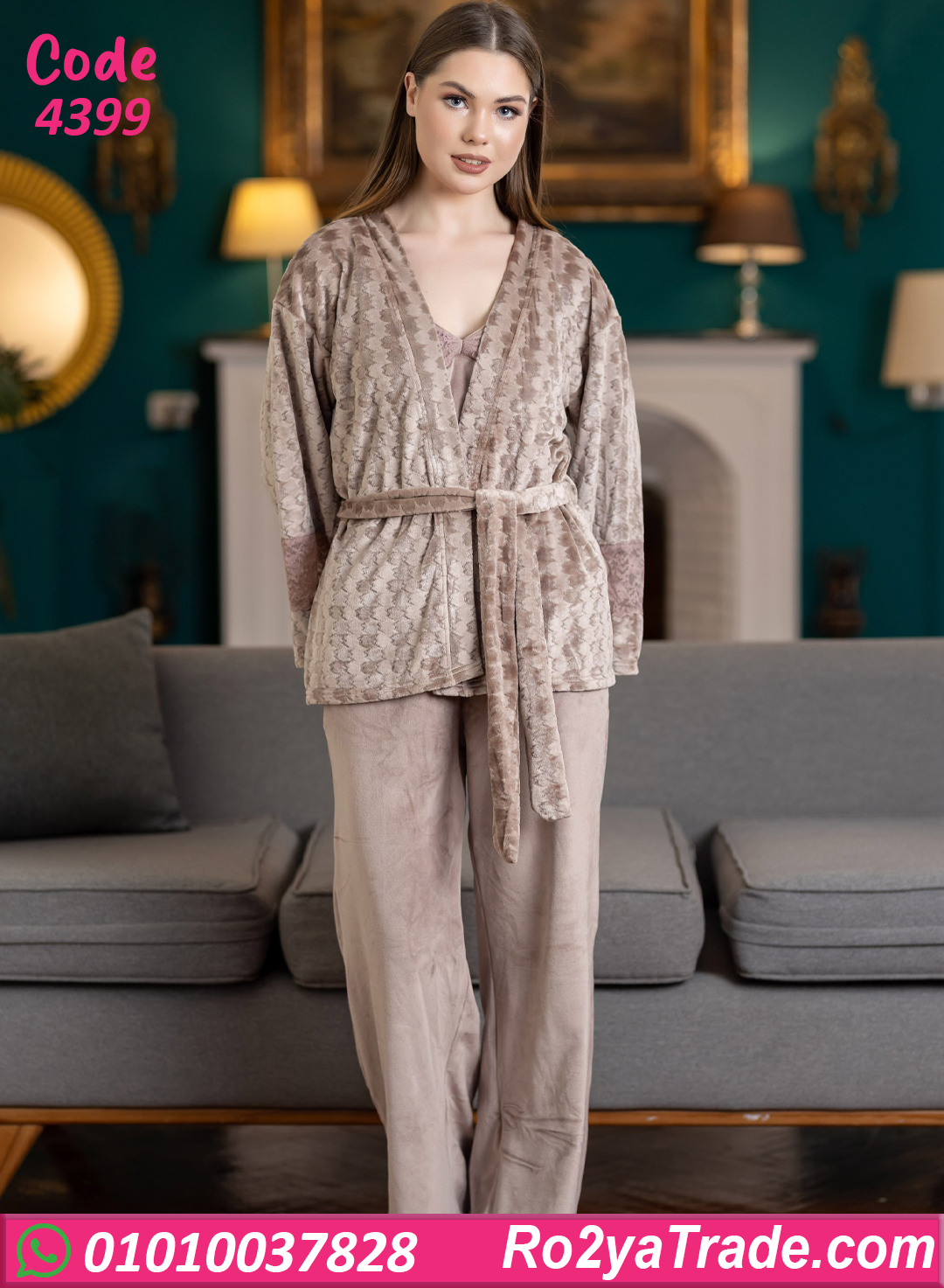 بيجامة حريمي شتوي بتصميم أنيق وهادي، مكوّنة من توب حريمي ناعم وبنطلون مريح ومعاهم روب شتوي بخامة قطيفة ناعمة