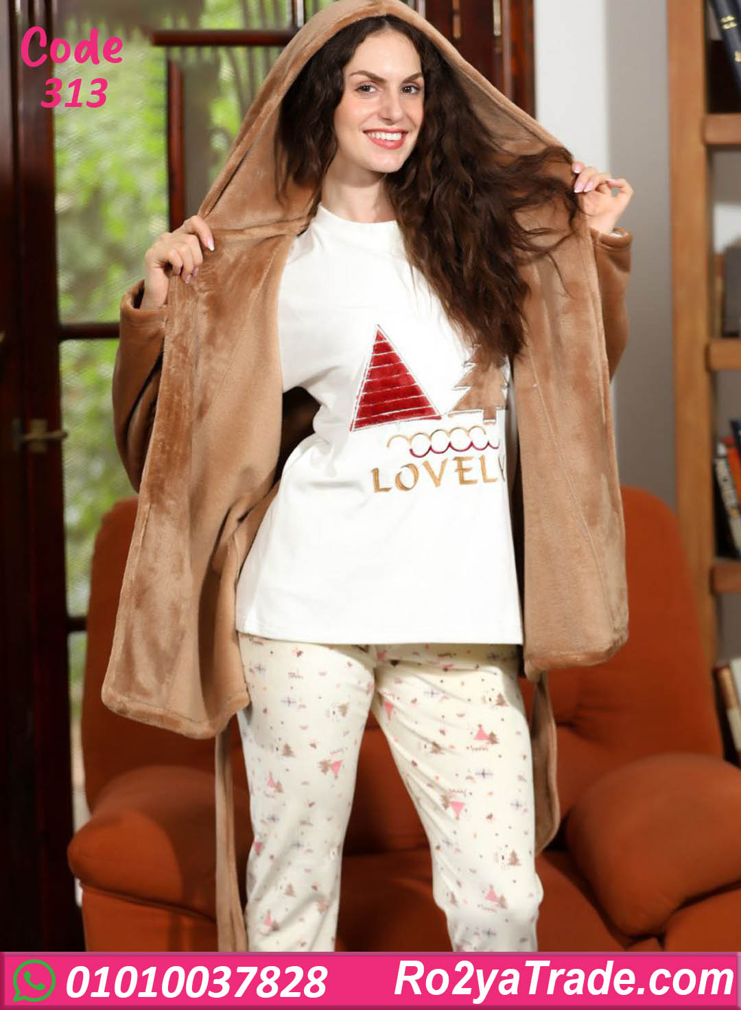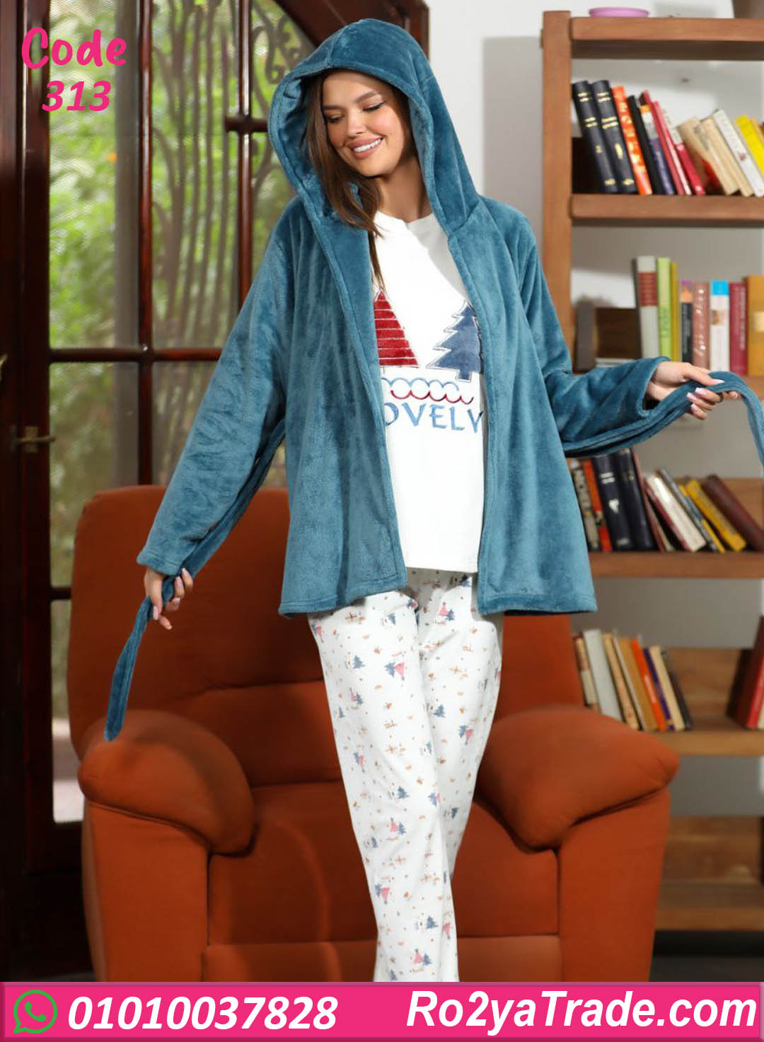 بيجامة نسائي شتوي مكوّنة من تيشيرت بكم طويل بخامة ناعمة ومريحة، مع بنطلون شتوي عملي بنقشة لطيفة، بالإضافة إلى روب شتوي بكابيشو وحزام يدي دفا إضافي وشكل شيك. الخامة لطيفة على الجلد وبتوفر إحساس عالي بالراحة والدفا، والطقم مناسب اللبس اليومي في البيت أو القعدة. قطعة أساسية لأي ست بتحب الراحة مع ستايل هادي. كود 313