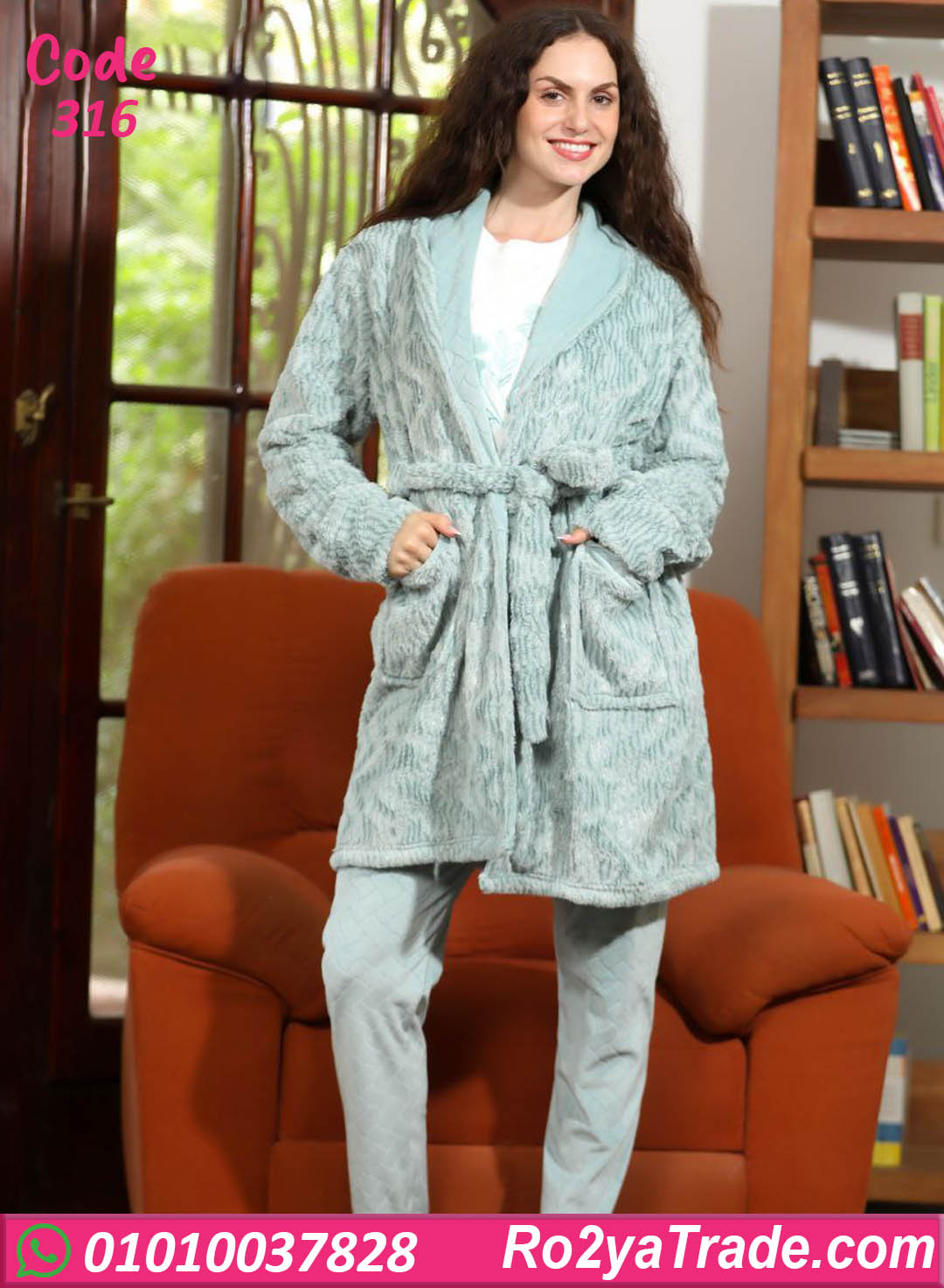 بيجامة نسائي شتوي مكوّنة من تيشيرت سادة بكم طويل، مع بنطلون شتوي مريح، بالإضافة إلى روب شتوي بحزام وجيوب عملية يدي دفا وشياكة في نفس الوقت. الخامة لطيفة على الجلد ومناسبة الاستخدام اليومي، طقم عملي وأساسي لأي ست بتحب الراحة مع شكل شيك. كود 316