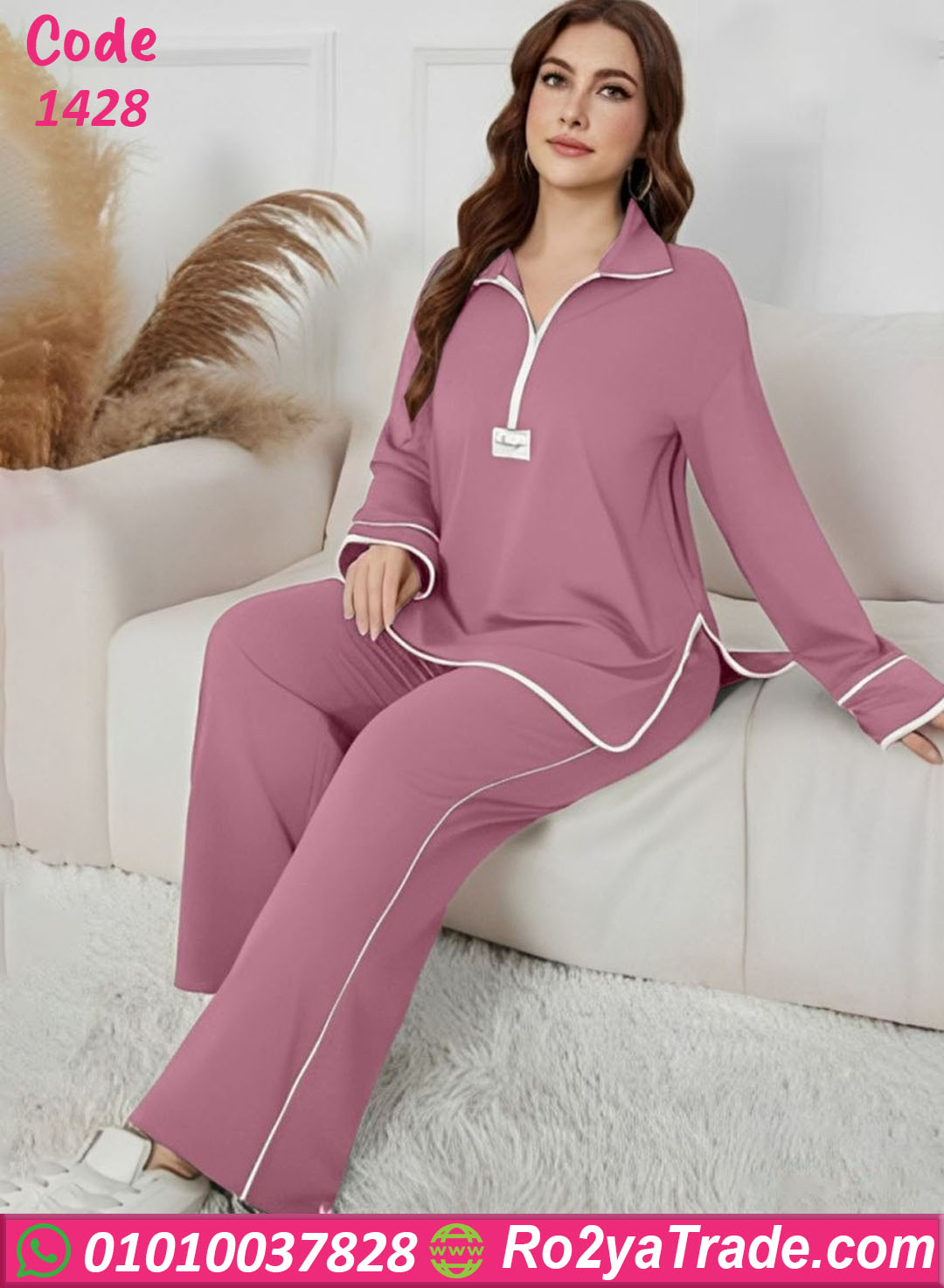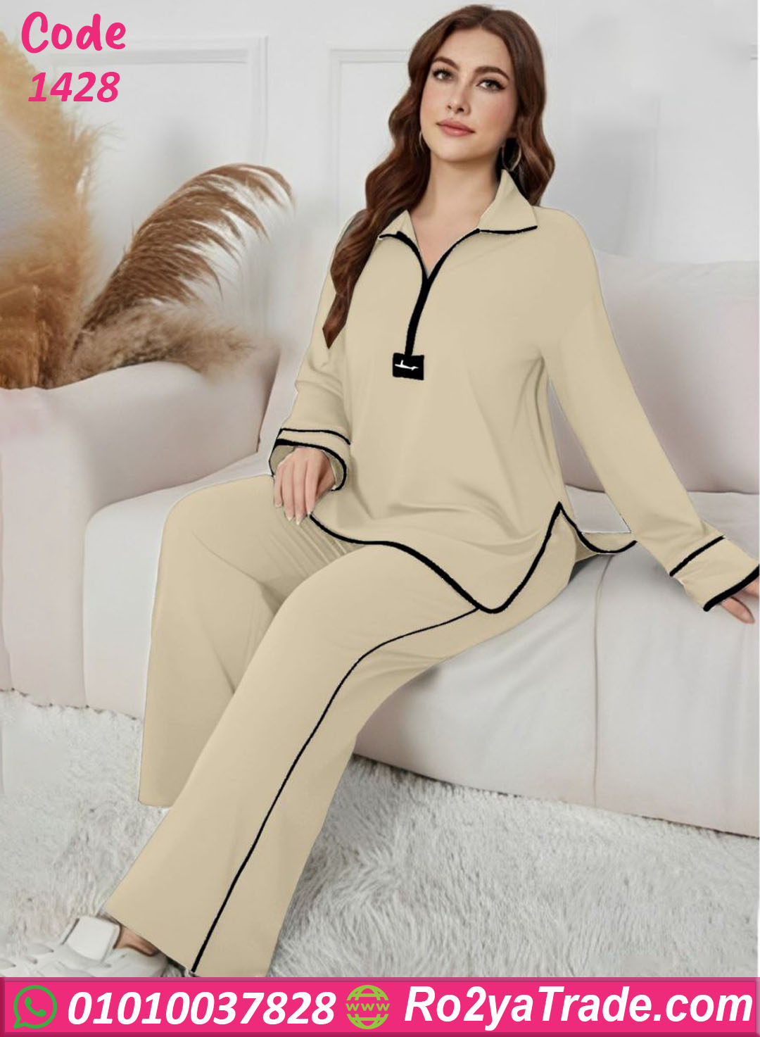 يتكون الطقم من قطعتين؛ بلوزة حريمي بكم طويل بتصميم واسع مريح مع ياقة عصرية وسوستة أمامية تضيف لمسة ستايل مميزة، بالإضافة إلى بنطلون طويل بنفس التصميم.