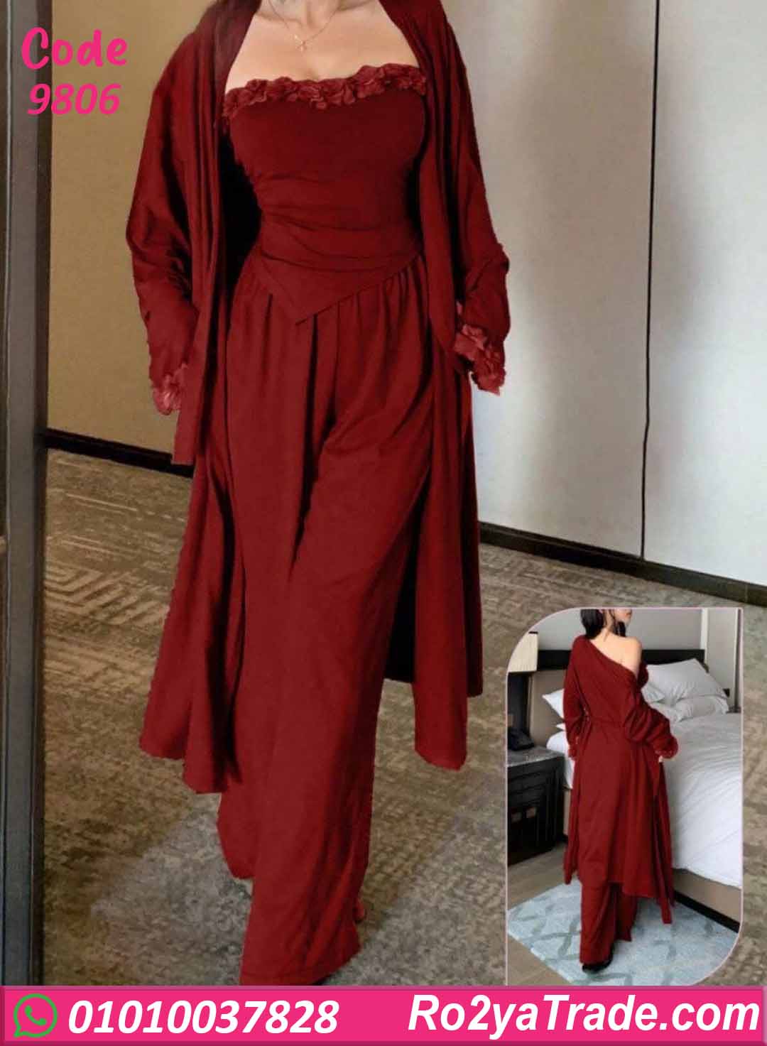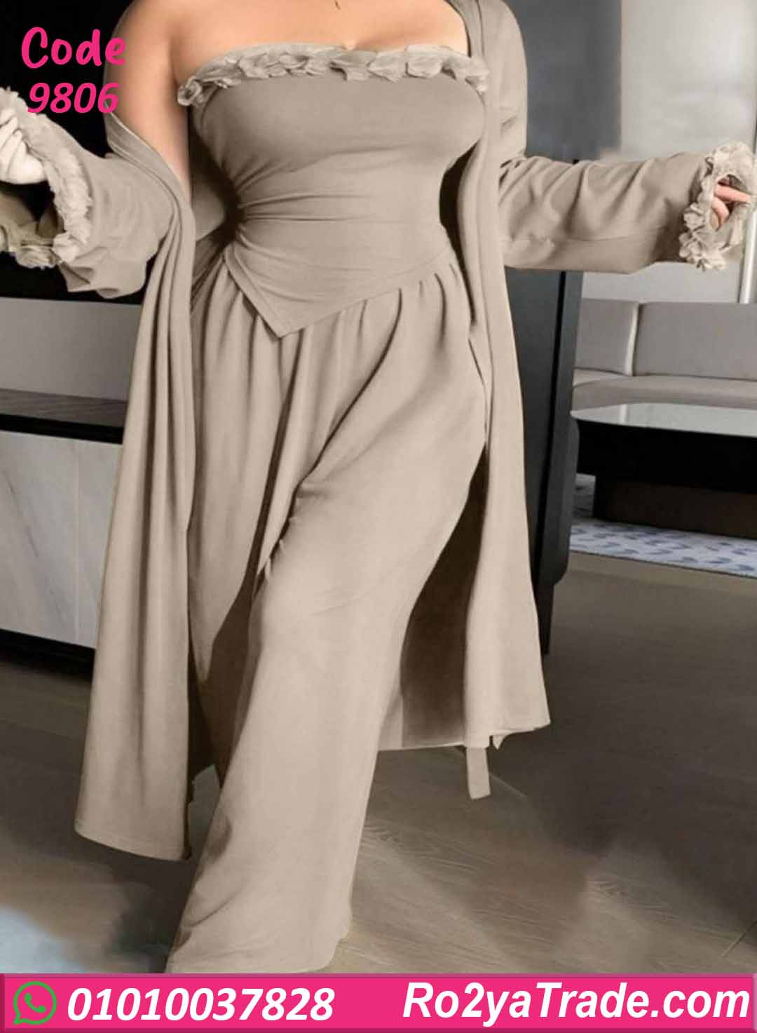 مكوّنة من قطعتين: توب بتصميم ناعم مع بنطلون مريح، ومعاهم روب خفيف بيكمّل الإطلالة ويدي شكل أنيق وعملي.