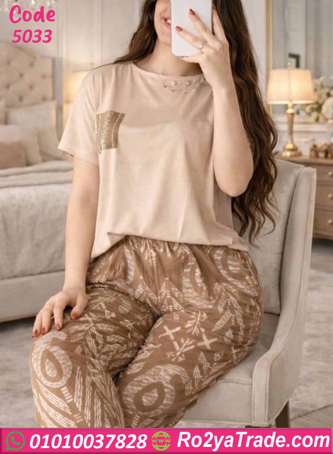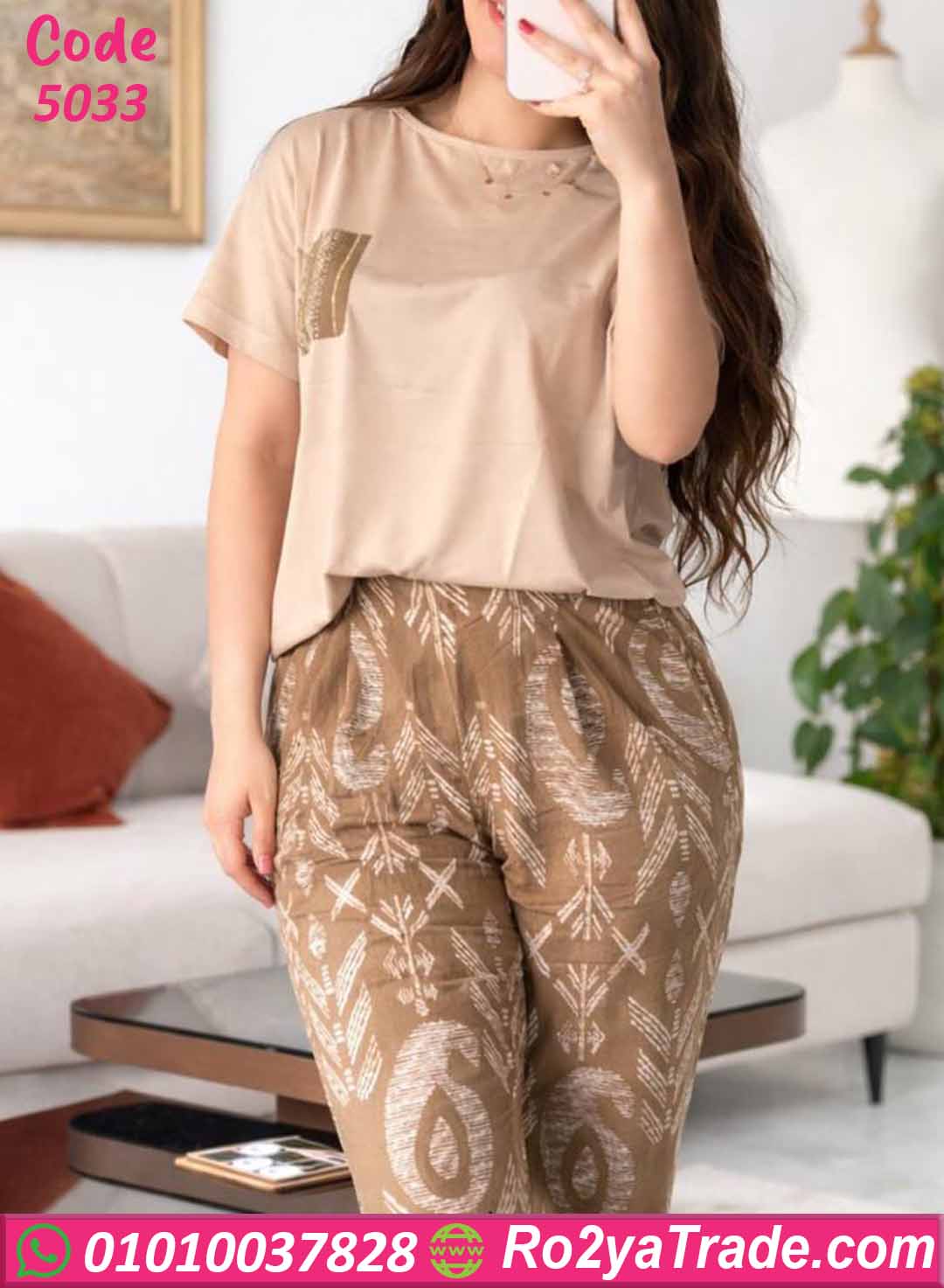 بيجامة حريمي صيفي توب سادة وبنطلون بنقشة عصرية – كود 5033