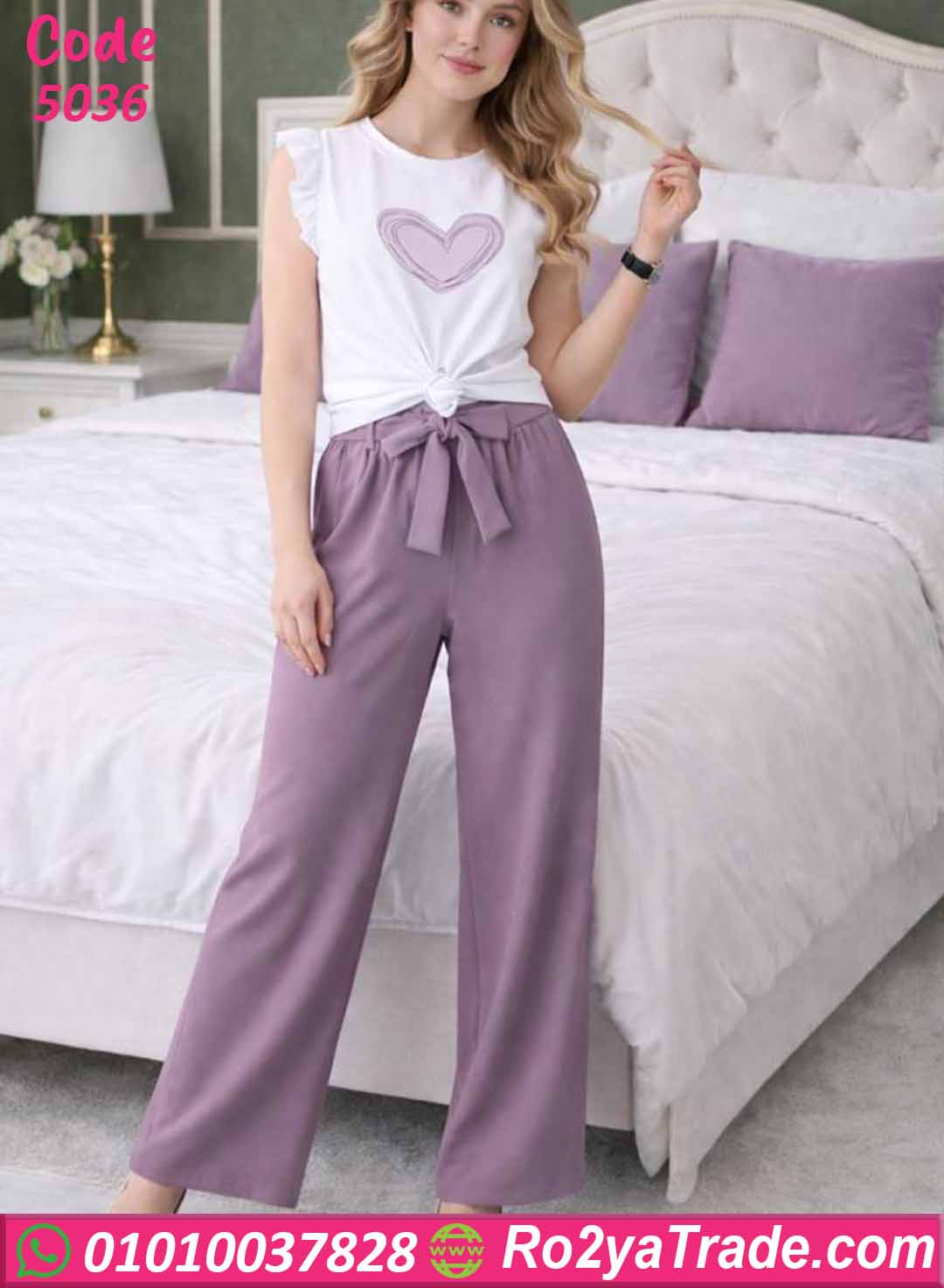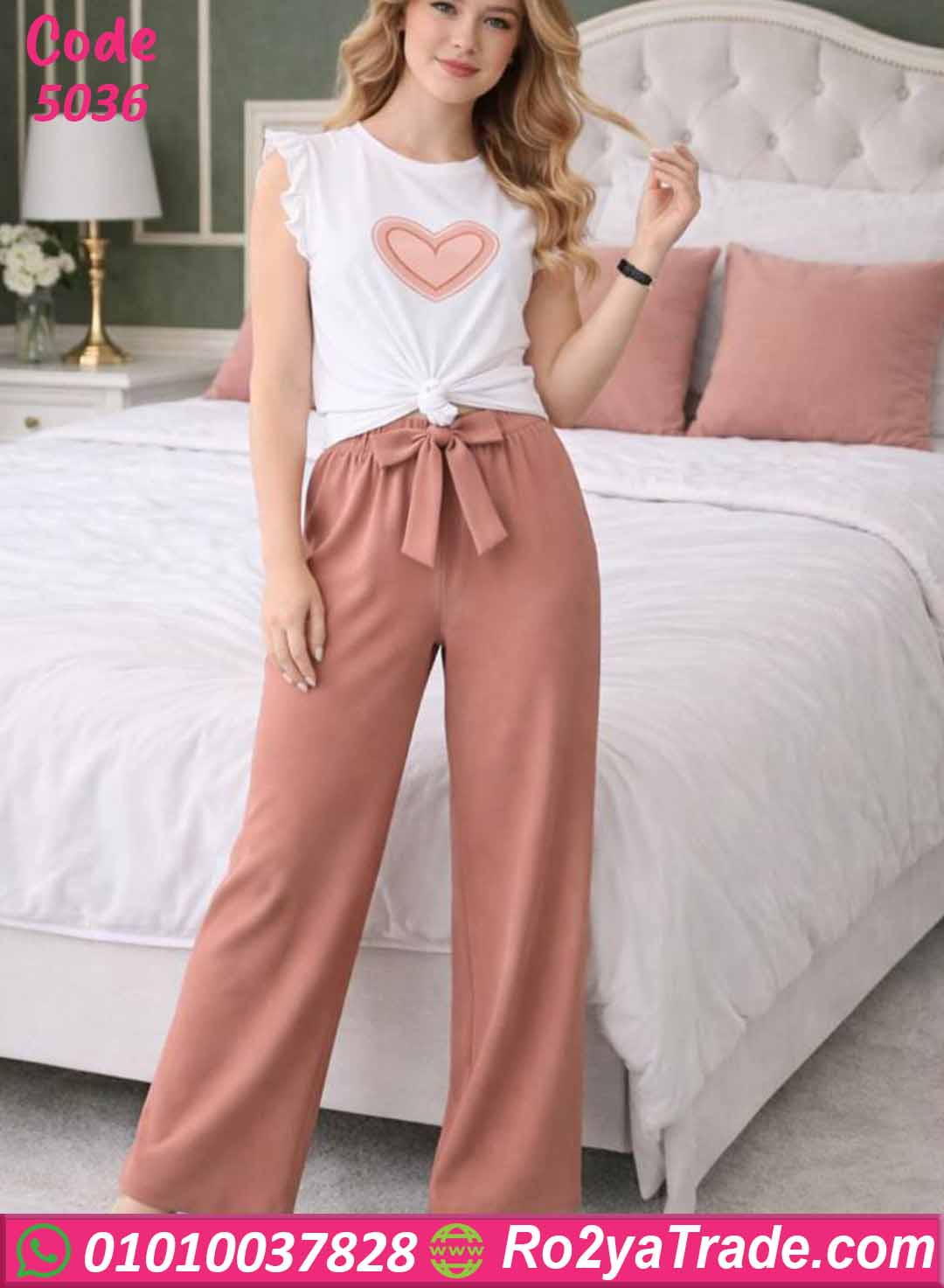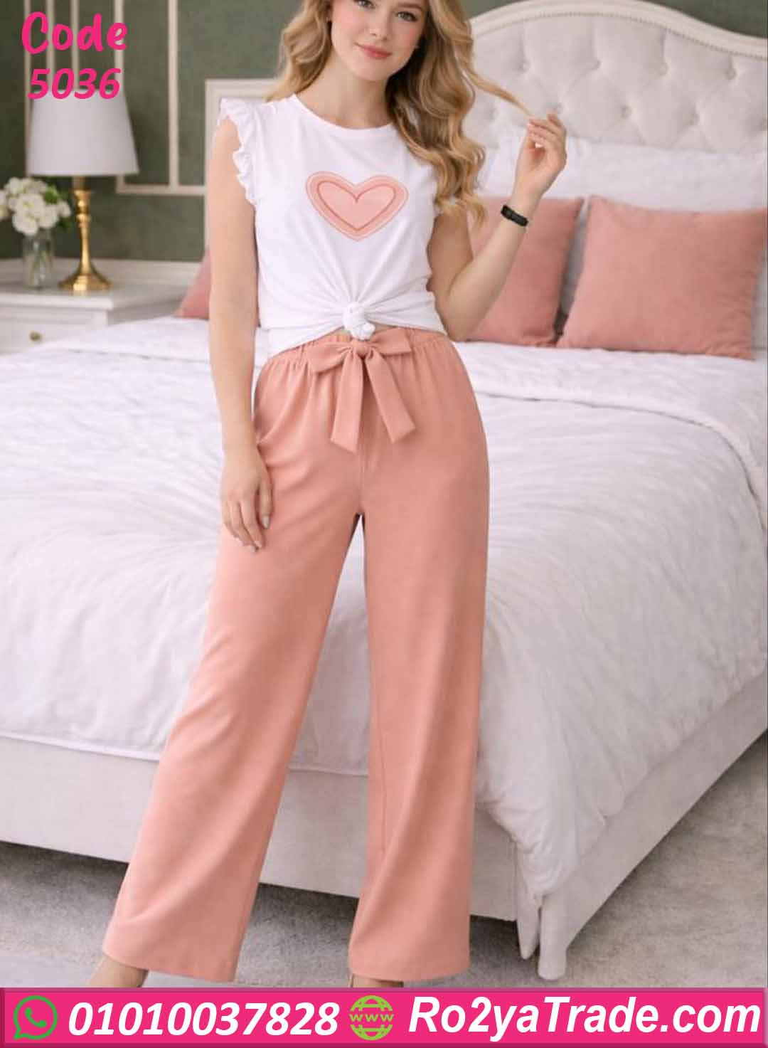 بيجامة حريمي صيفي توب قلب وبنطلون واسع – كود 5036