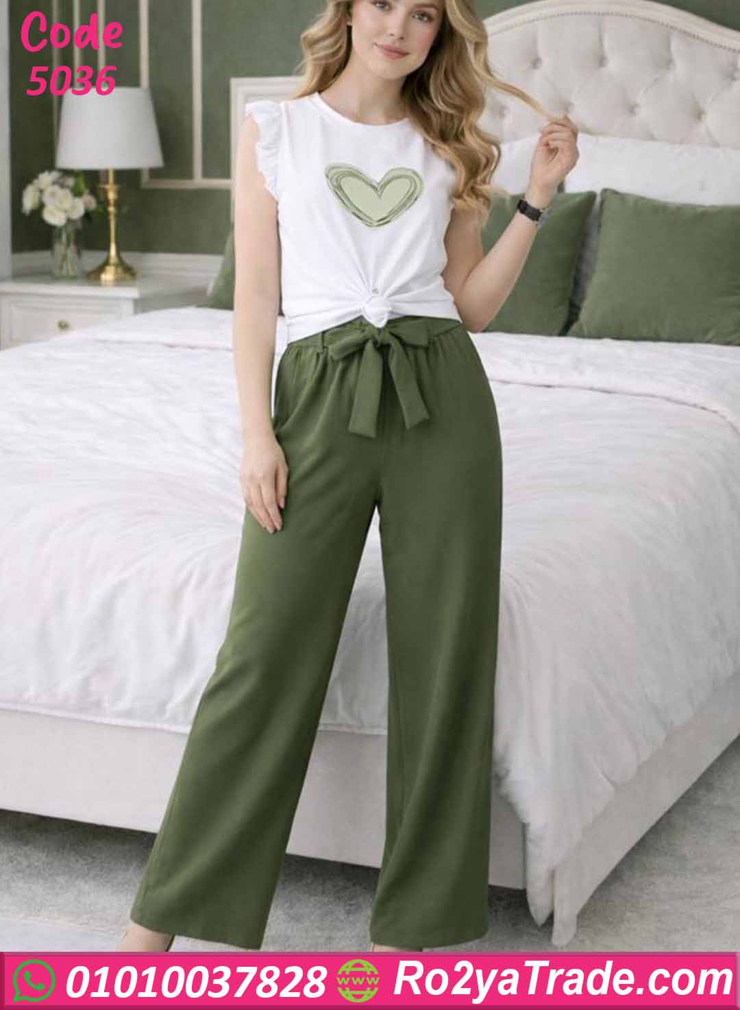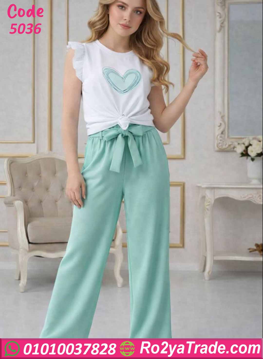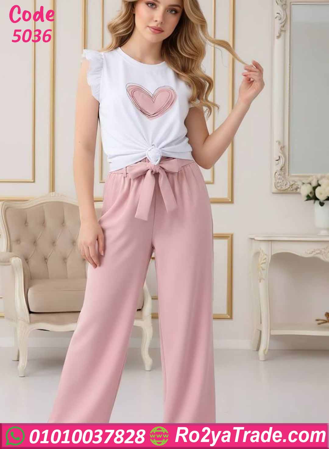 بيجامة حريمي صيفي توب قلب وبنطلون واسع – كود 5036