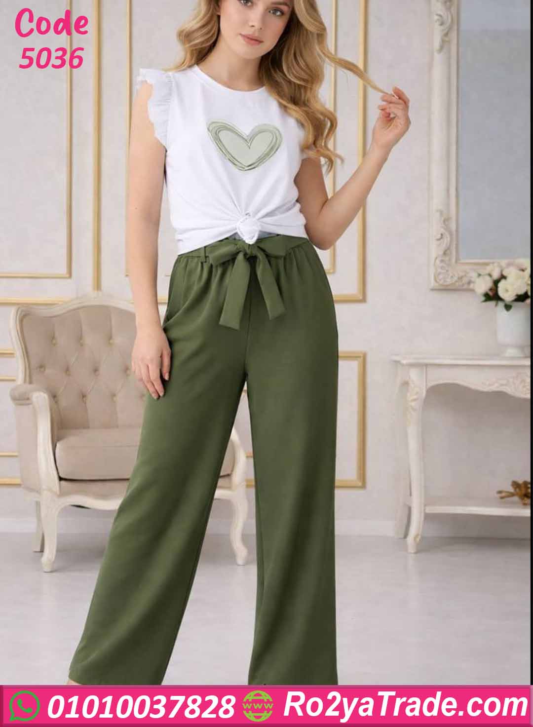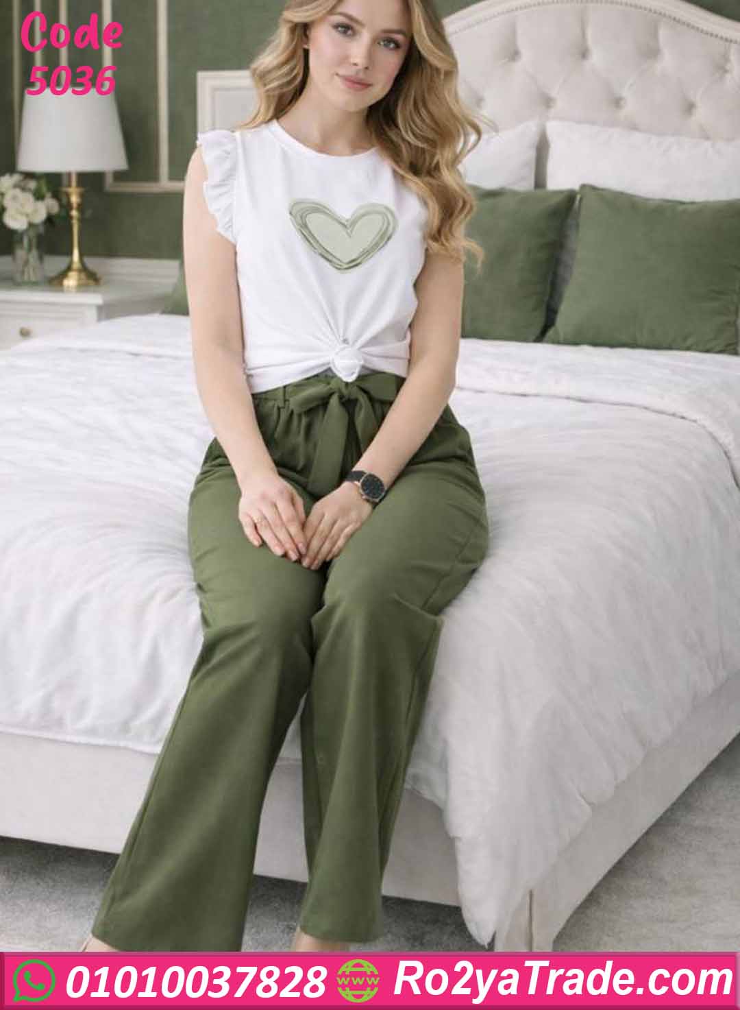 يتكون الطقم من قطعتين: توب أبيض بأكمام قصيرة مزينة بكشكشة خفيفة على الكتف مع طبعة قلب أنيقة في المنتصف تضيف لمسة ناعمة ومميزة، مع بنطلون طويل واسع بخصر مطاطي ورباط قابل للتعديل ليمنحك الراحة والثبات أثناء الحركة.