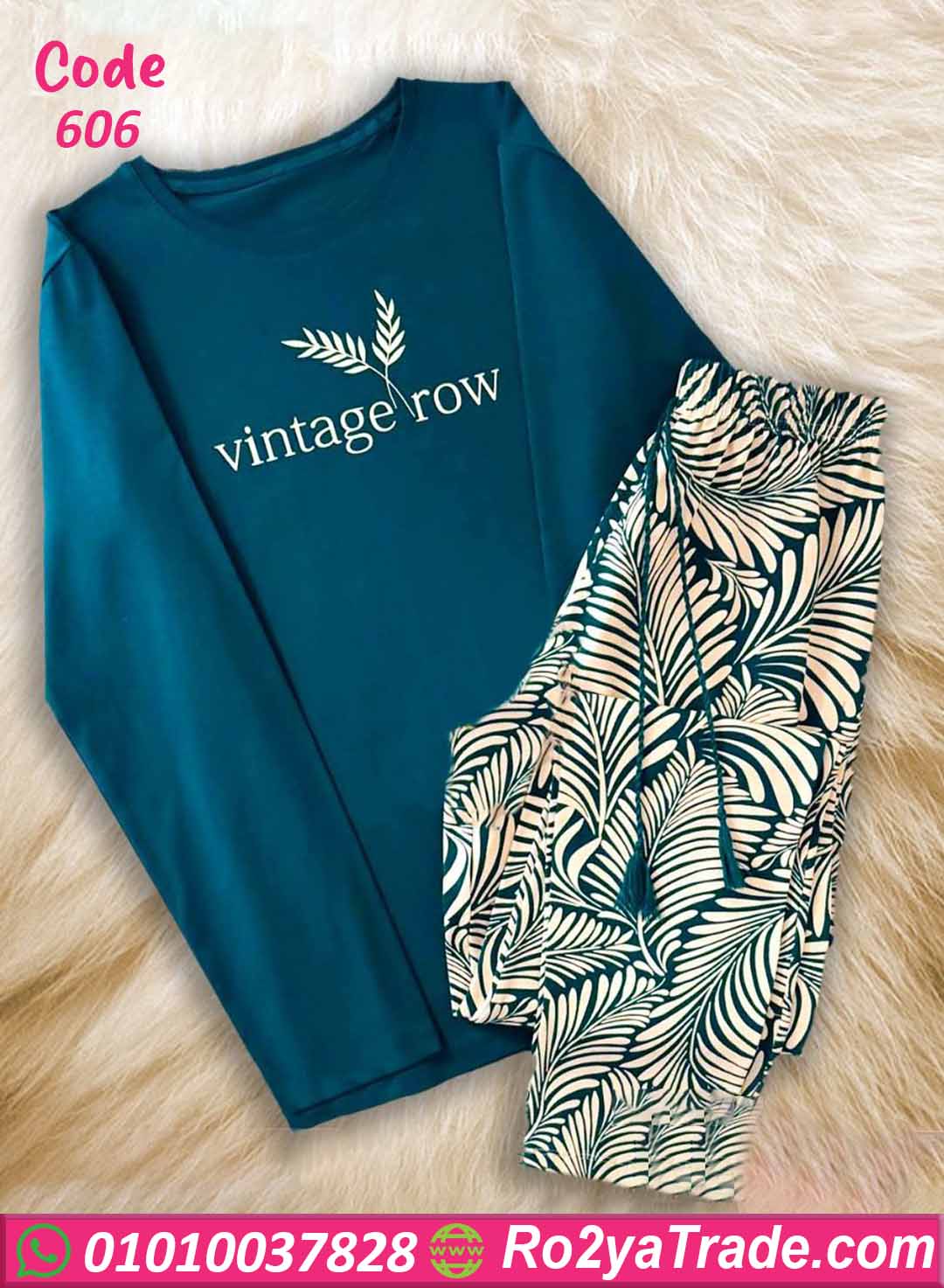 بيجامة حريمي صيفي بتصميم عصري يجمع بين بلوزة جنزارى بطباعة vintage row وبنطال مشجر بنقشة أوراق أنيقة تمنحك إطلالة مريحة وراقية في البيت.