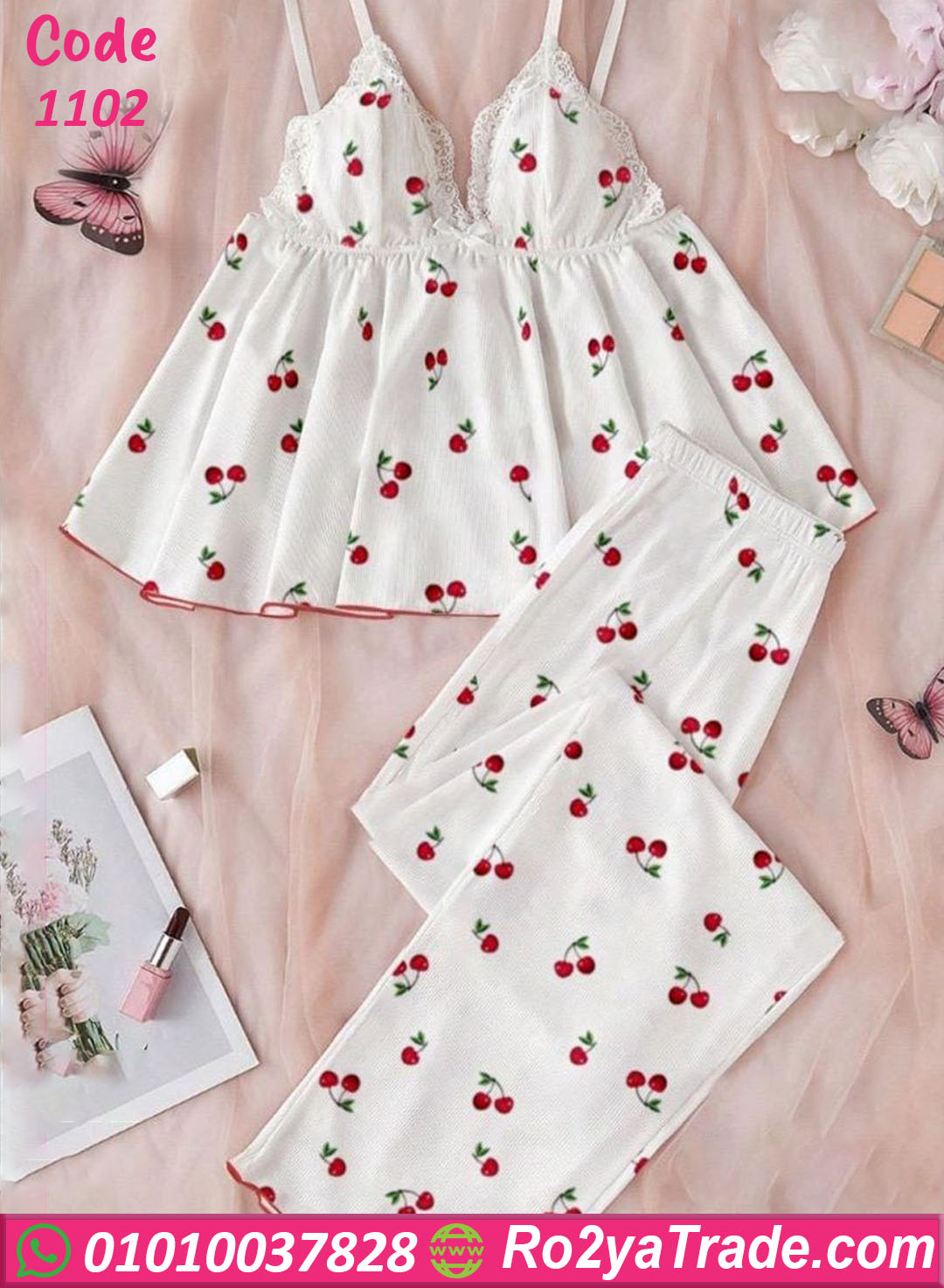 يتكون الطقم من قطعتين؛ توب حريمي بحمالات رفيعة مع بنطلون طويل مريح. يتميز التصميم بنقشة الكريز الصغيرة التي تضيف لمسة أنثوية لطيفة تعطي للموديل شكل جذاب ومميز.
