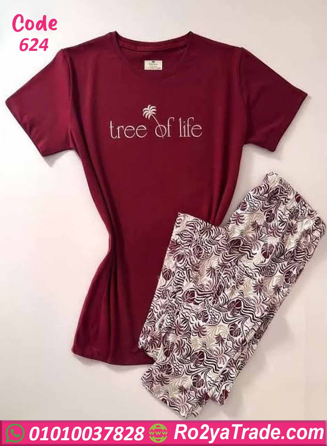 بيجامة نسائية صيفي – كود 624 من ماركة pilee pinke مصنوعة من خامة خفيفة وناعمة على البشرة تناسب أجواء الصيف. تتميز بتيشيرت نبيتي بطباعة Tree of Life في المنتصف تضيف لمسة عصرية هادئة، مع بنطال واسع مشجر بنقشة أوراق متناسقة تمنح الطقم شكل أنيق ومريح للاستخدام اليومي داخل المنزل.