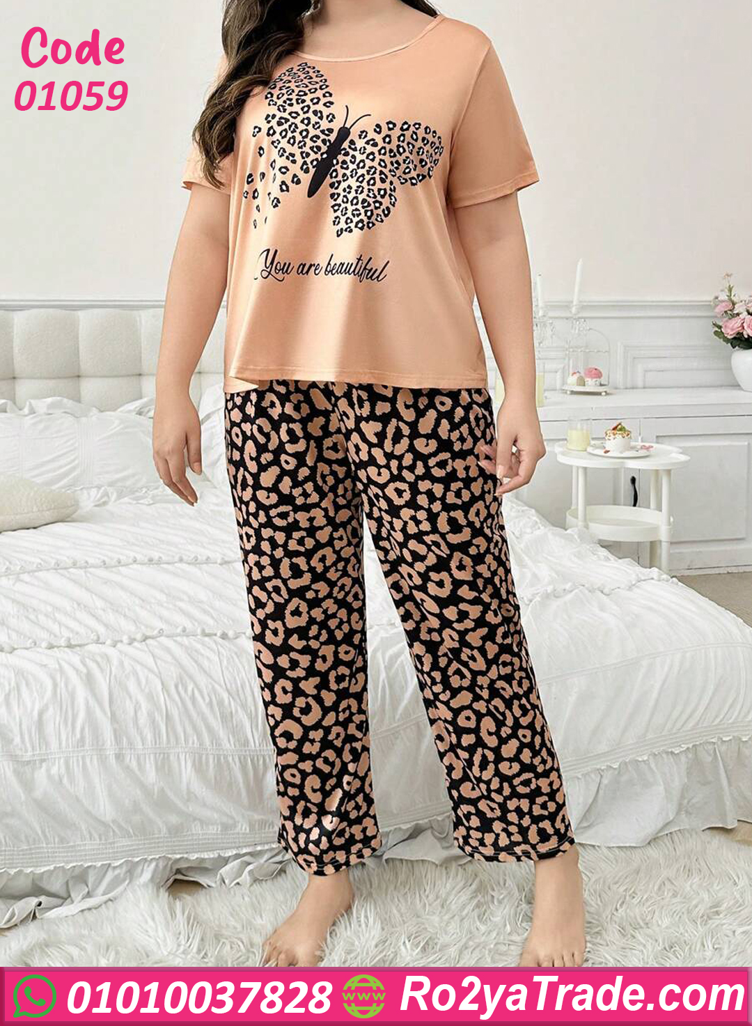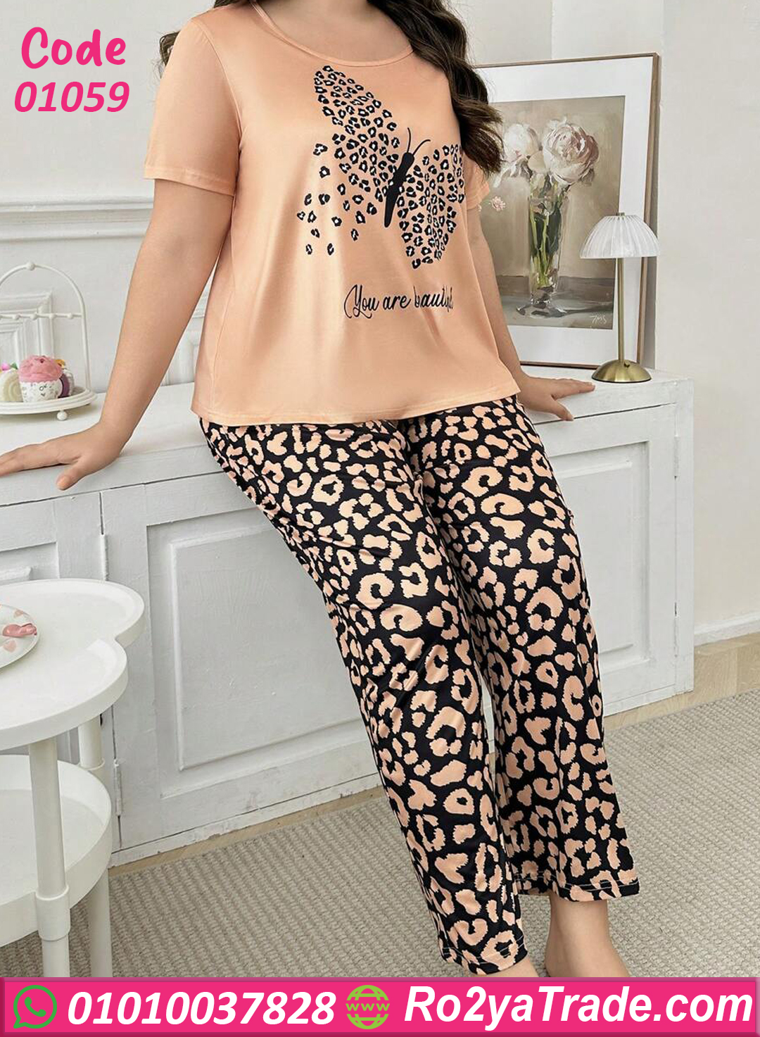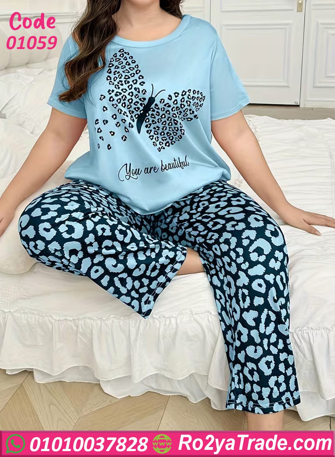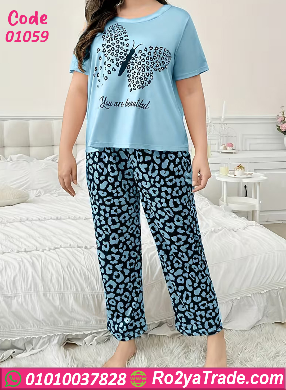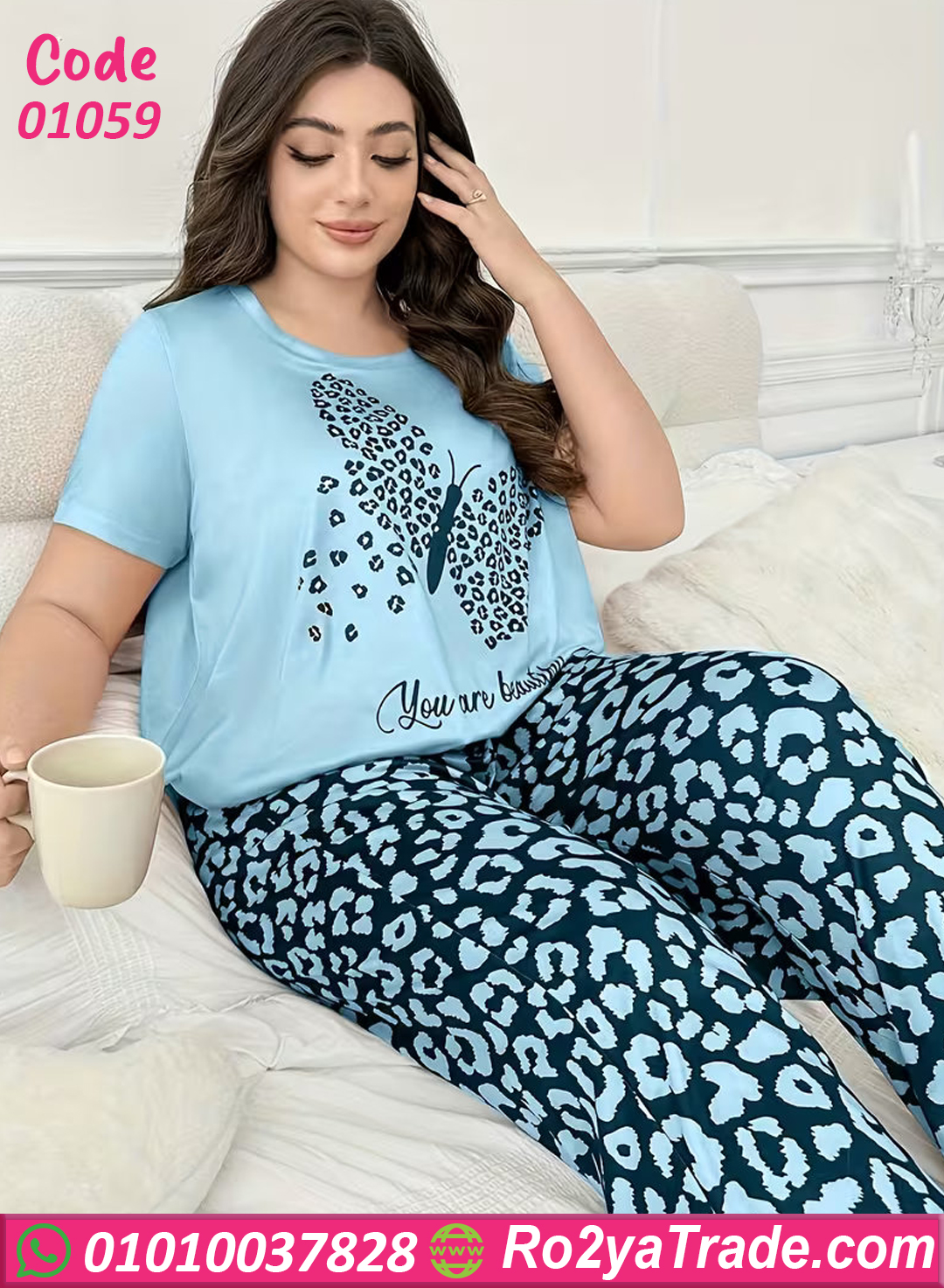 التيشرت قصّة مريحة بأكمام قصيرة، عليها رسمة فراشة مطبوعة بشكل أنثوي شيك، والبنطلون واسع بخامة بتمط على الجسم ووسط مطاط علشان يناسب مقاسك براحة طول اليوم.