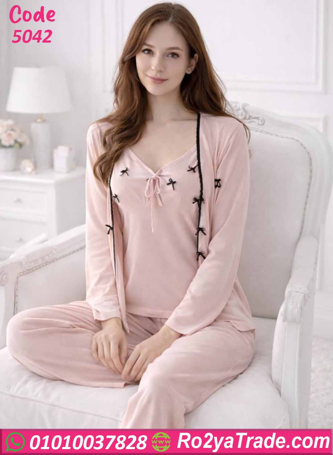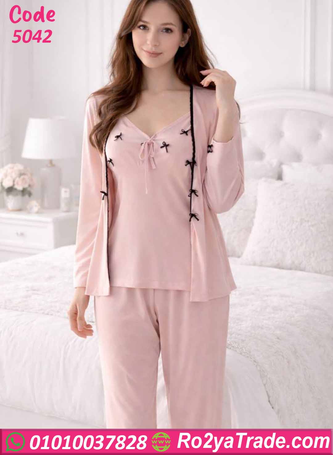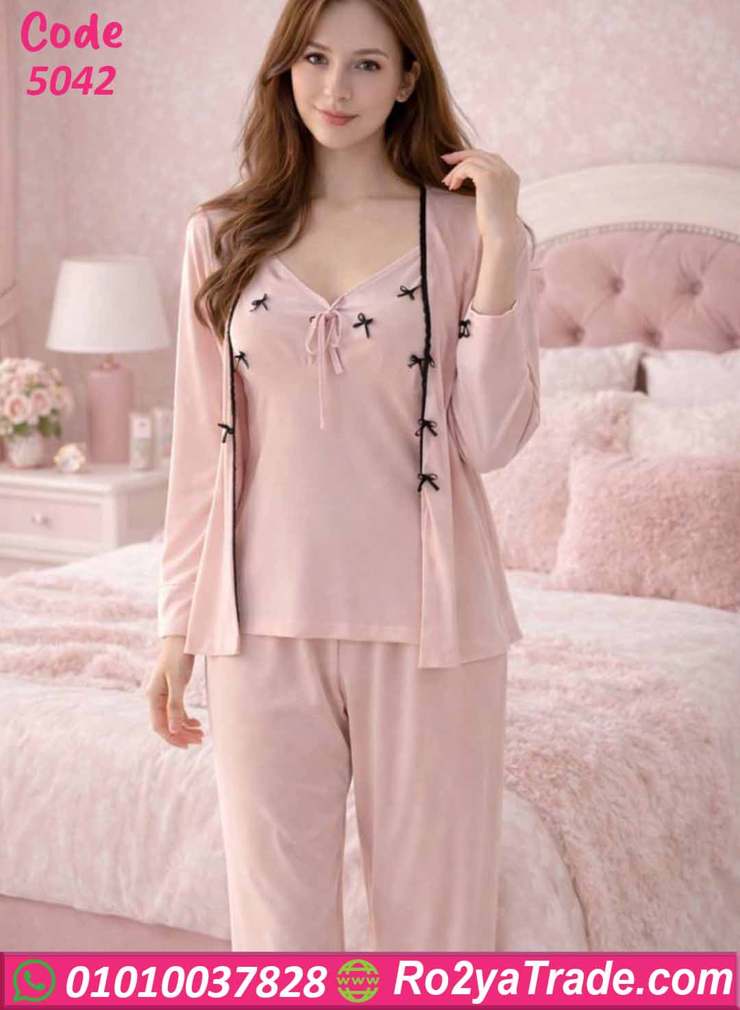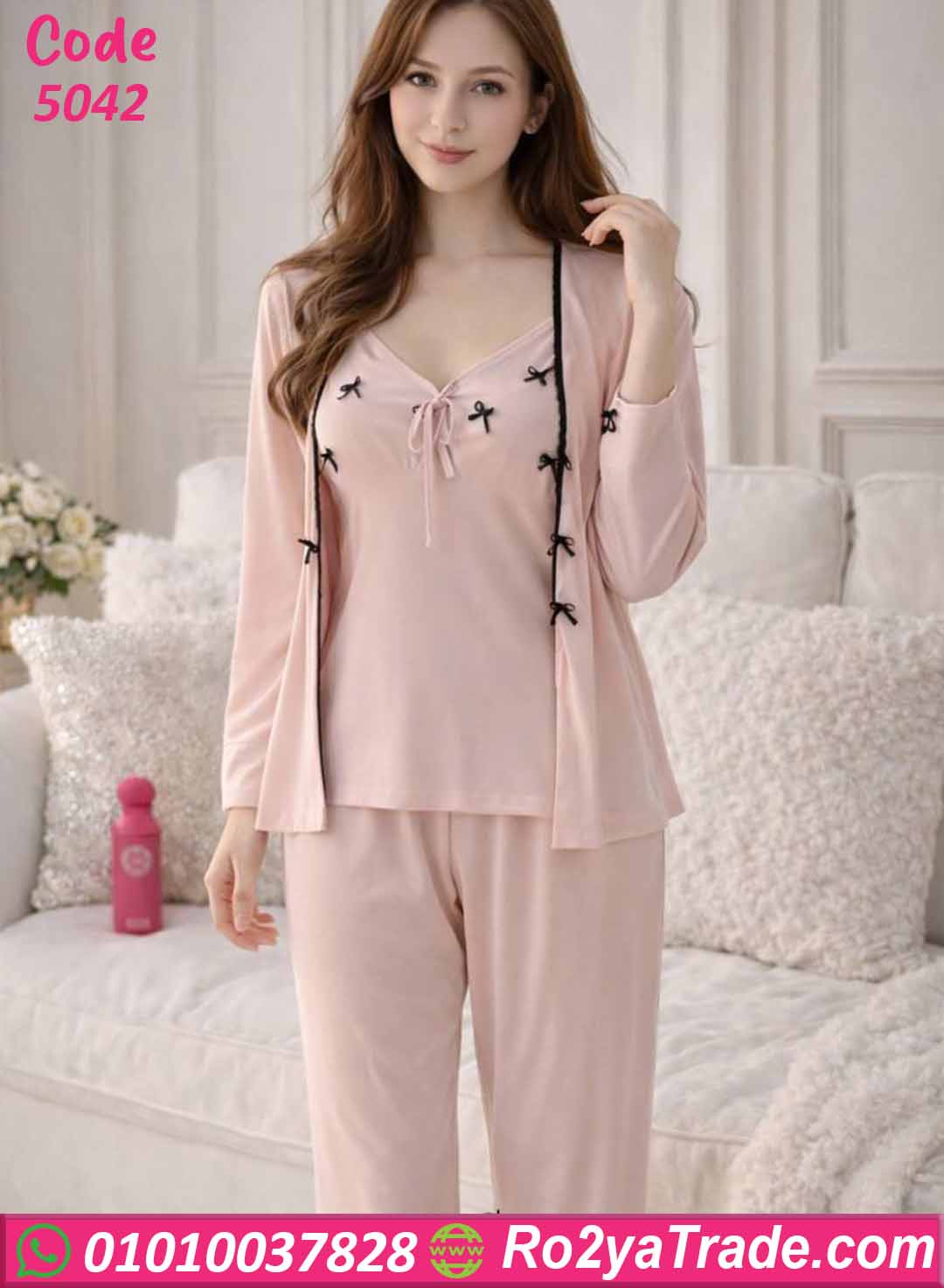 توب بحمالات بتصميم ناعم مزين بفيونكات صغيرة تضيف لمسة أنثوية جذابة، مع بنطلون طويل مريح بخصر مطاطي يمنحك حرية الحركة، بالإضافة إلى روب خفيف بأكمام طويلة يكمل الإطلالة ويضفي لمسة أناقة على الطقم.
