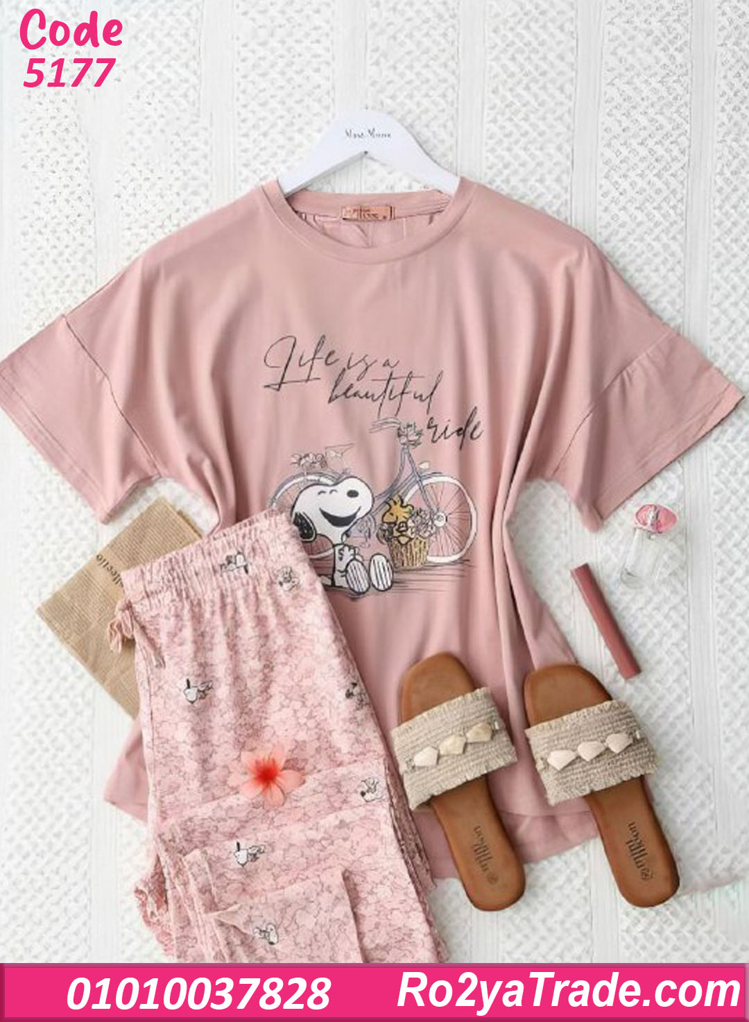 تيشيرت نص كم بلون روز هادي برسمة Snoopy لطيفة مع جملة جذابة، وبنطلون طويل بنقشة ناعمة متناسقة مع التصميم.