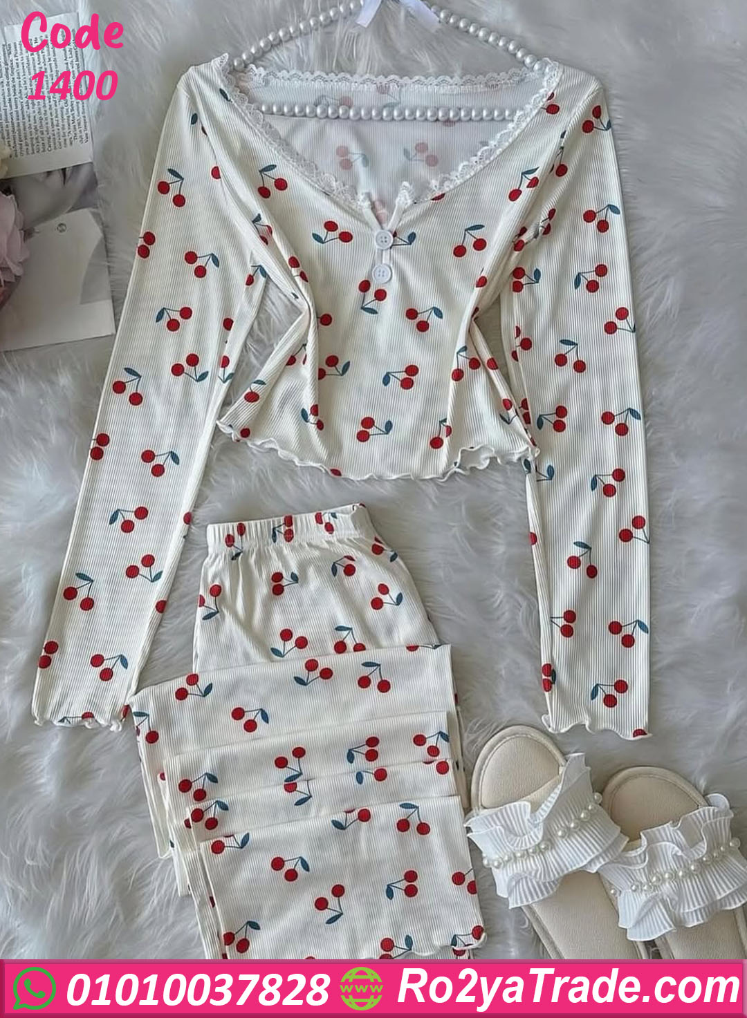 يتكون الطقم من قطعتين؛ توب حريمي بأكمام طويلة مع بنطلون مريح، ويتميز التصميم بنقشة الكريز الصغيرة التي تضيف لمسة أنثوية رقيقة وعصرية.