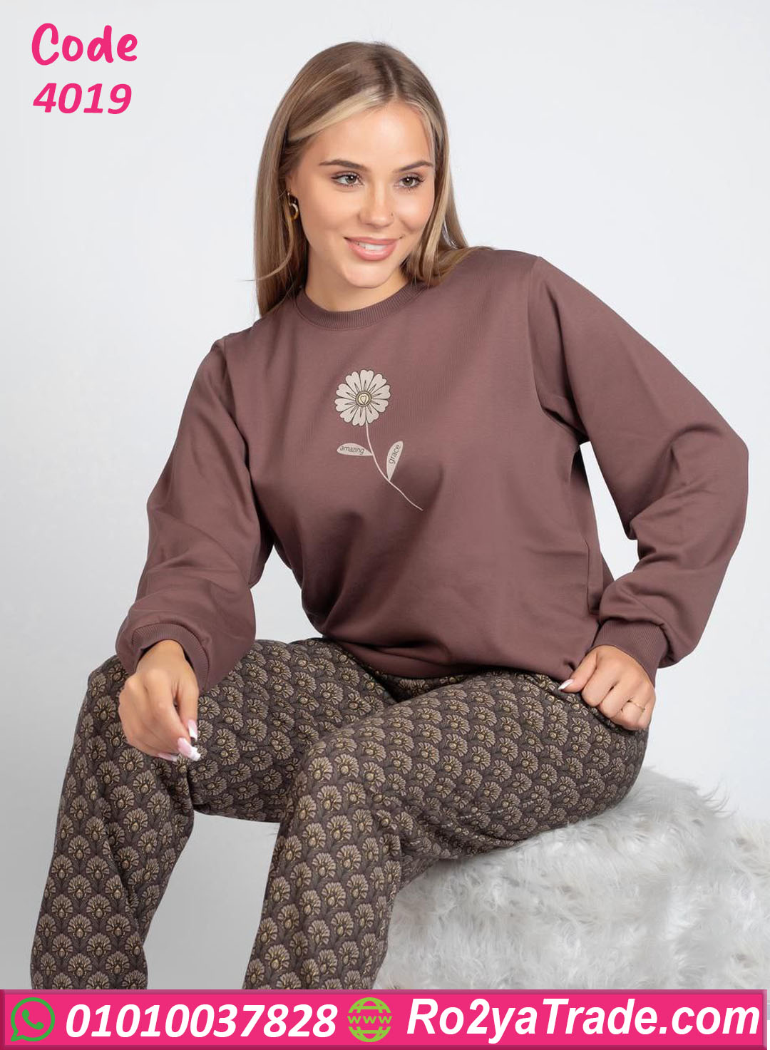 البلوزة بتصميم بسيط بكم طويل وشكل زهرة شيك في المنتصف، والبنطلون عليه نقش هادي بألوان متناسقة بتدي لمسة أنوثة ودفء.