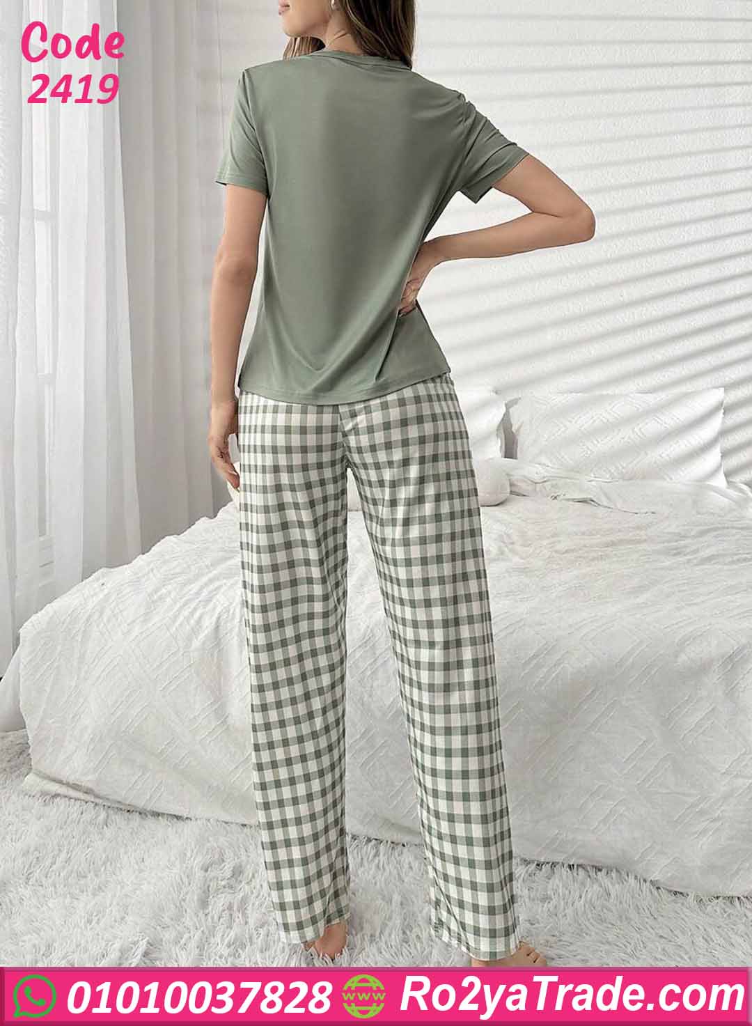 ✨ طقم مكون من (تيشيرت نص كم + بنطال طويل كاروهات)