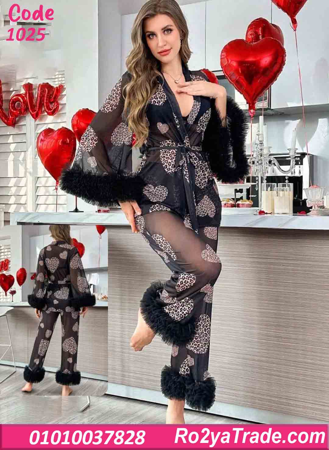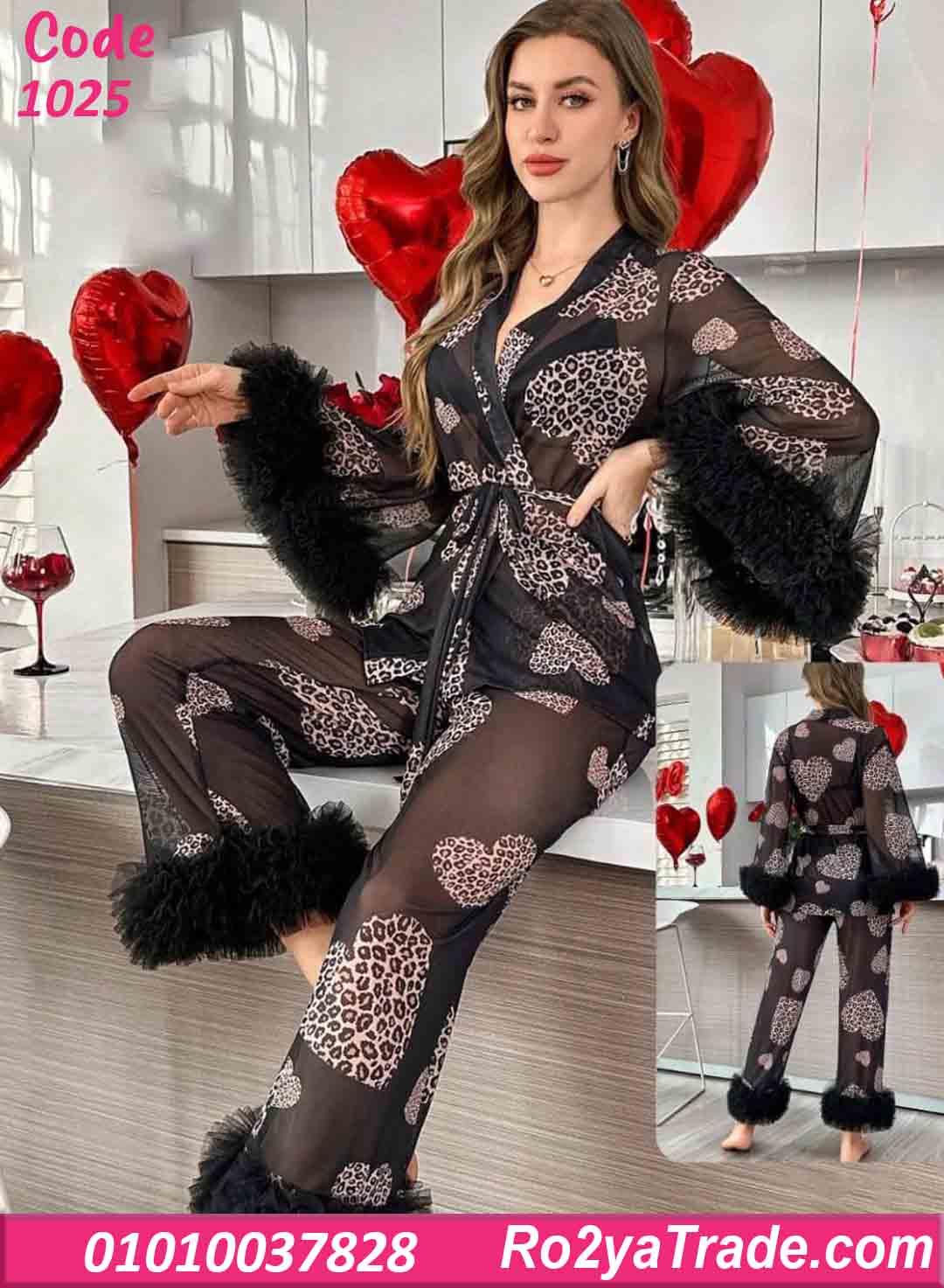 بيجامة صيفي حريمي مميزة مكونة من روب شفاف مع بنطلون بنقشة قلوب تايجر جذابة، تصميم أنيق ولمسة أنثوية جريئة مناسب للبيت ولإطلالة مميزة.