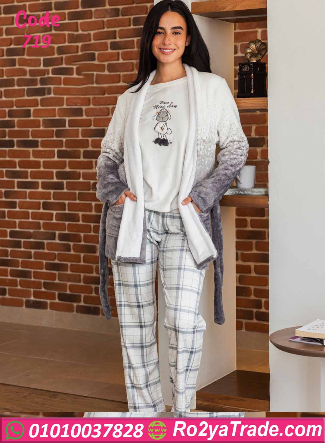 بيجامة شتوي أنيقة مكونة من 3 قطع بخامة ناعمة دافية مع روب قطيفة متدرج، مناسبة لأجواء الشتاء ولمسة بيتية فخمة 🤍