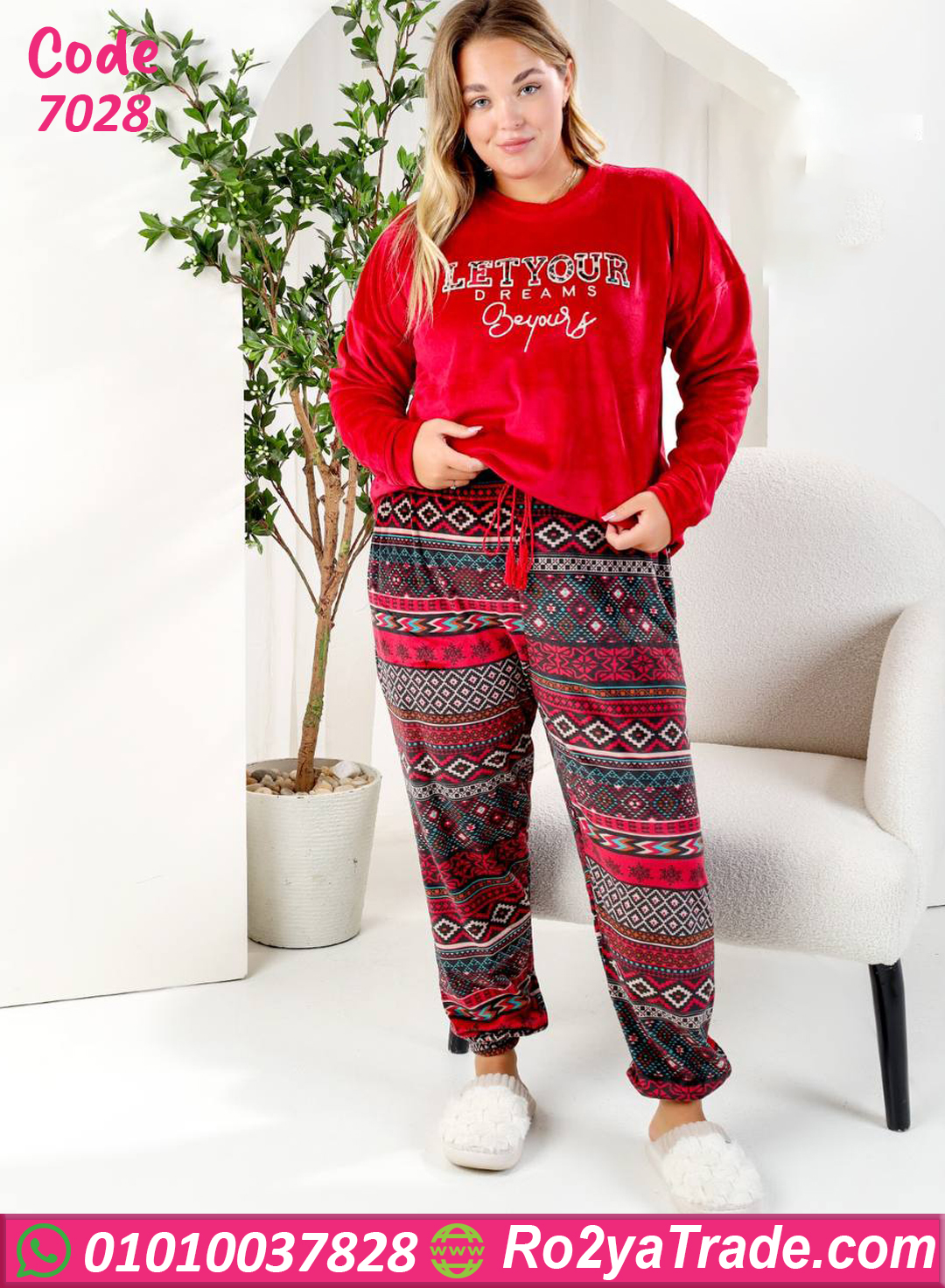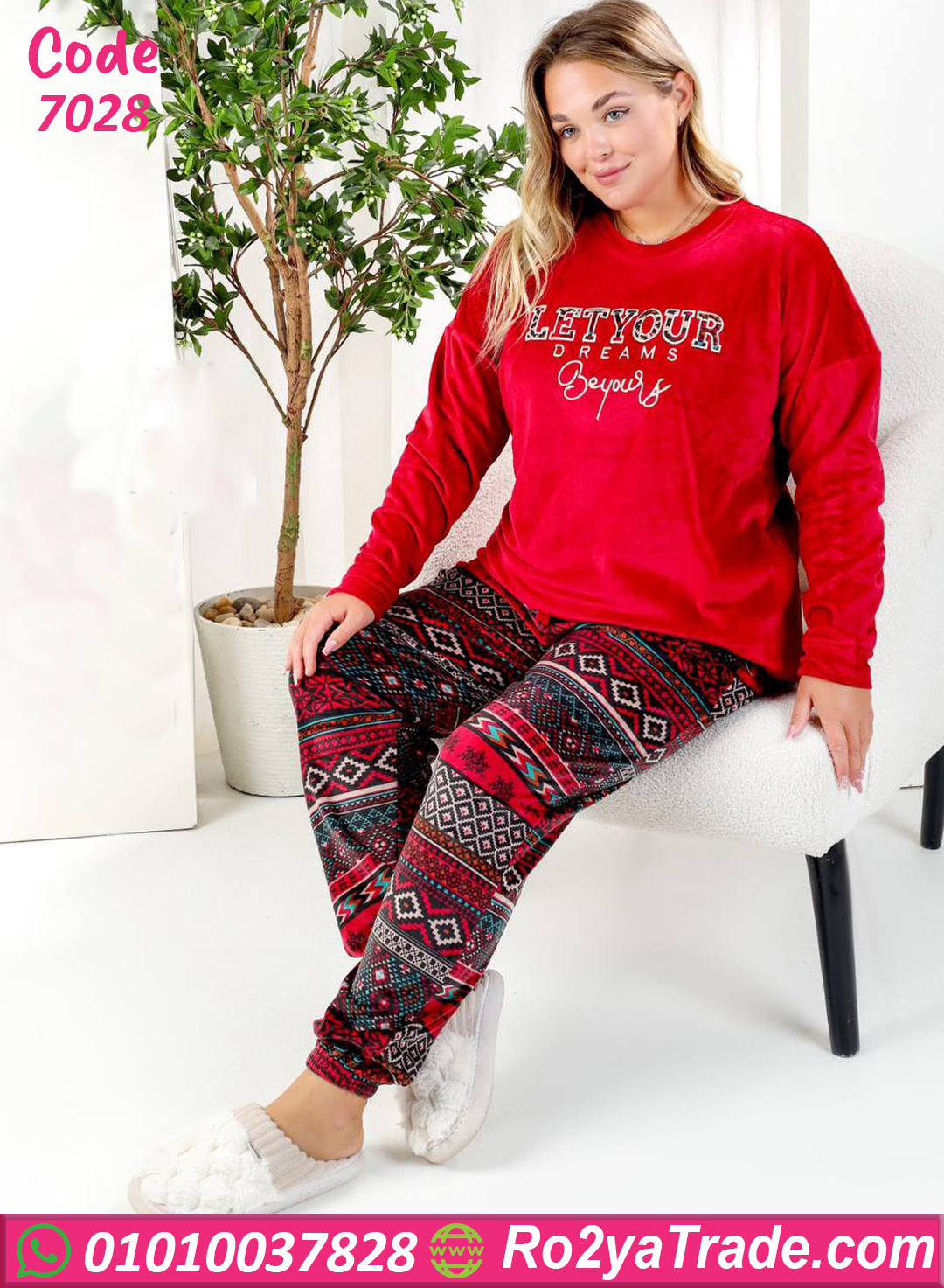 البيجامة تصميمها واسع ومريح، مناسبة للبيت والمناسبات العائلية كمان، خامة قوية مش بتكور ولا بتبهت، مثالية لأيام البرد القارس.