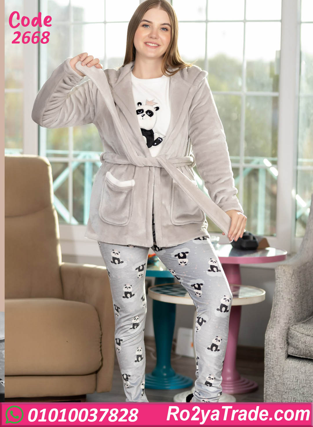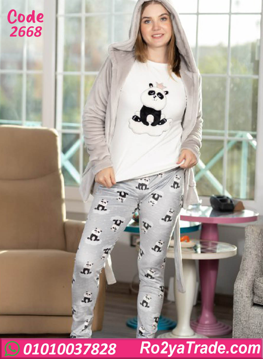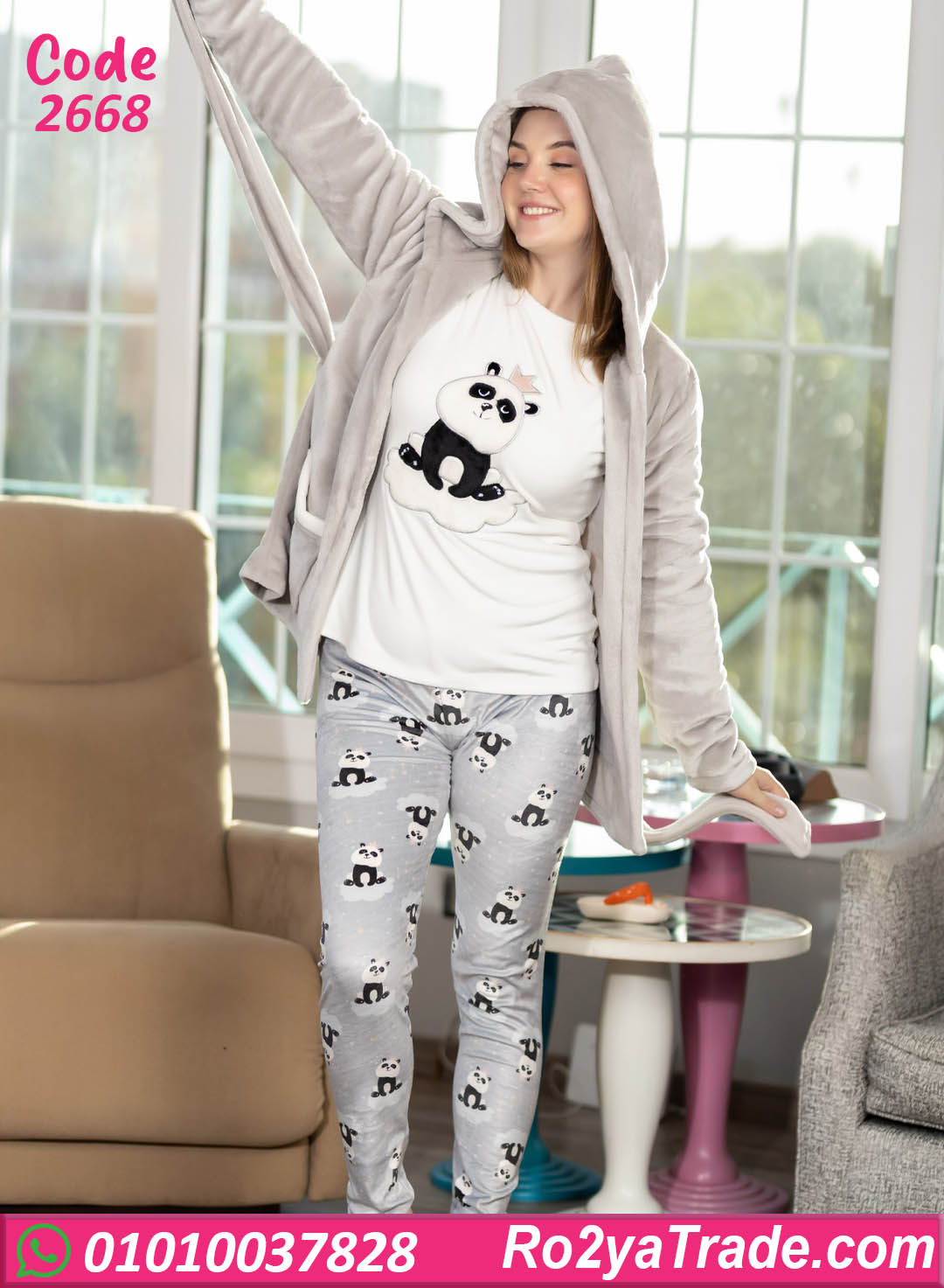 بيجامة حريمي شتوي شيك ومريحة، مكوّنة من تيشيرت وبنطلون ومعاهم روب قطيفة دافي، تصميم لطيف برسمة باندا يناسب اللبس البيتي في الشتاء.
