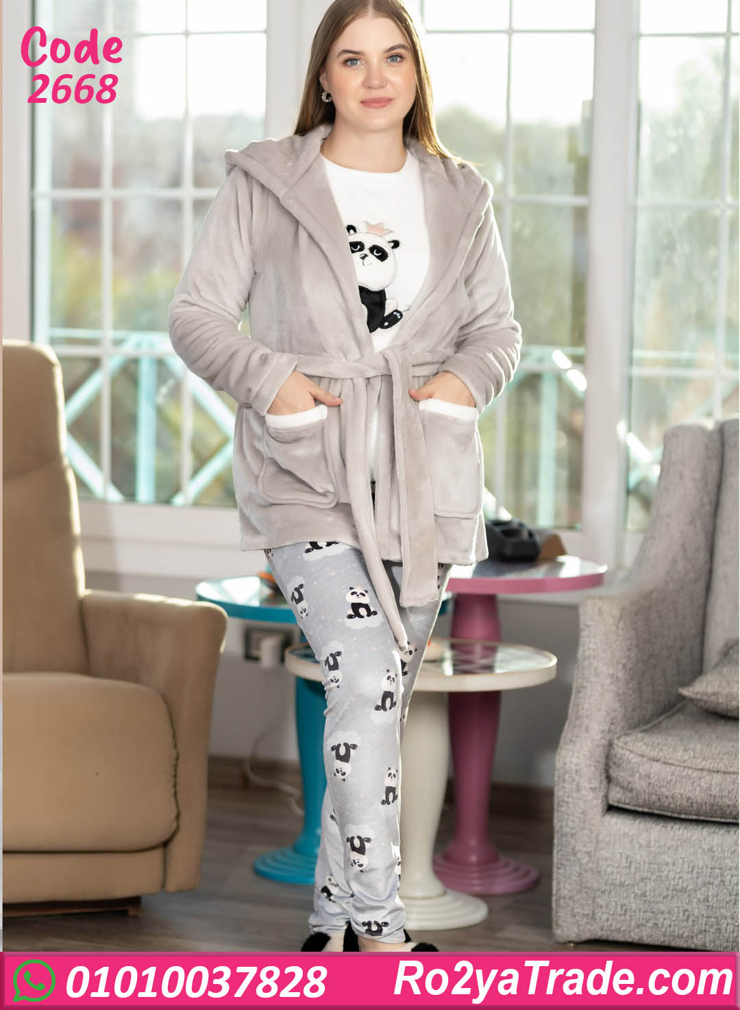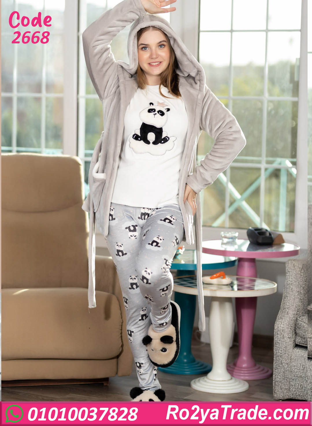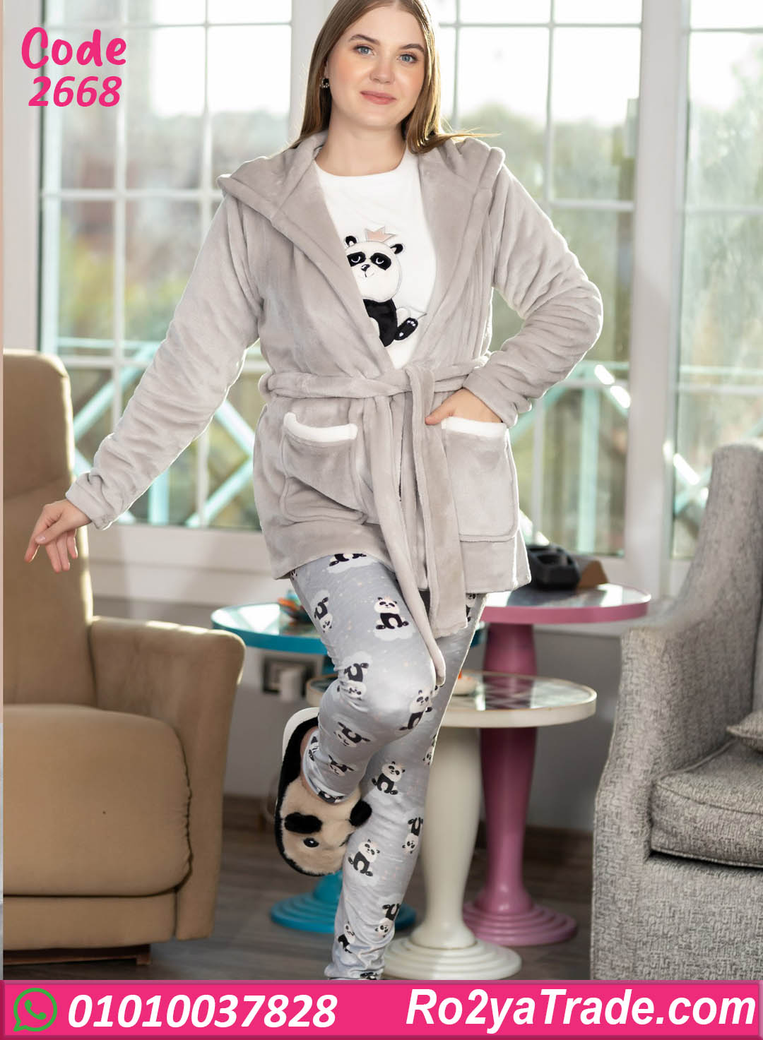 بيجامة حريمي شتوي شيك ومريحة، مكوّنة من تيشيرت وبنطلون ومعاهم روب قطيفة دافي، تصميم لطيف برسمة باندا يناسب اللبس البيتي في الشتاء.