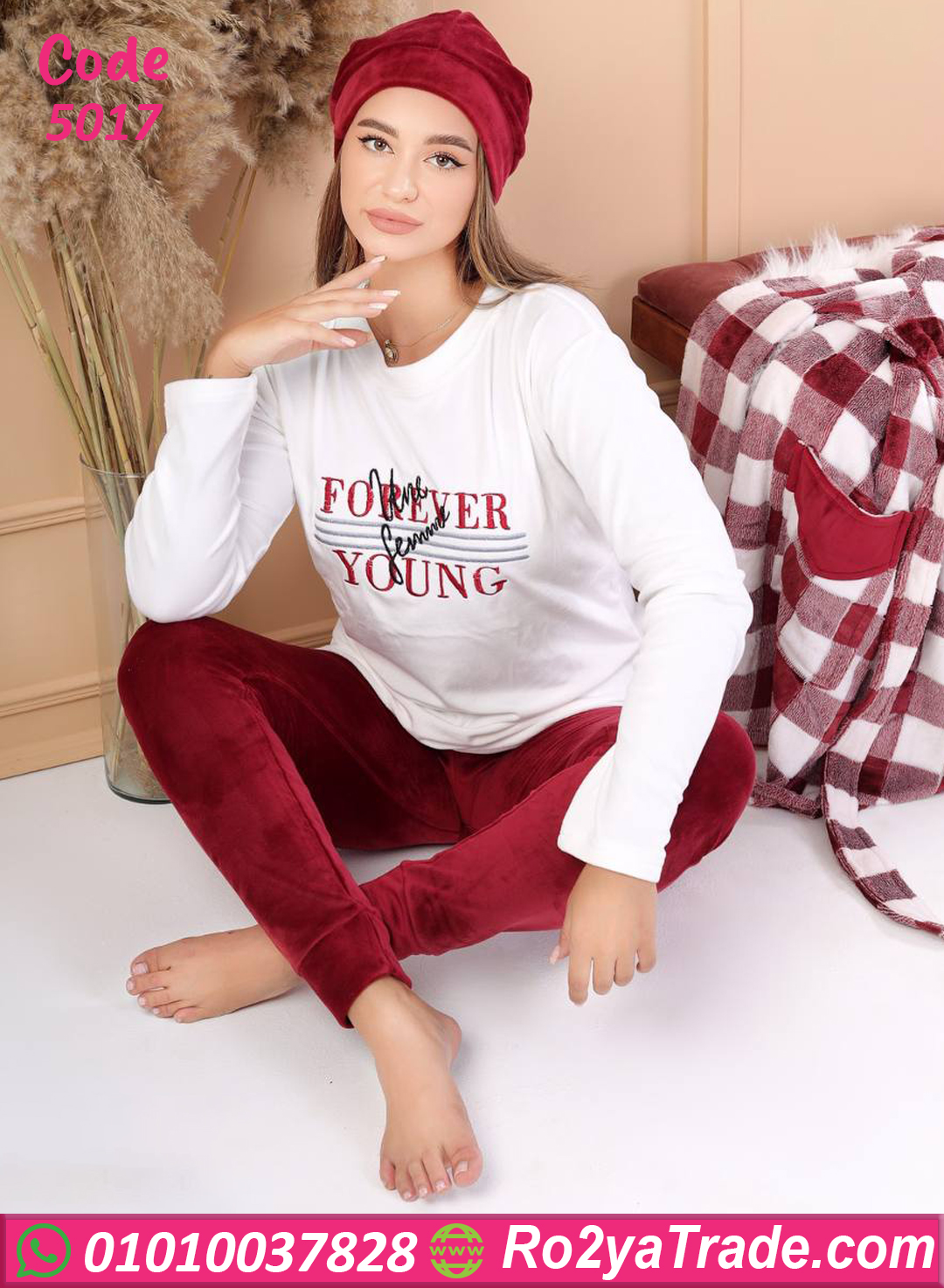 استمتعي بأجواء الشتاء بدفء وأناقة مع بيجامة MASS الجديدة. خامتها قطيفة ناعمة فخمة، التصميم مميز بنقشة كارو أحمر أبيض شيك جدًا، ومعاها روب بنفس النقشة وكاب بنفس الخامة يديكي لوك متكامل ومودرن. التيشيرت لونه أبيض مطبوع عليه “Forever Young” بخط أنيق، والبنطلون مريح برباط مطاطي عشان حرية الحركة. البيجامة مثالية للبيت أو السهرات العائلية، تجمع بين الراحة والشياكة في كل تفصيلة.