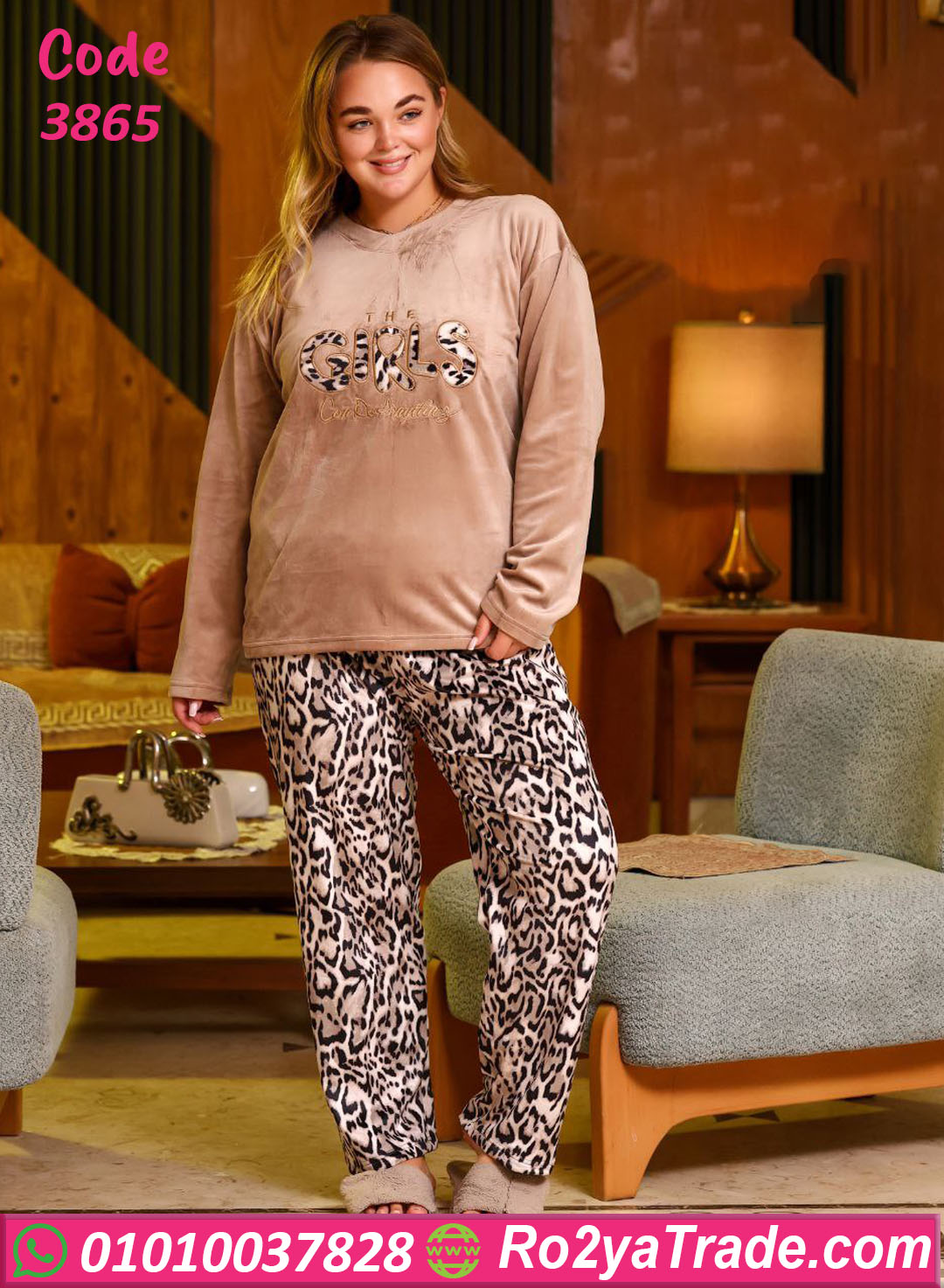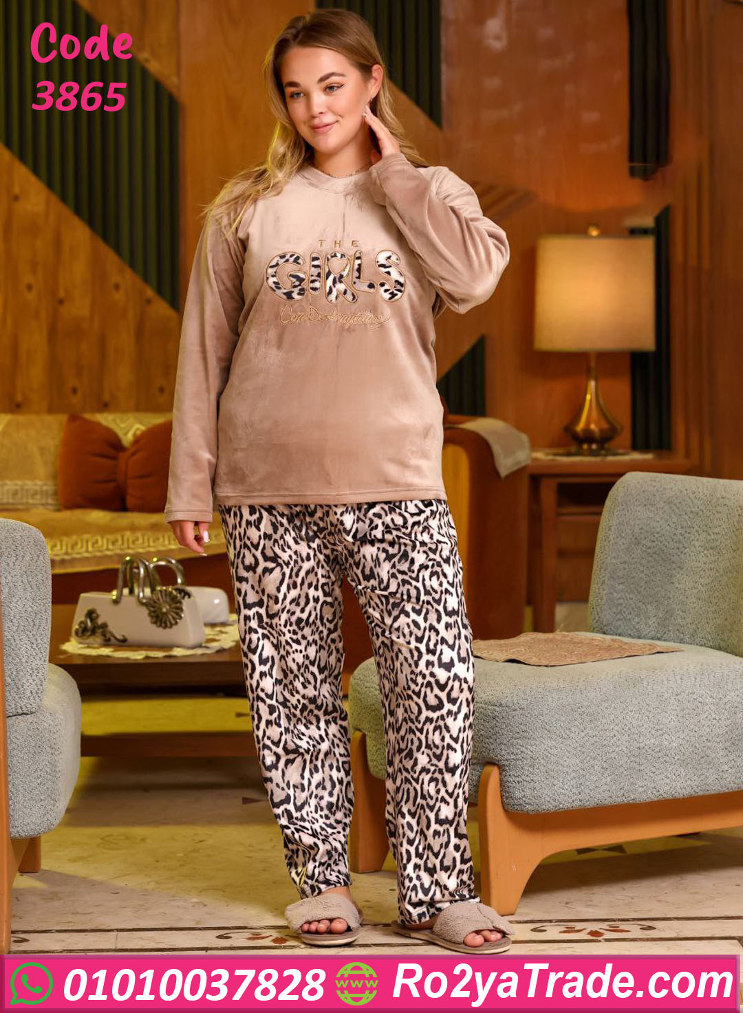 بيجامة شتوي قطيفة ناعمة جدا بلون بيچ شيك، مع بنطلون بنقشة ليوبارد مميزة ومقاس بيج سايز مريح للتلبيس الواسع.