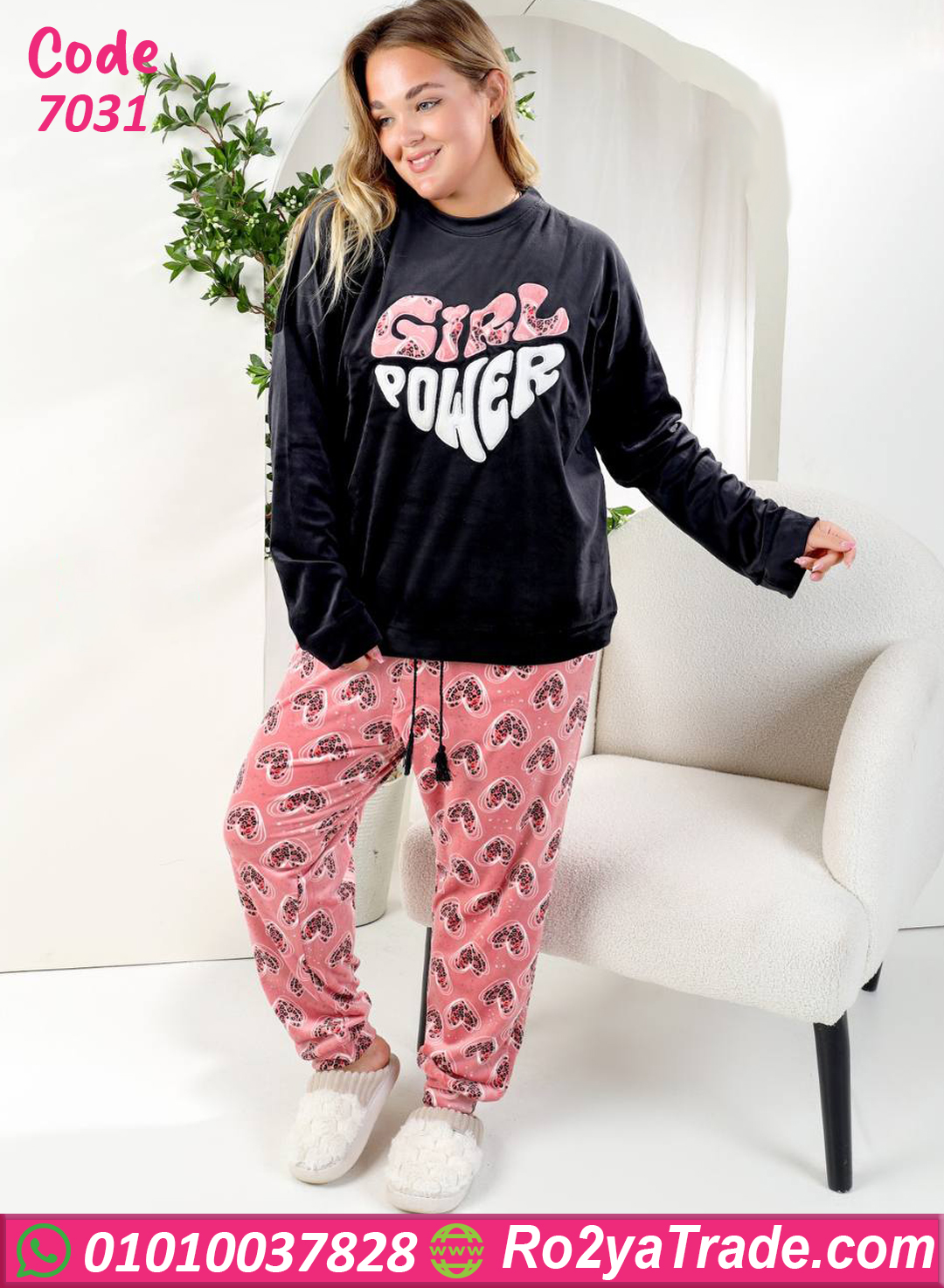 البيجامة مكوّنة من بلوزة قطيفة باللون الأسود الناعم مطبوع عليها “Girl Power” بتصميم شبابي عصري، مع بنطلون وردي منقوش قلوب بخامة مريحة جدًا ومرنة.