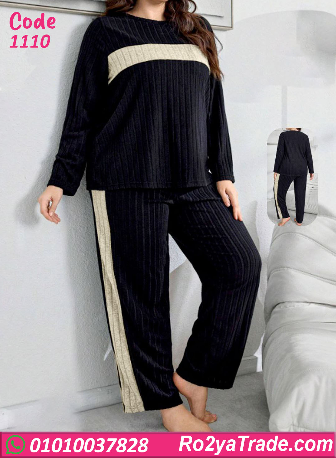 بيجامة شتوي حريمي بخامة ناعمة ومريحة، طقم مكوّن من بلوزة وبنطلون بتصميم عصري بخطوط مضلعة ولمسة لون مختلفة على الصدر، مناسبة للّبس البيتي والراحة اليومية مع إحساس دفا مريح.