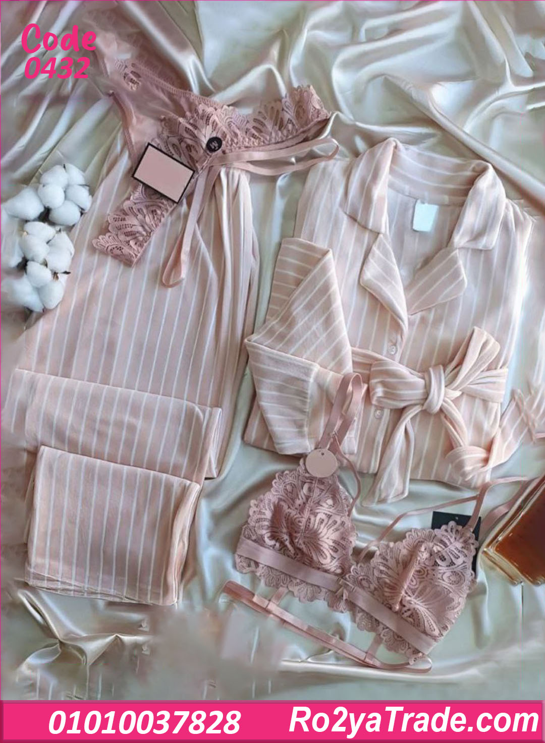 بيجامة شتوي حريمي مخططة مع طقم داخلي دانتيل – كود 0432