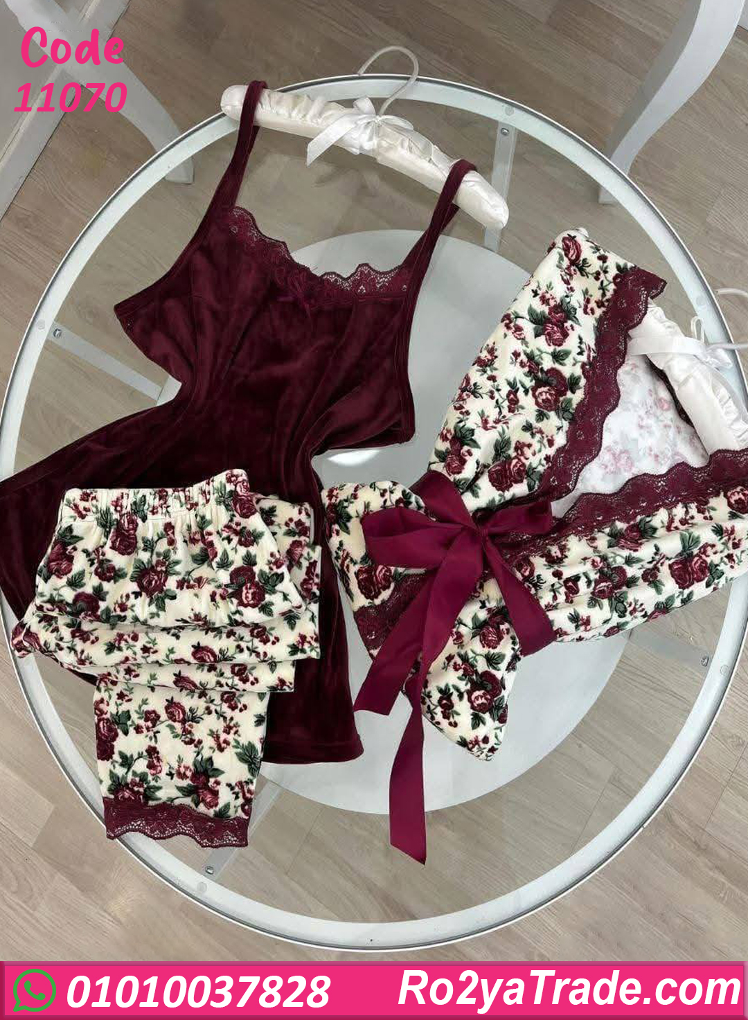 بيجامة شتوي حريمي مكوّنة من توب بحمالة وبنطلون قصير ومعاهم روب أنيق، ألوان خمري مع نقشة ورد ناعمة وتفاصيل دانتيل بتدي لمسة فخامة وأنوثة.