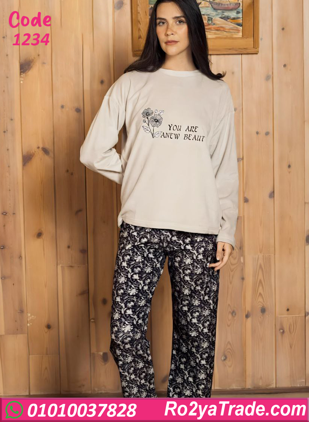 بيجامة شتوي حريمي موديل 1234 اختيار ممتاز لكل بنت ستايلها هادي وعملي في نفس الوقت. البيجامة مكونة من قطعتين، بلوزة شتوي كم طويل بطباعة رقيقة مع بنطلون مريح بنقشة أنيقة تناسب الذوق العصري.