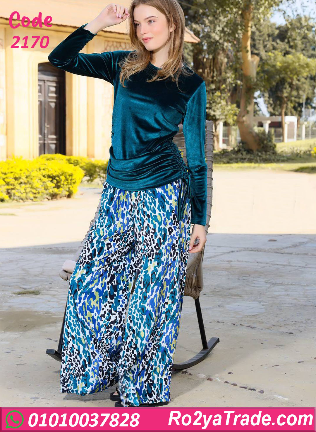 التصميم مكوّن من بلوزة كم طويل خامة ناعمة بقصة جانبية مجمّعة بتدي لمسة أنثوية، مع بنطلون مطبوع ستايل عصري وواسع يدي حرية حركة كاملة