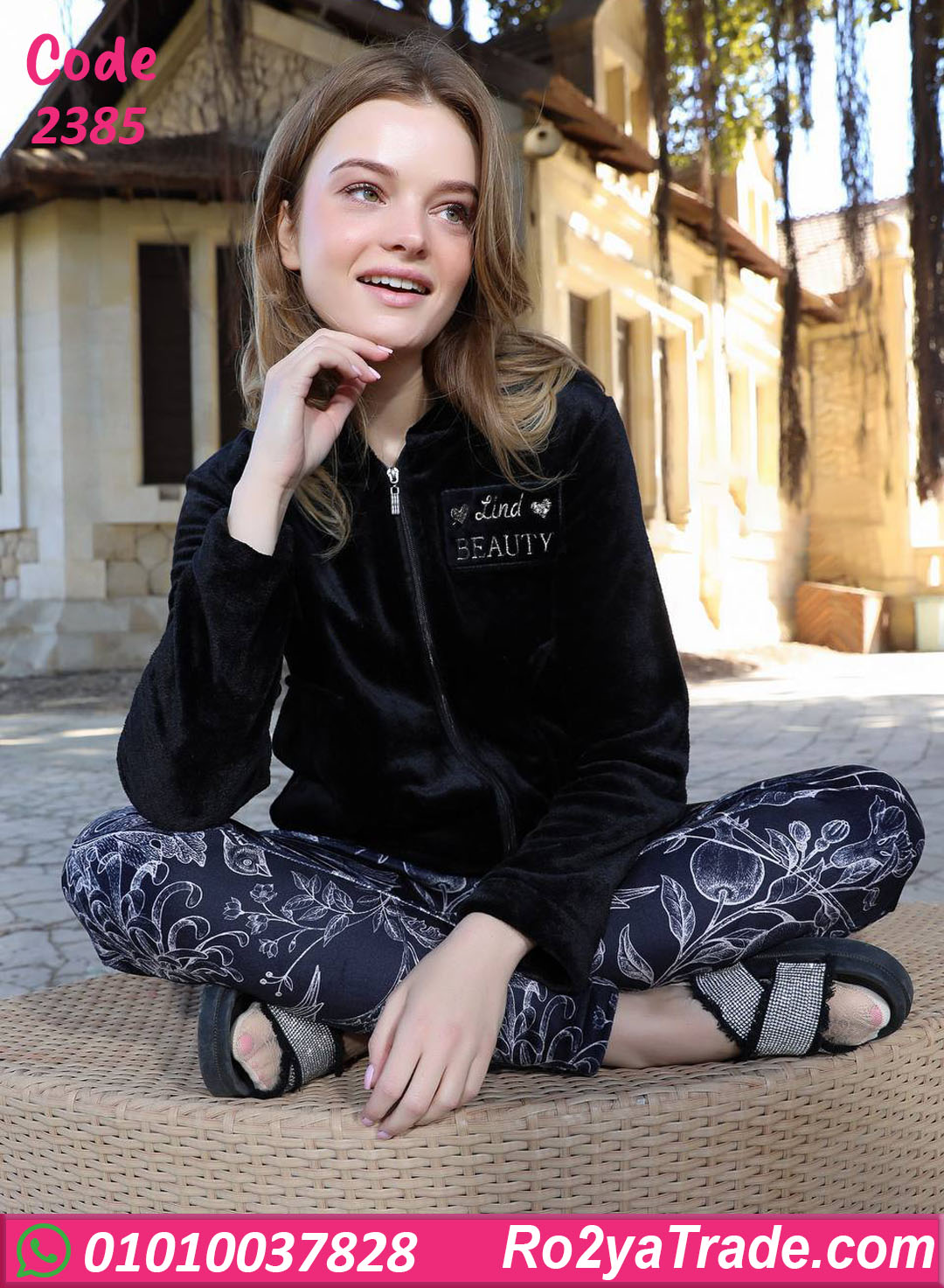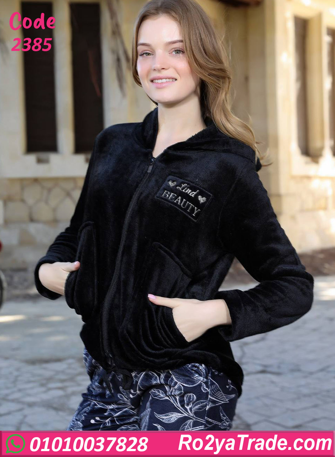 بيجامة شتوي حريمي موديل 2385 اختيار مثالي لكل ست بتدور على الراحة مع شكل عصري. التصميم مكوّن من جاكيت قطيفة بسوستة وكم طويل مع قبعة وجيوب جانبية